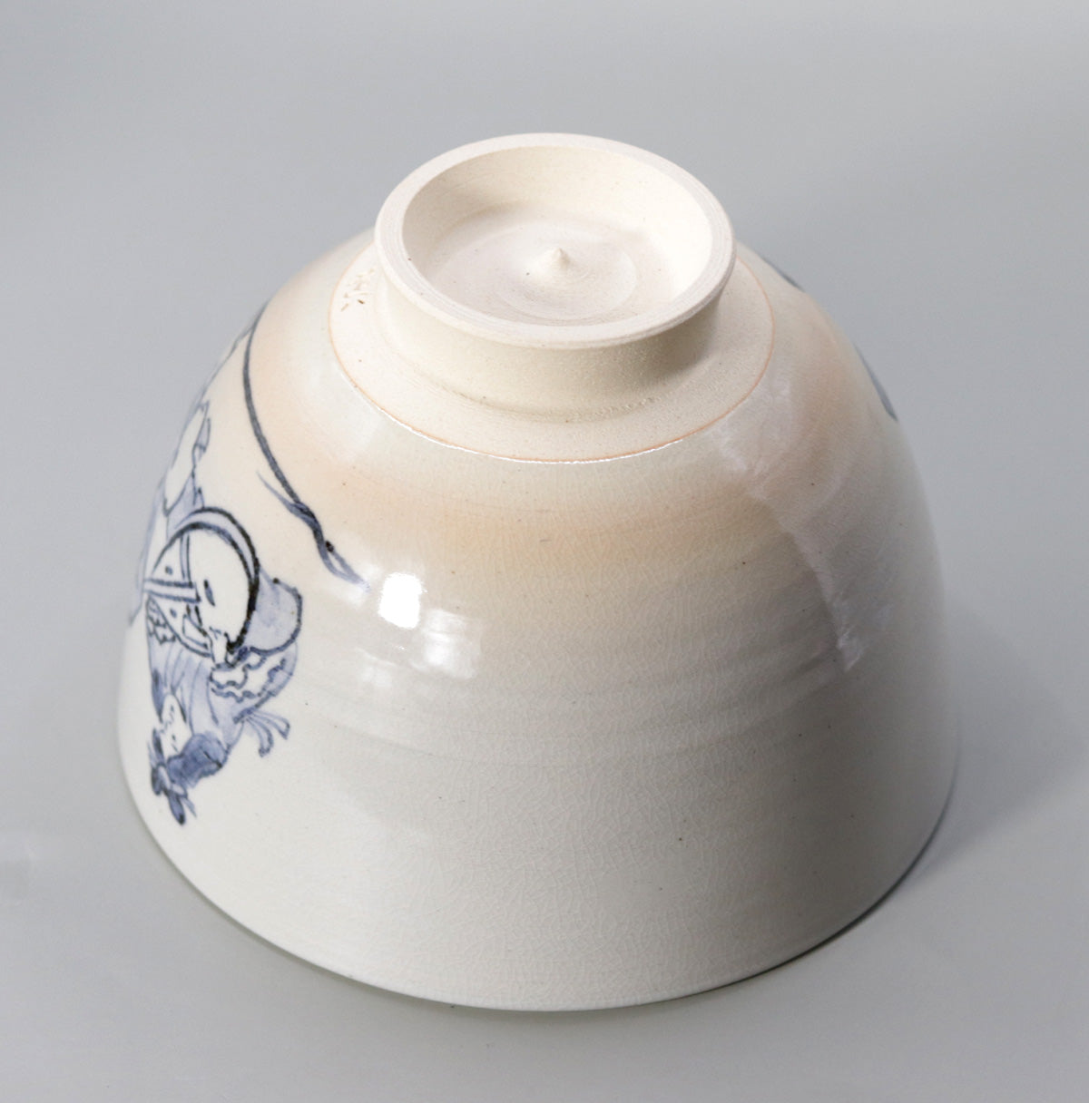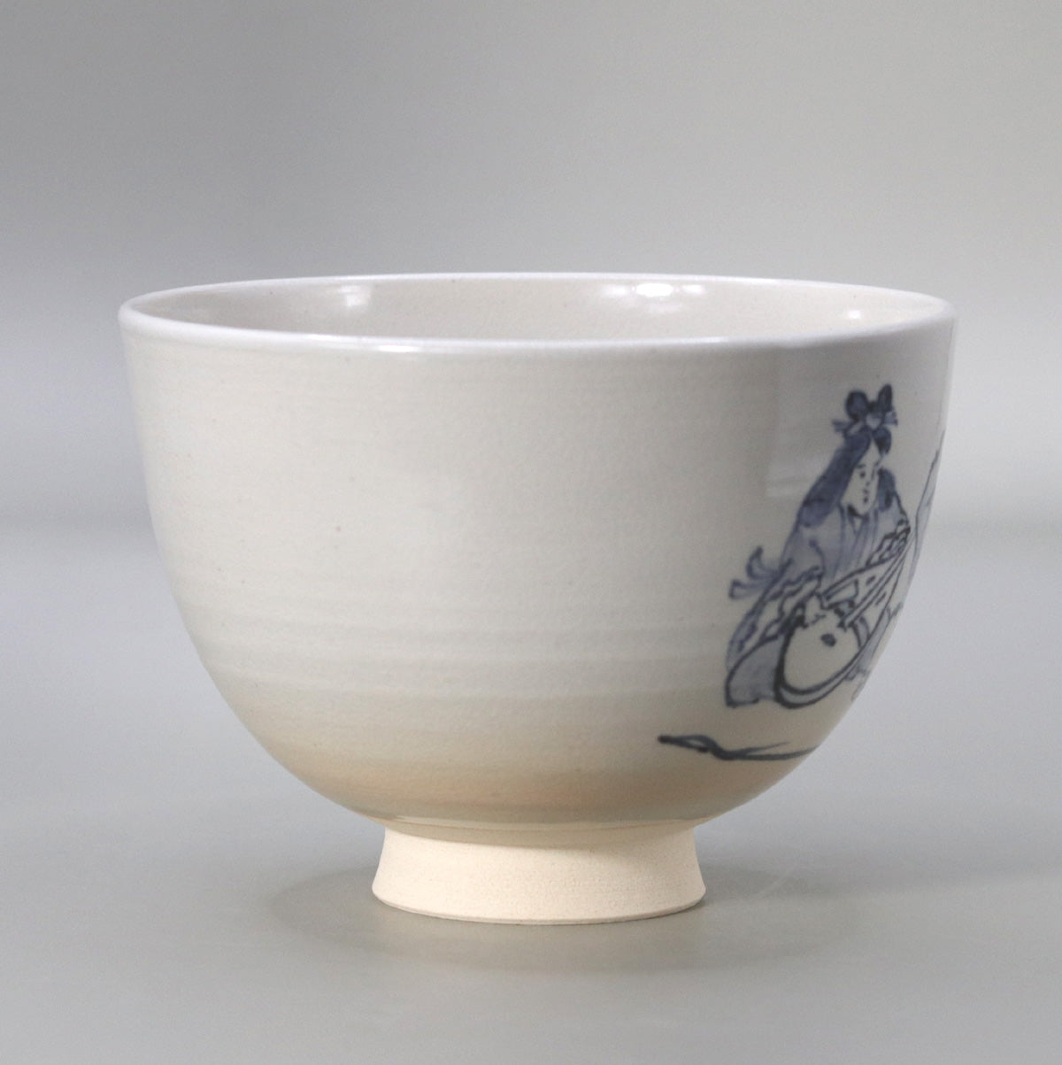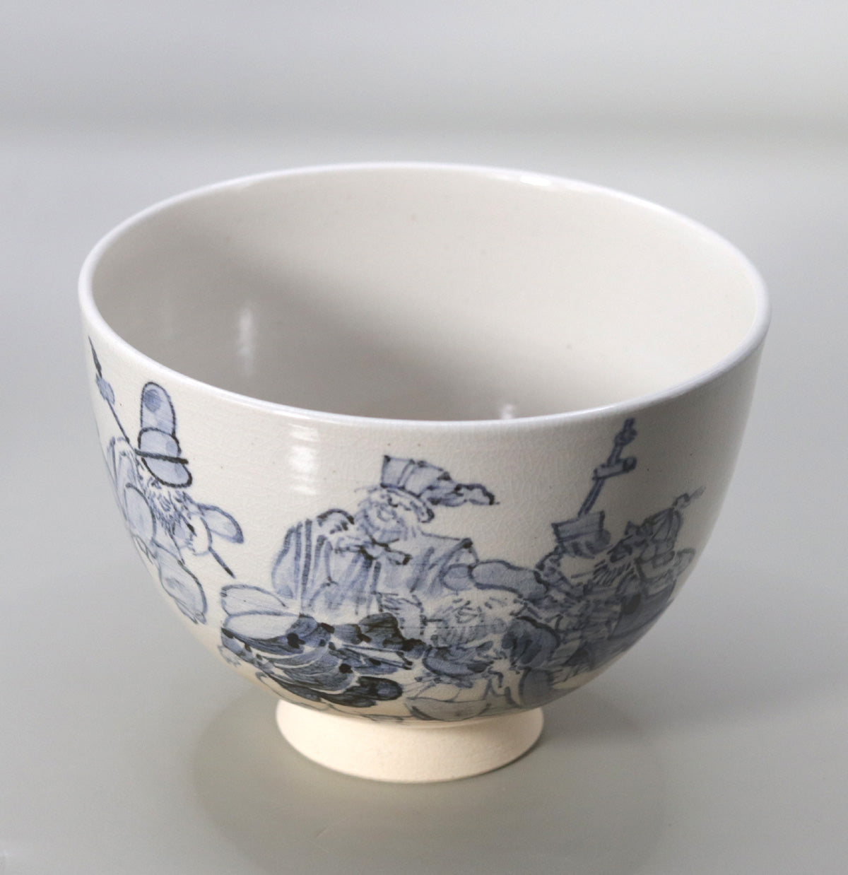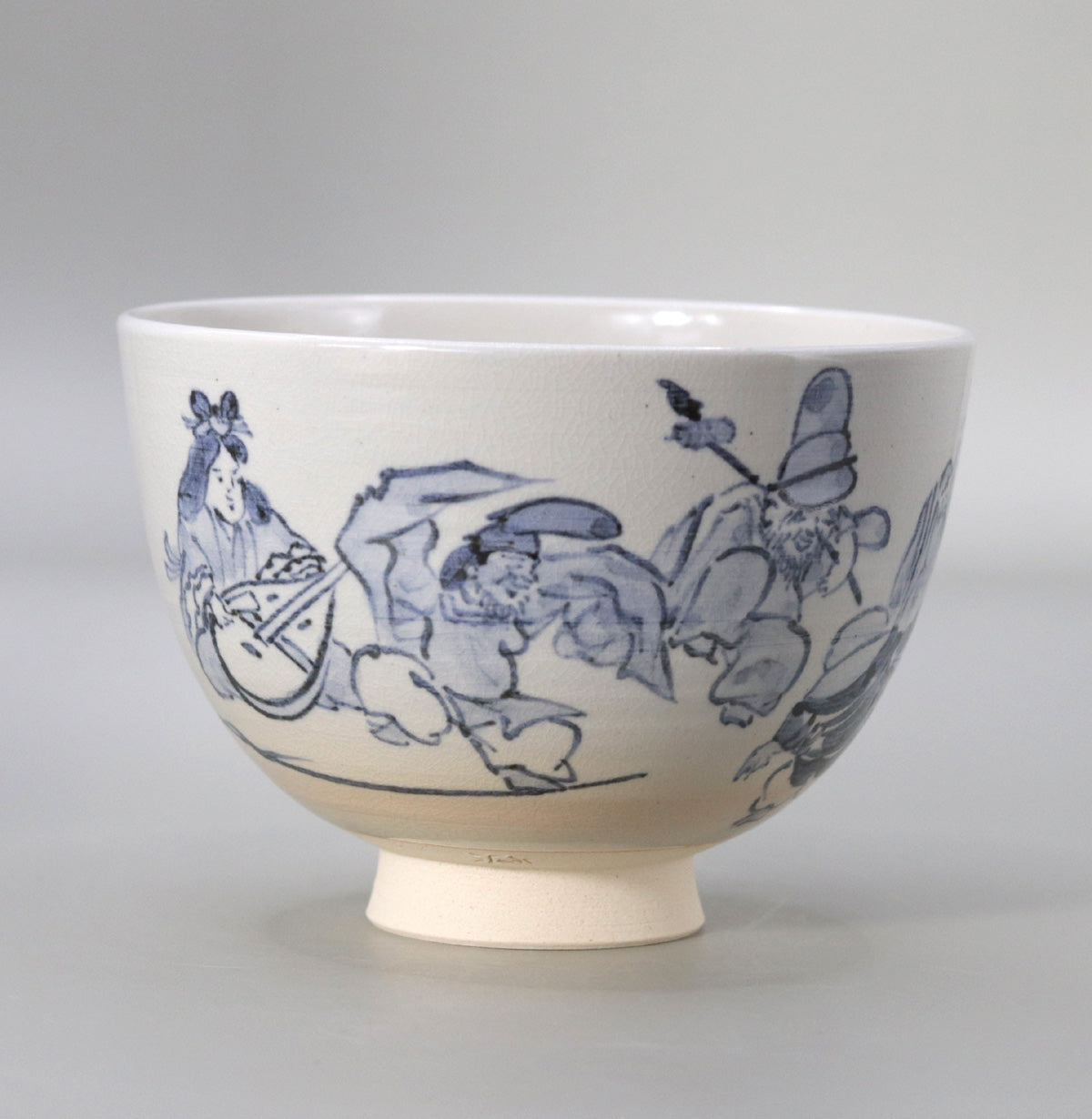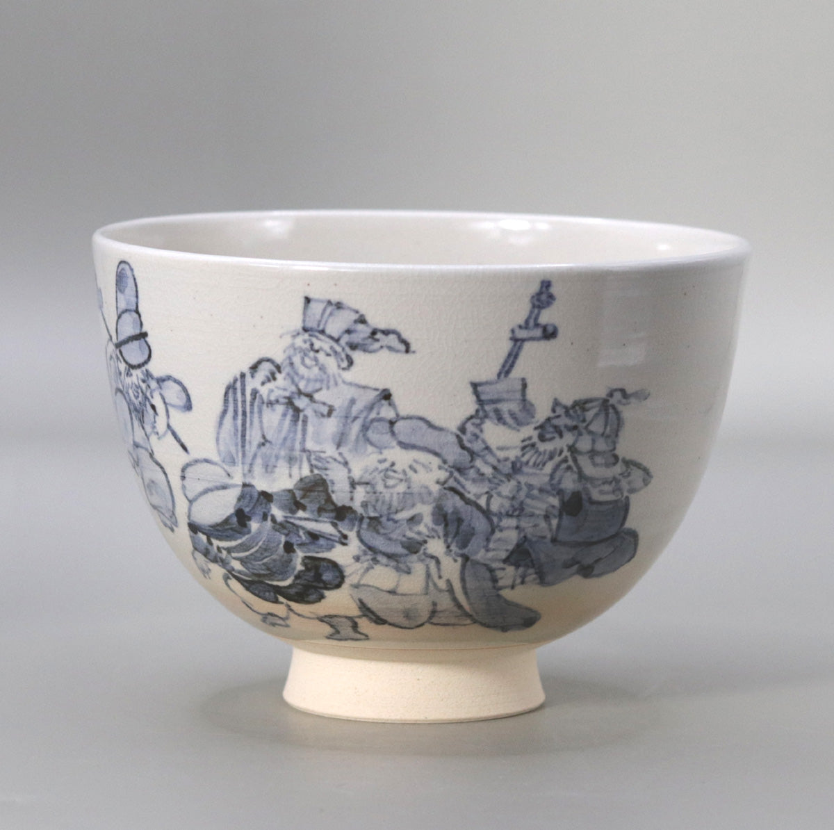 The line drawing that goes around the torso is a "procession picture" of the seven gods Ebisu, Daikokuten, Bishamonten, Benzaiten, Fukurokuju, Jurojin, and Hotei, drawn with light brushstrokes. Benzaiten is holding a biwa, suggesting a scene of entertainment. Daikokuten has a broad smile on his face, and Hotei is charmingly holding a lucky bag - each of them work together in dynamic poses to create a story like an unrolled picture scroll. The pale gosu shading gives a soft depth to the clothing and shadows, and the decoration is deliberately kept to a minimum on the inside, so that the outer picture emerges even more clearly when the green of the matcha is poured in.