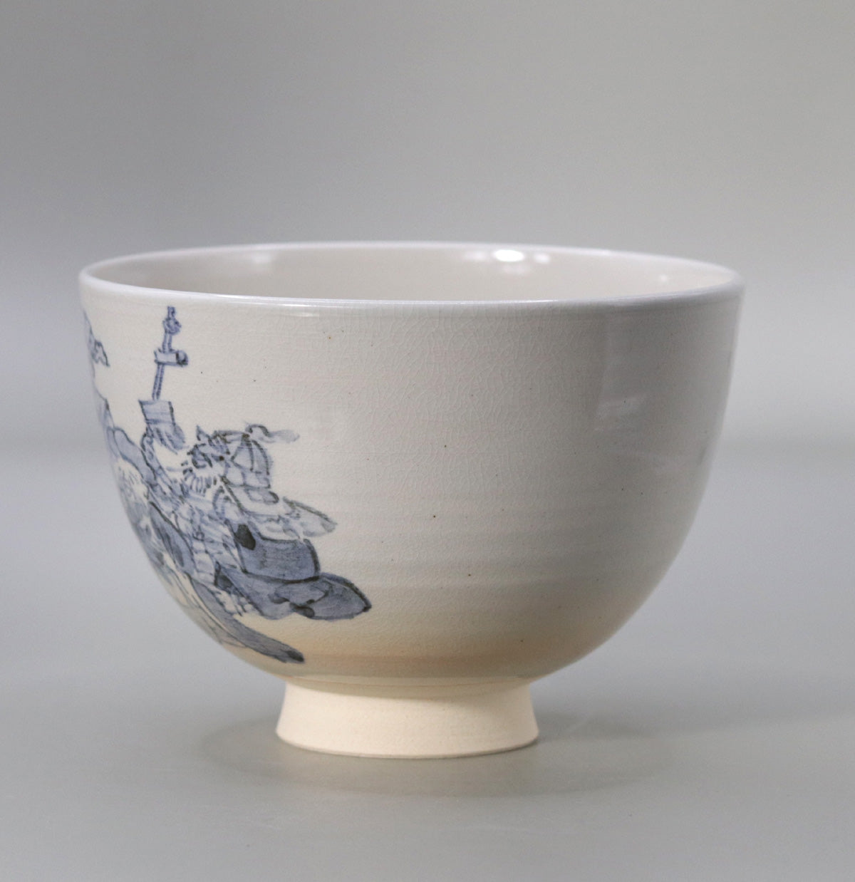 The blue of the gosu glaze dances as if it is swimming in the ash glaze , and this piece, which condenses the festive feeling of the Seven Lucky Gods into a small bowl, has the power to gently brighten up any setting, whether it is used for a New Year's tea ceremony or for everyday practice. The lightness of the handle, the stability of the foot, and the aging of the crazing - all of these will become more and more appealing the longer you use it. Please use it for many years to come and enjoy the story of good fortune depicted by Takahashi Michihachi with every sip.