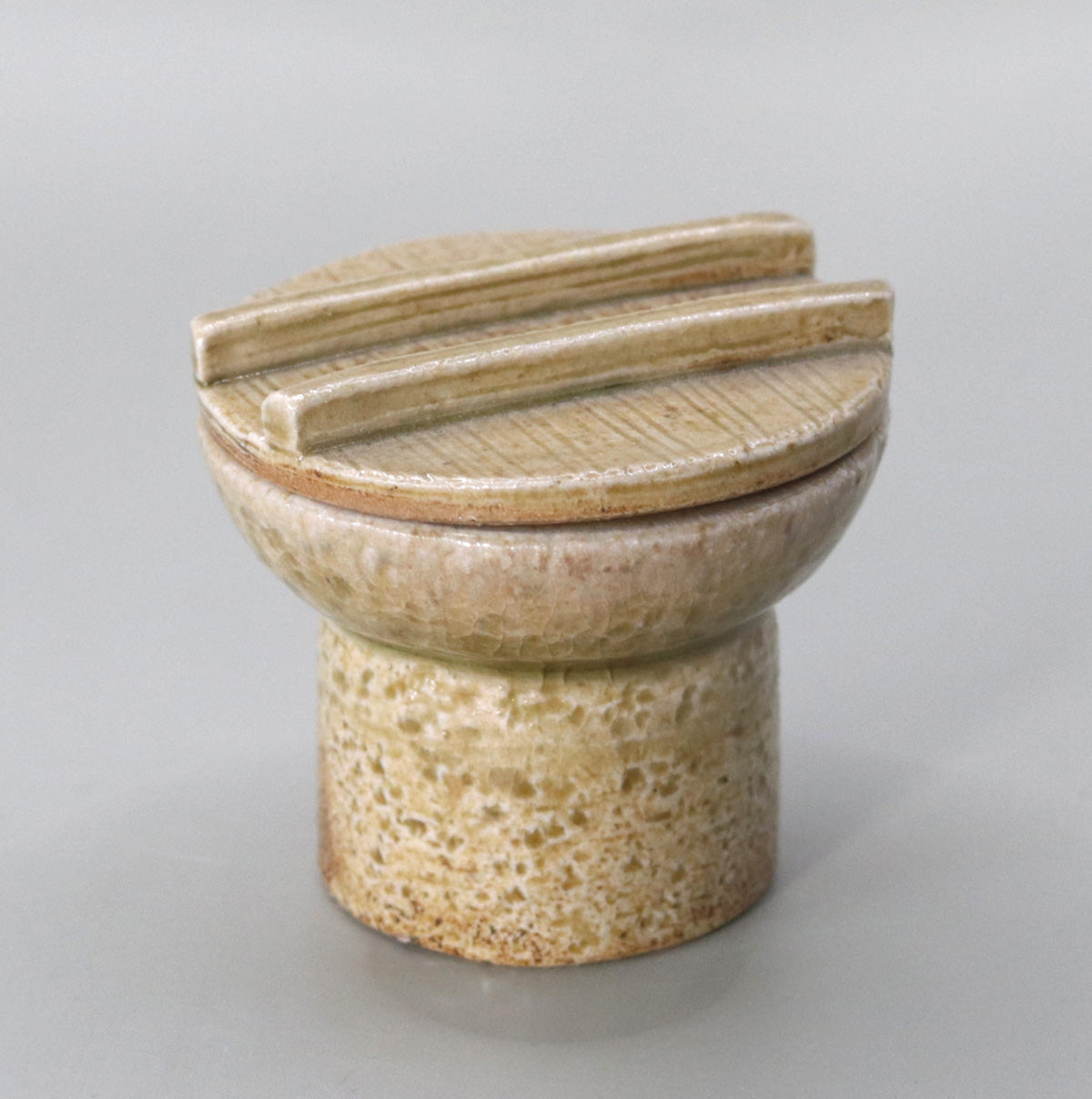 | Upper stone (lid) | The stone is engraved with radial lines and has two grooves running down the center. | The lines reminiscent of the teeth of a tea mortar create shadows in the soft glaze layer and give the fingertips a pleasant feel. |