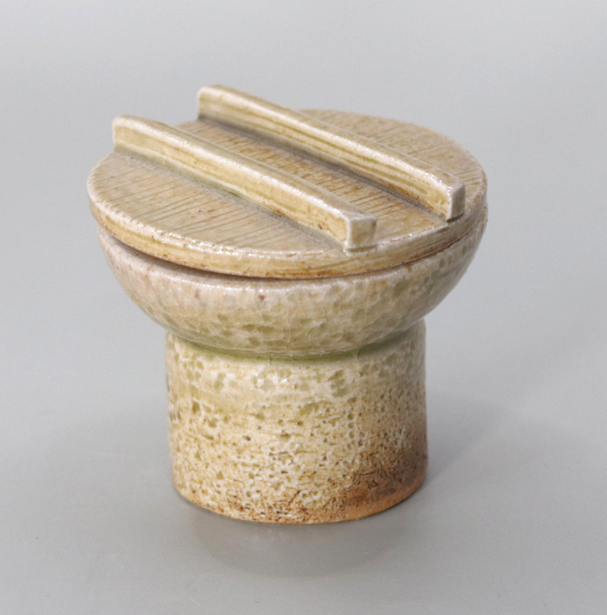 A glaze made mainly of feldspar and wood ash is applied over the entire surface, and the piece is reduced and fired at around 1240 degrees Celsius to produce a soft honey color. The crazing that occurred during firing creates a fine mesh pattern, reminiscent of the rough surface of a millstone.