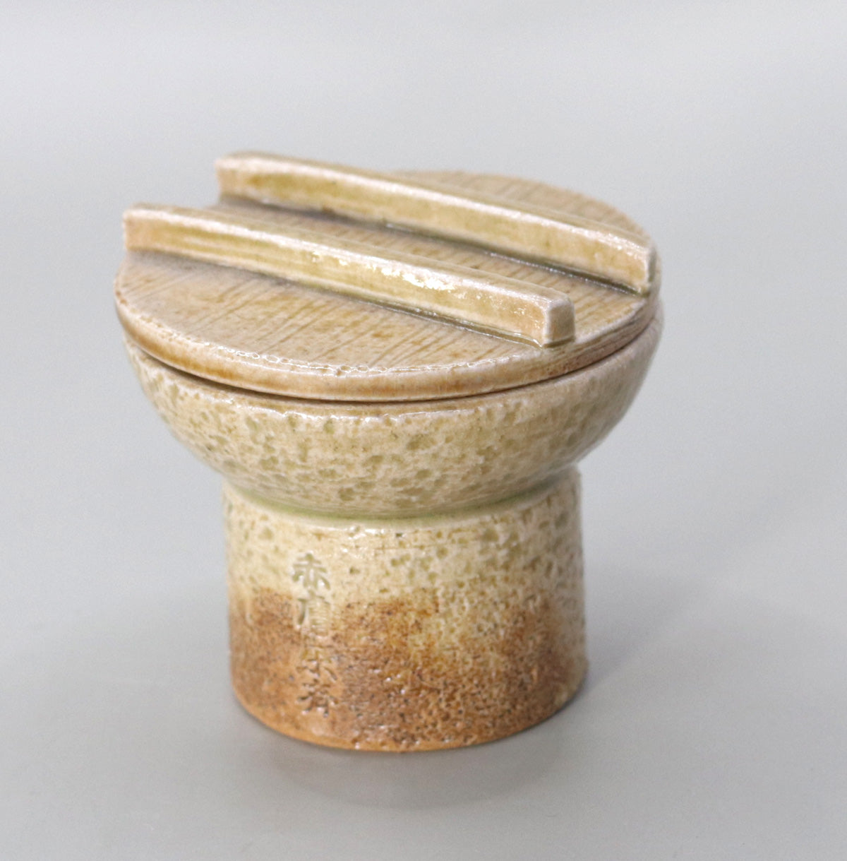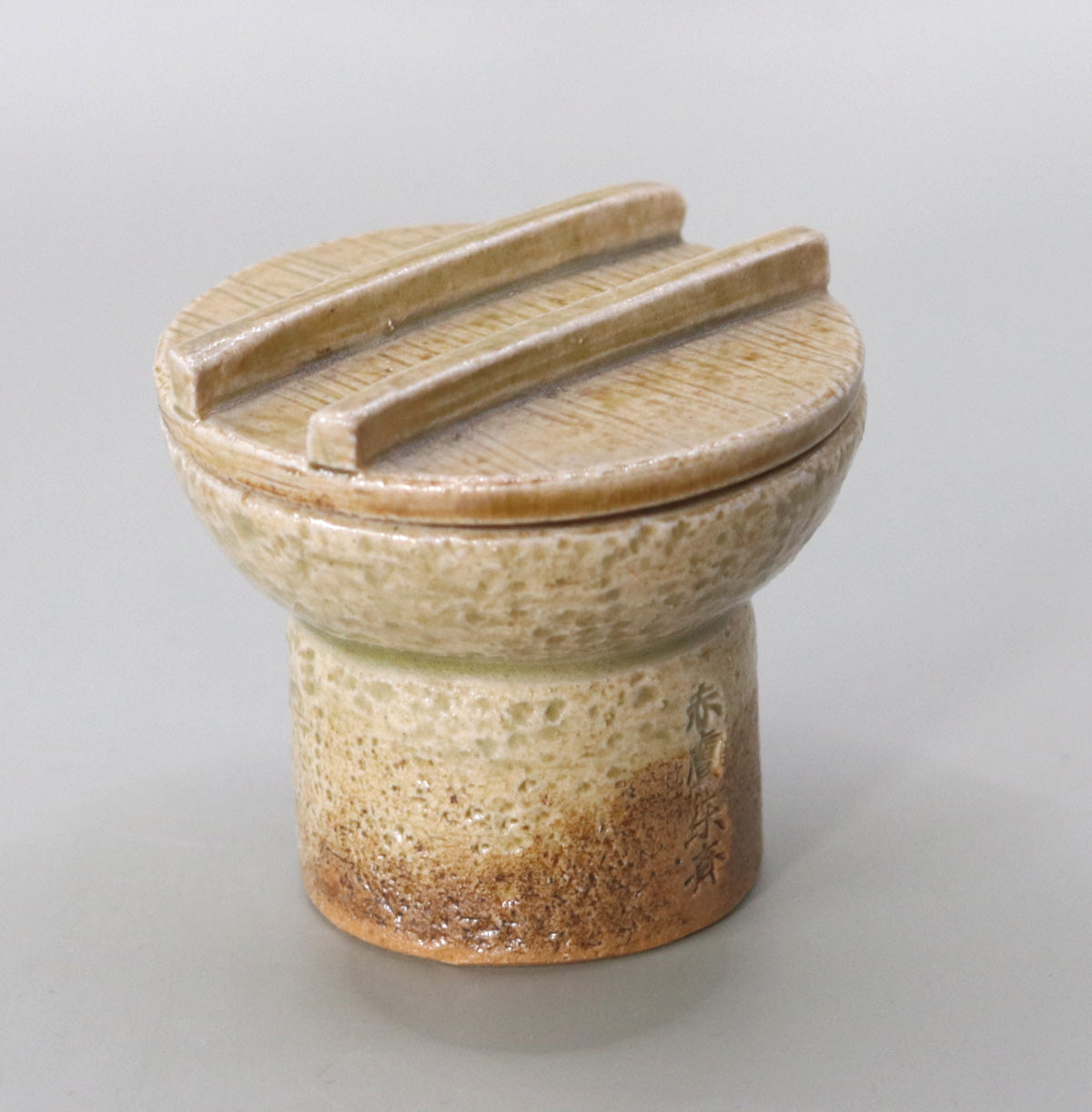 This is a millstone-shaped incense container made by Akahada-yaki maker Onishi Rakusai of Yatsushiro, Nara. Although it is a small piece measuring approximately 6.4 cm in diameter and 6 cm in height, it faithfully replicates the three-layered structure of a millstone, consisting of an upper stone, a lower stone, and a base, with the upper stone acting as a wooden lid to hold incense paste and pieces of aloeswood.