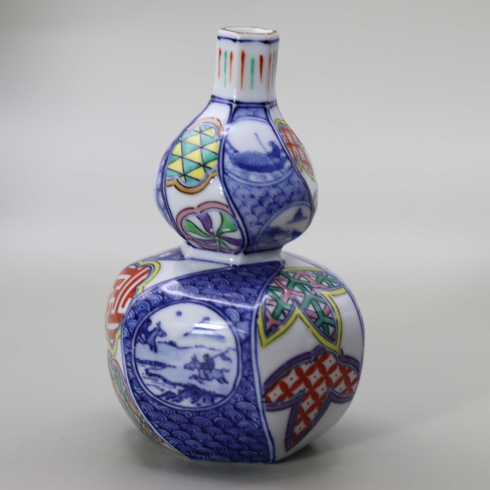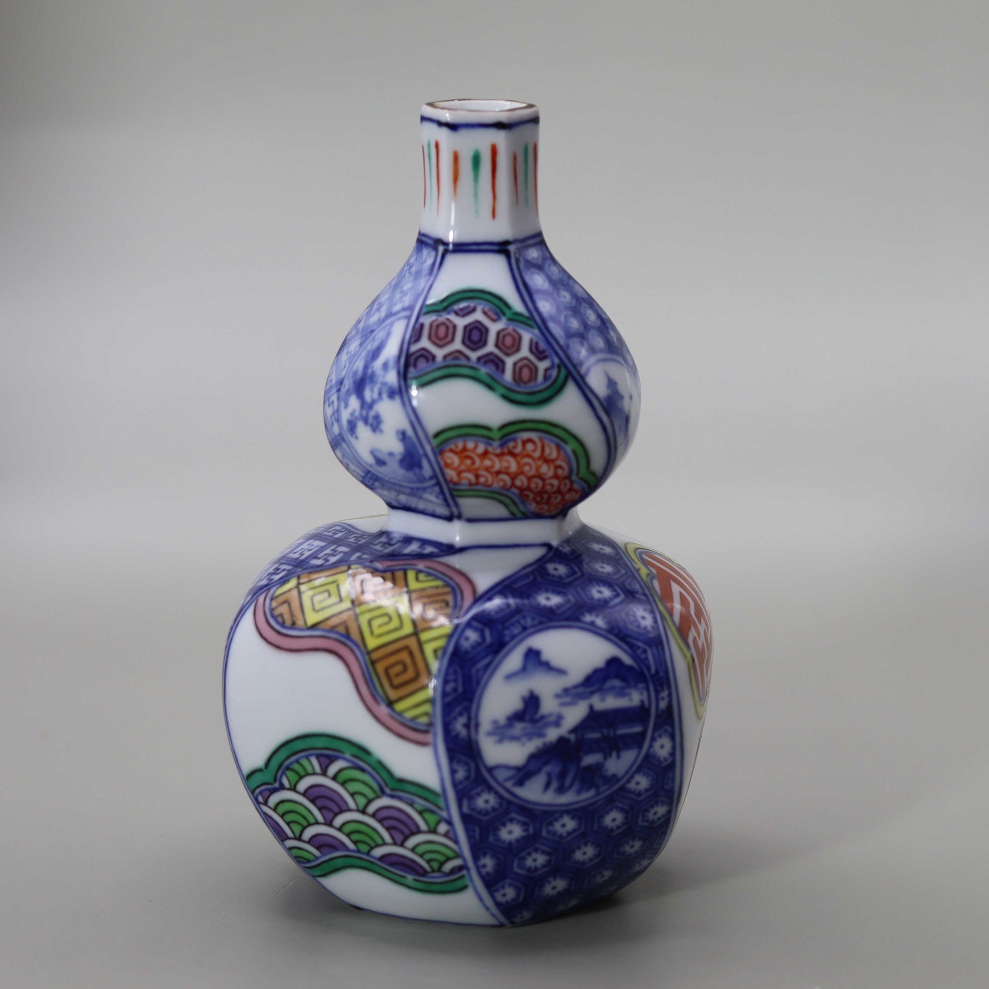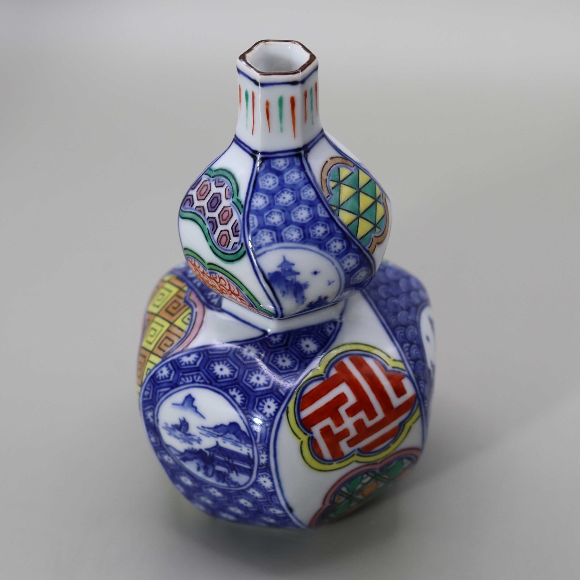 Among Kyoto ware, Makuzu ware is known for being a pottery with a particularly rich variety of techniques, including Ninsei copy, Kenzan copy, overglaze painting, blue and white porcelain, iron painting, and gold lining. Miyagawa Kosai has used these techniques to create a wide variety of works that are in tune with the times. In particular, this "Iroe Shozui Shochiku Ume Tokkuri" is a masterpiece that harmonizes the various techniques of Makuzu ware, and is an elegant piece that combines the delicacy of the color painting with the elegance of the blue and white porcelain.