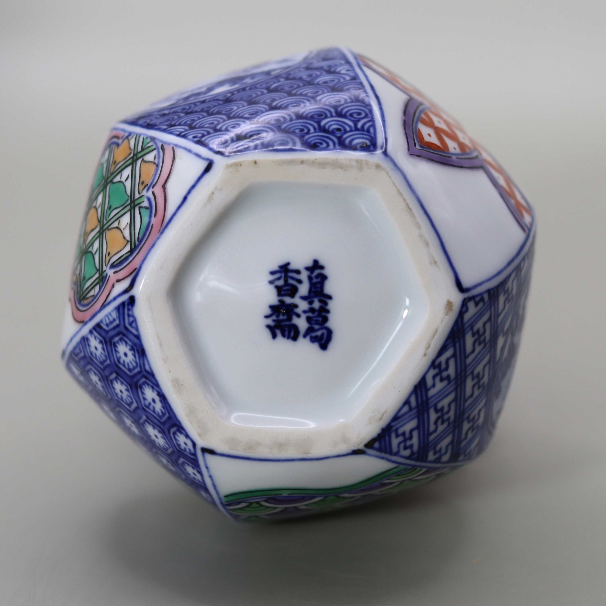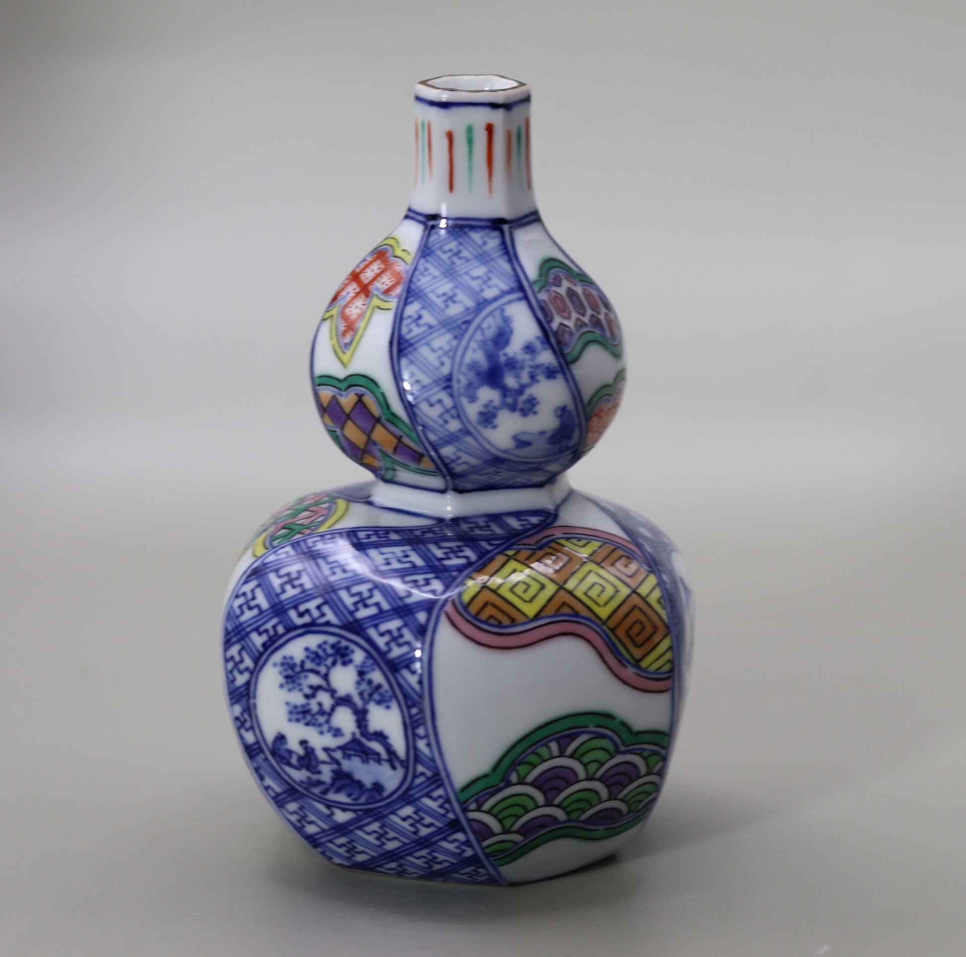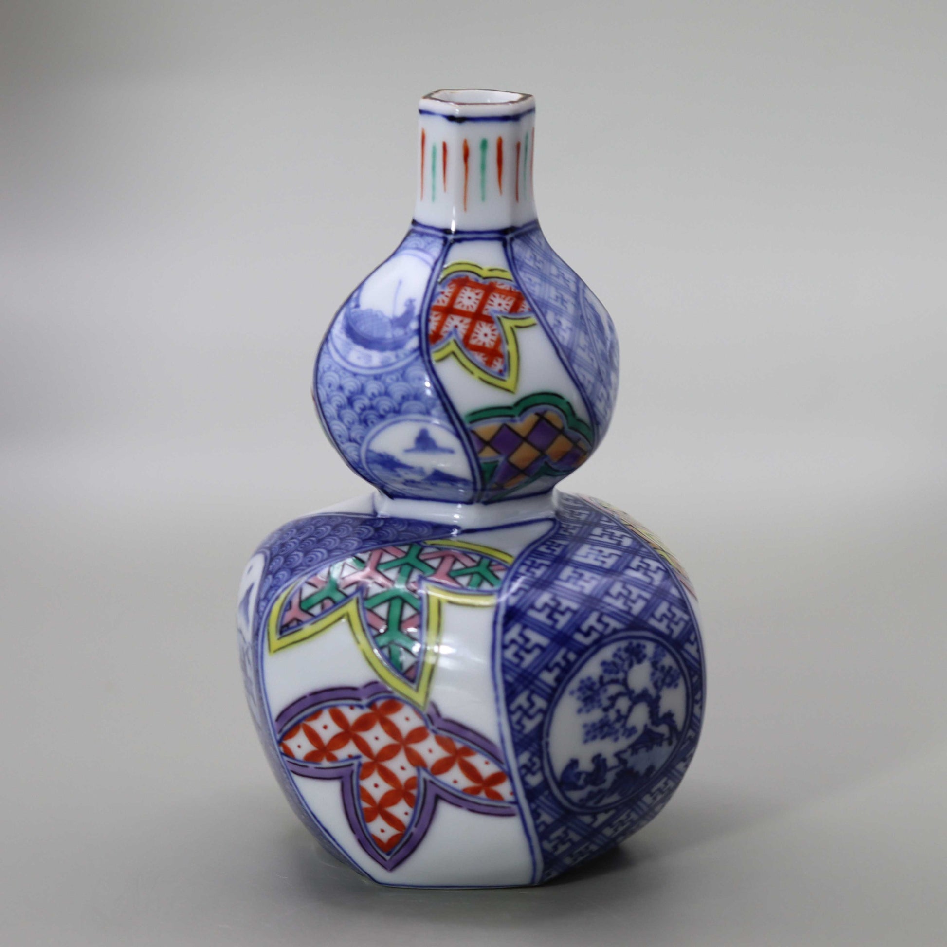 Among Kyoto ware, Makuzu ware is known for being a pottery with a particularly rich variety of techniques, including Ninsei copy, Kenzan copy, overglaze painting, blue and white porcelain, iron painting, and gold lining. Miyagawa Kosai has used these techniques to create a wide variety of works that are in tune with the times. In particular, this "Iroe Shozui Shochiku Ume Tokkuri" is a masterpiece that harmonizes the various techniques of Makuzu ware, and is an elegant piece that combines the delicacy of the color painting with the elegance of the blue and white porcelain.