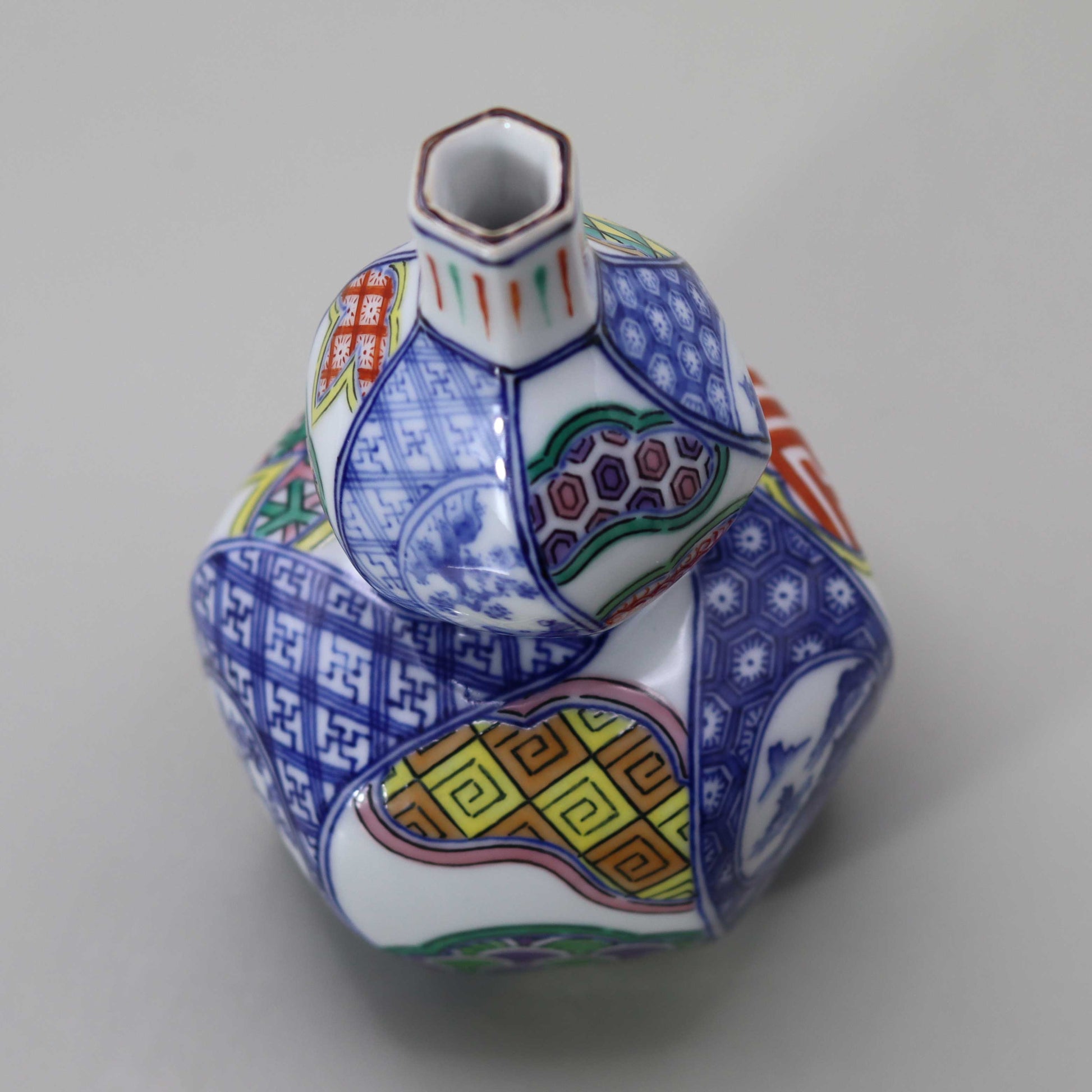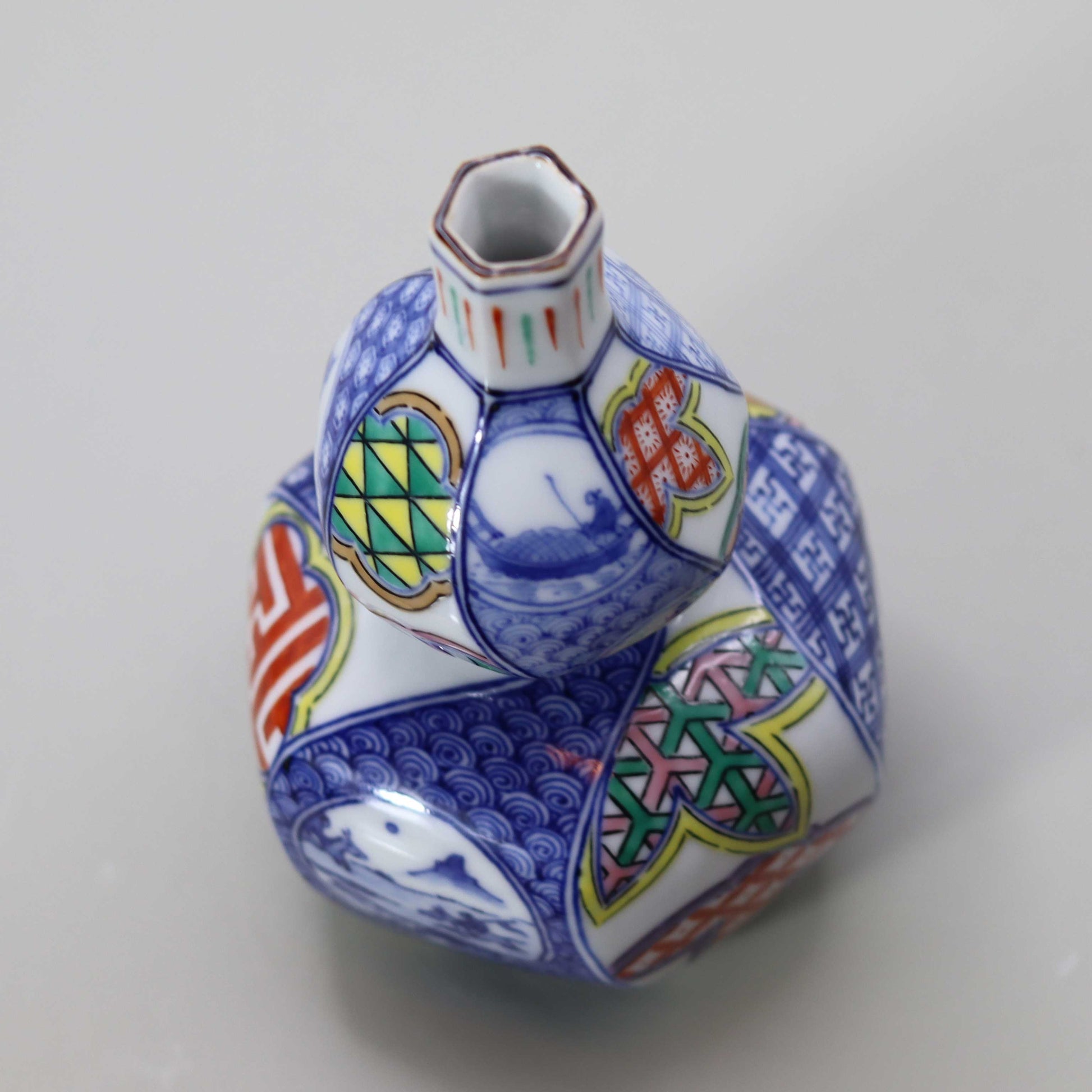 Tokkuri is a traditional sake vessel used to pour sake, which is said to have first appeared in the latter half of the Muromachi period. There are several theories about the origin of the word tokkuri, including the Korean word "dokkuru" (a sake jar) and the sound of "tok tok" made when pouring sake. This "Colored Auspicious Pine, Bamboo, and Plum Tokkuri" has particularly outstanding beauty of form and design among tokkuri, and exudes a gentle and elegant atmosphere. The flow created by its shape when pouring sake and the beautiful design that emerges every time sake is poured add a touch of elegance to a drinking party.