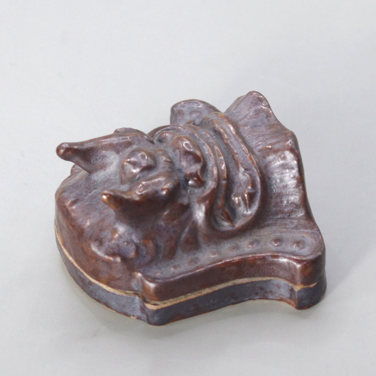 This is a tile-shaped incense container made by the master of Akahada ware from Nara, Onishiro Rakusai . The cross section of the tile protecting the ridge of the roof is condensed to about 7 cm square, and the upper tile is the lid, while the base is the body, making it a two-part structure that can hold incense and pieces of aloeswood. The rough iron-brown glaze has purple-brown kiln changes running through it, and its appeal is reminiscent of the surface of a tile that has been exposed to the wind and rain for many years.