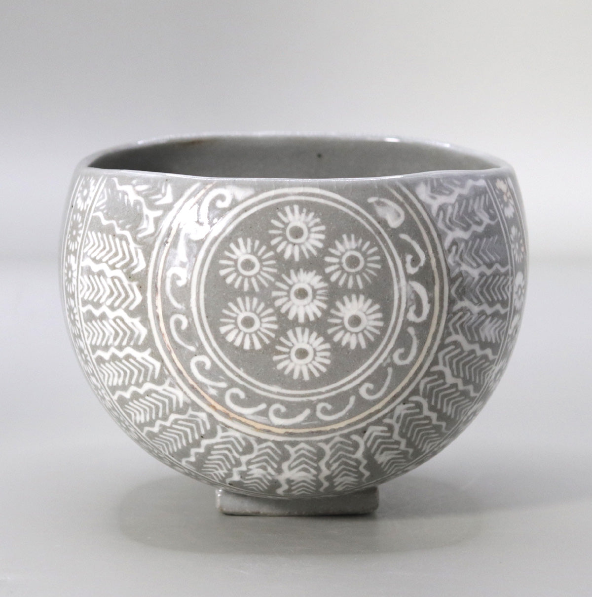 This tea bowl, with its tranquility of the gray-blue glaze and the neat pattern of the white inlay, combines the familiarity and elegance that only a rice bag-shaped bowl can offer. When you hold it in your hand, the slight unevenness of the glaze surface and the unevenness of the inlay will pleasantly stimulate your fingertips, and you can enjoy the view of the color deepening into a craze with each tea you make. It can be used not only for tea ceremonies such as "Kuchikiri" in early spring and "Nagori" in autumn, but also for everyday practice, as the contrast between the gray-blue and white will vividly bring out the green of the matcha and tighten the atmosphere of the tea room. Please enjoy this bowl for many years to come, and appreciate the outstanding skill of Takahashi Michihachi and the elegance of Mishima's style.
