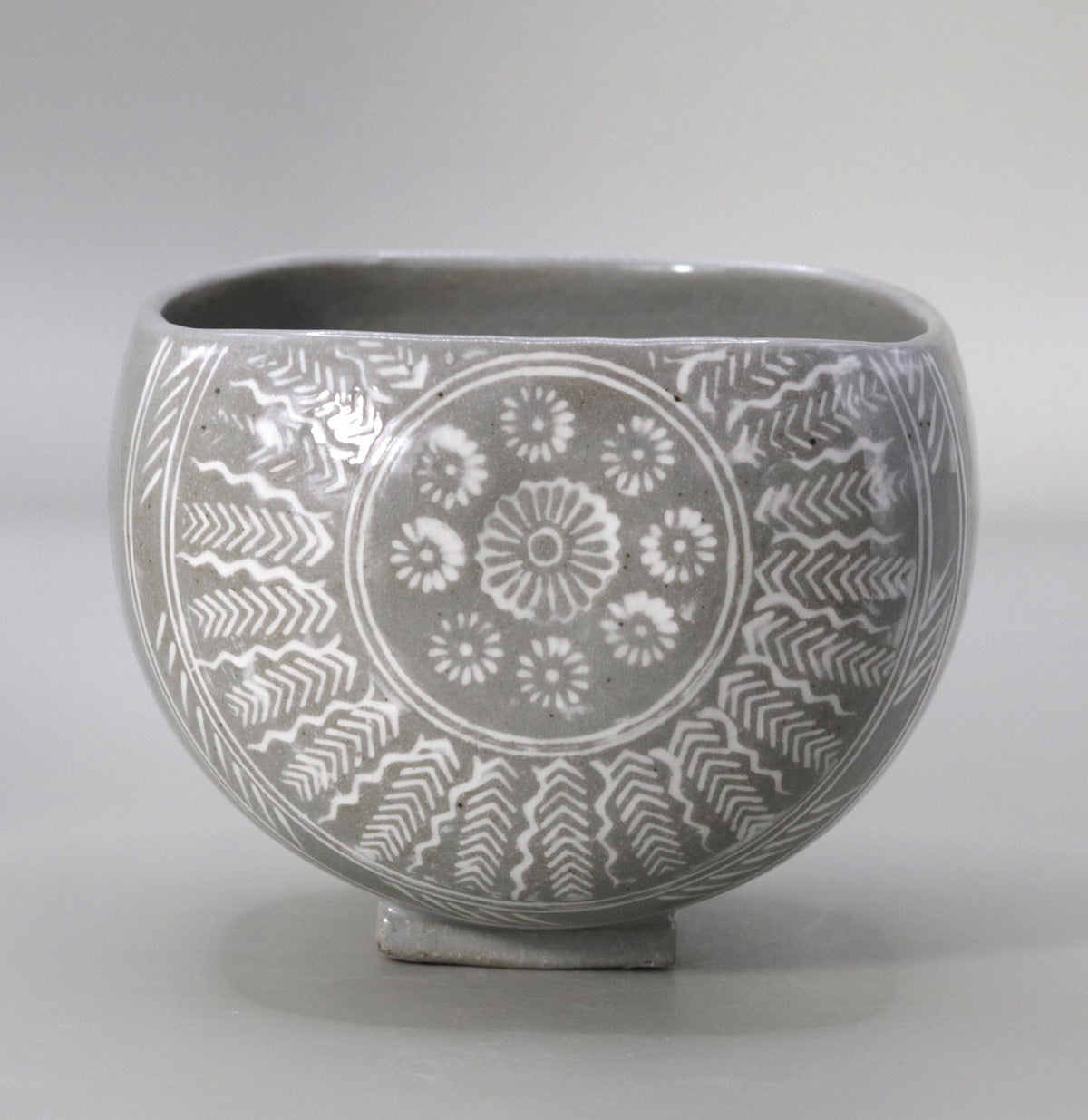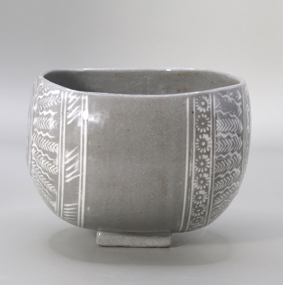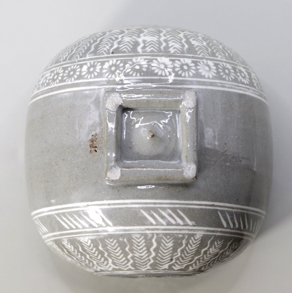 Mishima-te originates from 15th-century Korean Buncheong ware, and copying became popular in Japan from the 16th century onwards. This piece is made using the traditional process of combining stamping and inlay after careful wheel-throwing , and finally applying ash glaze and firing in reduction. While Dohachi is famous for his Kyoto ware overglaze paintings, he is also well versed in works that make use of these earthenware and techniques, and while maintaining the rough texture unique to Mishima, he has finished the details with the neatness that is characteristic of Kyoto ware.
