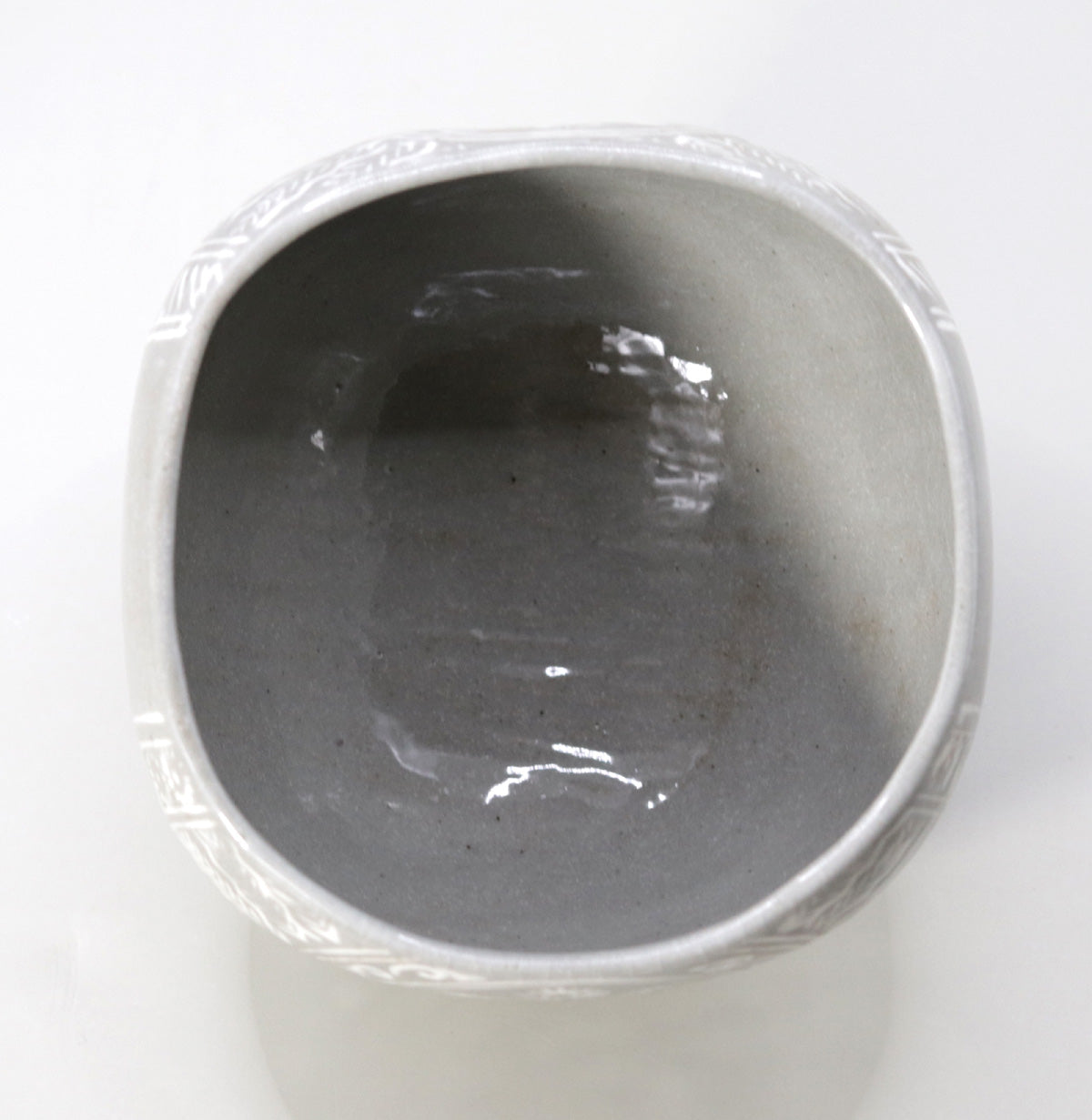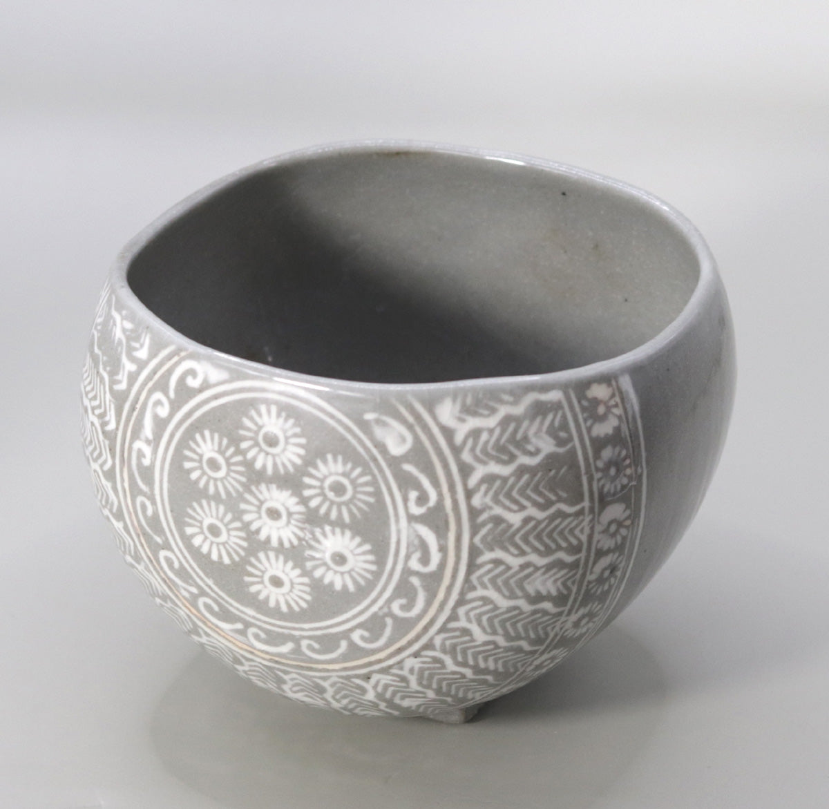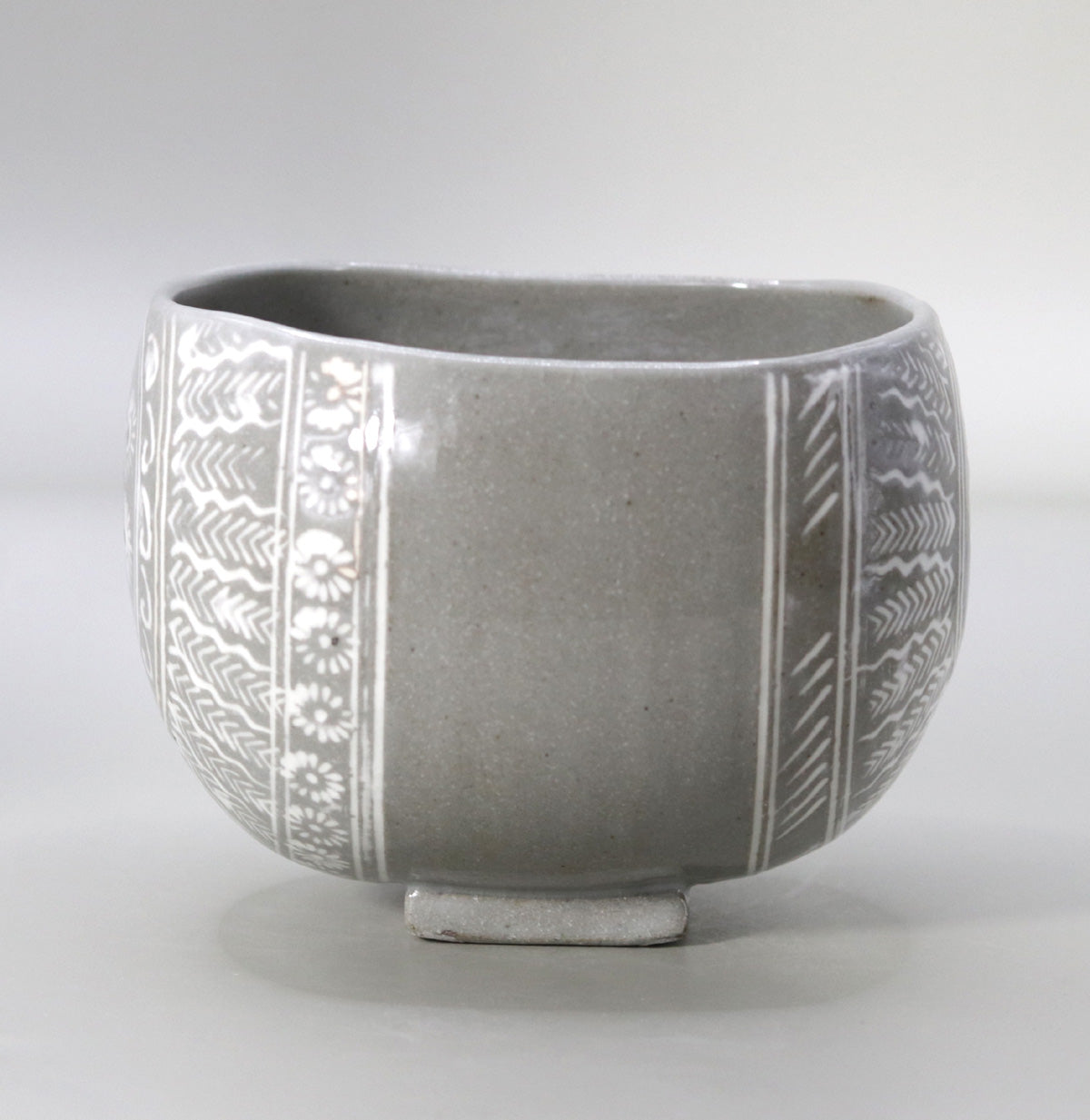 Mishima-te originates from 15th-century Korean Buncheong ware, and copying became popular in Japan from the 16th century onwards. This piece is made using the traditional process of combining stamping and inlay after careful wheel-throwing , and finally applying ash glaze and firing in reduction. While Dohachi is famous for his Kyoto ware overglaze paintings, he is also well versed in works that make use of these earthenware and techniques, and while maintaining the rough texture unique to Mishima, he has finished the details with the neatness that is characteristic of Kyoto ware.
