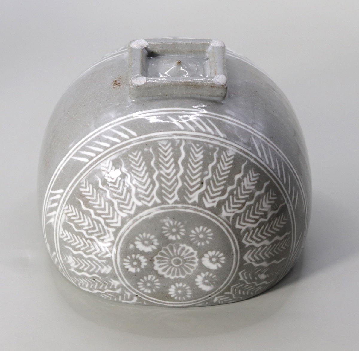 The front of the body features a ring of six petals within a circle surrounded by linked arabesque patterns, with a small flower in the center, creating a "Seven Days"-style composition. Continuous arrow feathers are arranged vertically around the periphery, creating a rhythm that intertwines ancient and modern styles. Inlay is a genuine technique in which the base is engraved or embossed, then white clay is rubbed in and the white space is scraped away to set the pattern. The white that sinks under the glaze gently emerges from the gray-blue glaze surface, creating a unique effect of depth depending on the angle of the light.