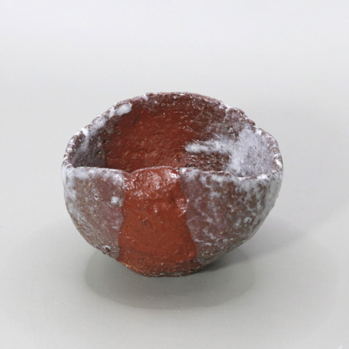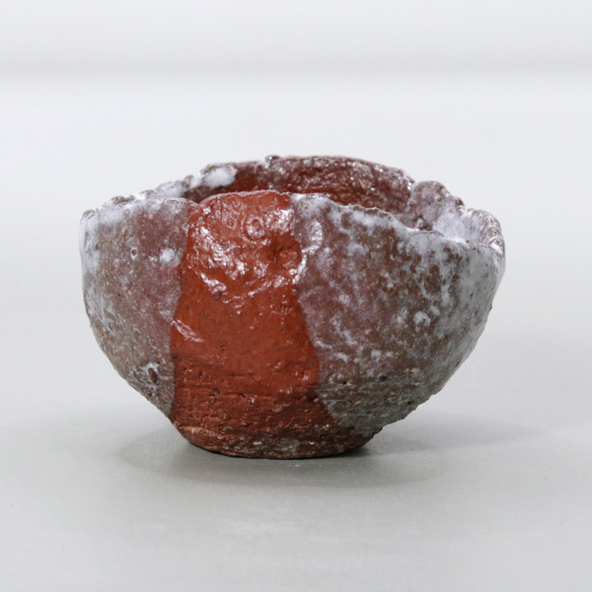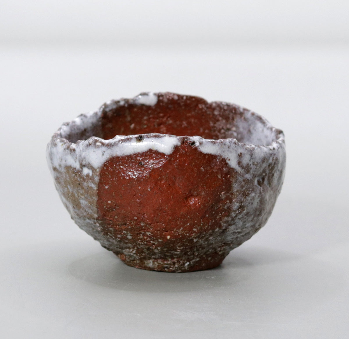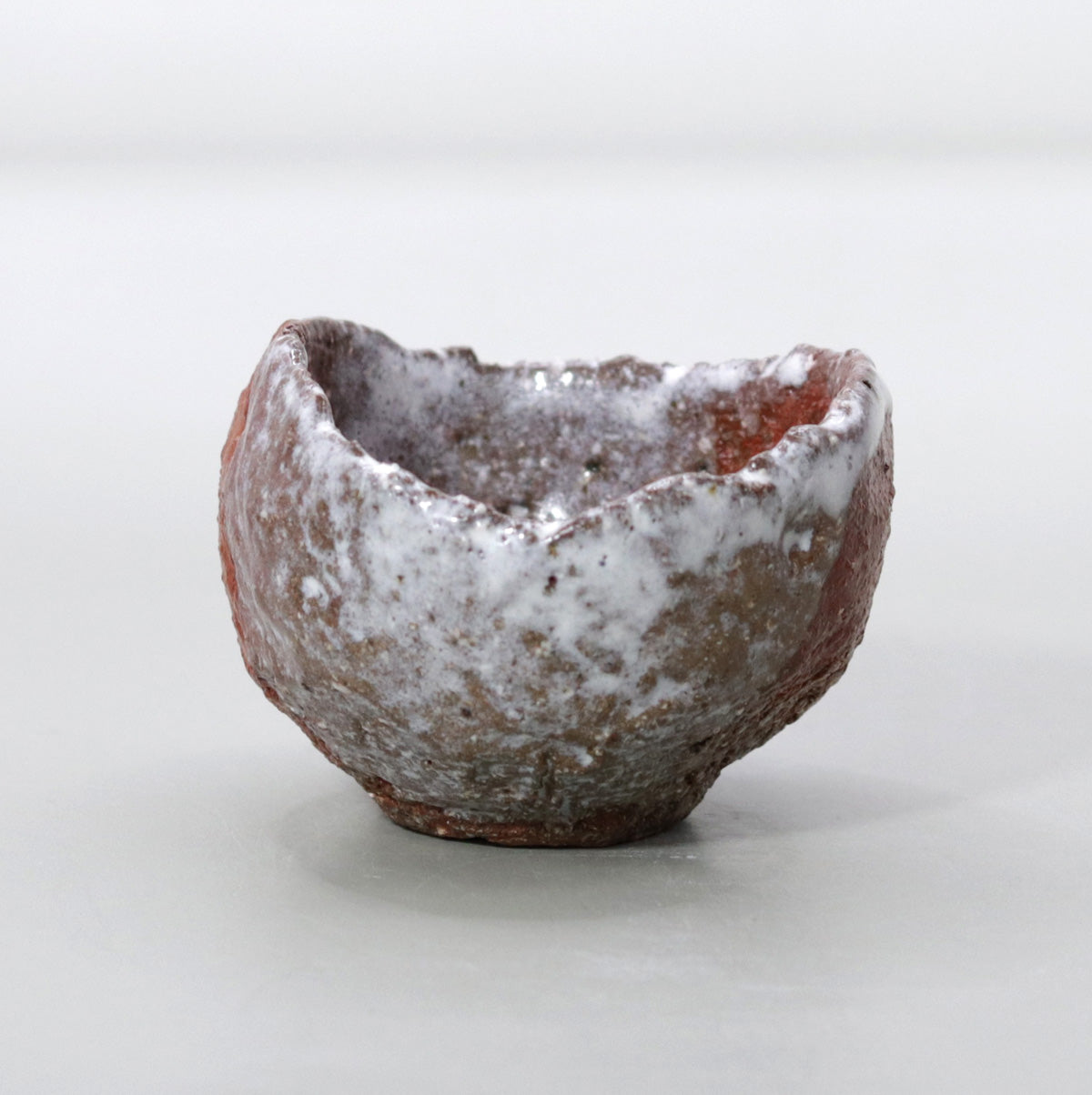 The white glaze applied to the top of the red clay flows naturally, crystallizing as it settles on the surface of the vessel, creating a sense of tranquility as if the peaks were covered in mist or snow. The graininess of the glaze and the sparkle of the surface change subtly depending on the amount of light, revealing a new landscape every time you look at it. The dramatic contrast between red and white creates the feel of a landscape painting in the palm of your hand.