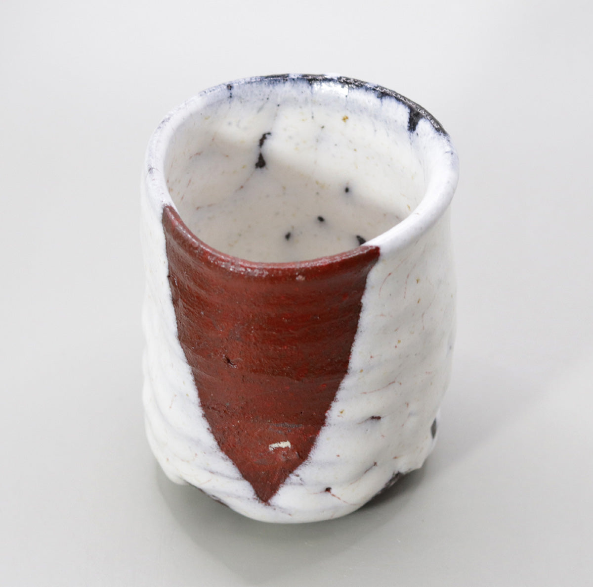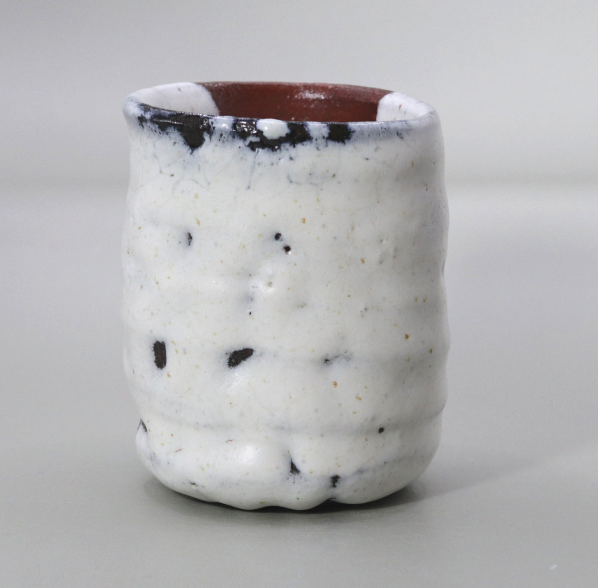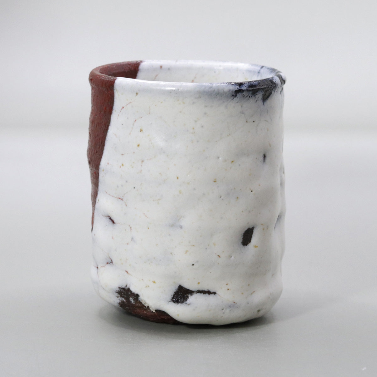 This piece, "Straw White Glazed Teacup," is a striking piece that brings out Nishibata Tadashi's aesthetic sense with its striking contrast between the shape and the glaze. Standing majestically at over 10cm tall, the sharply cut red clay lines create an impressive appearance, making it a teacup that is almost like a sculptural work.