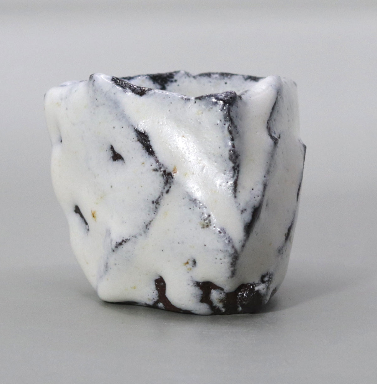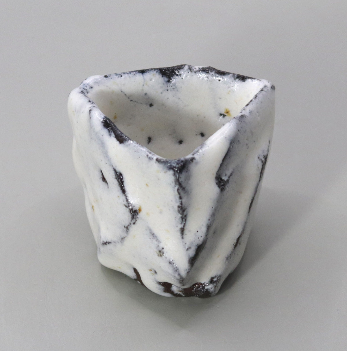 The black lines running across the white glaze are reminiscent of the folds in origami paper, creating a three-dimensional rhythm in this sake vessel.
