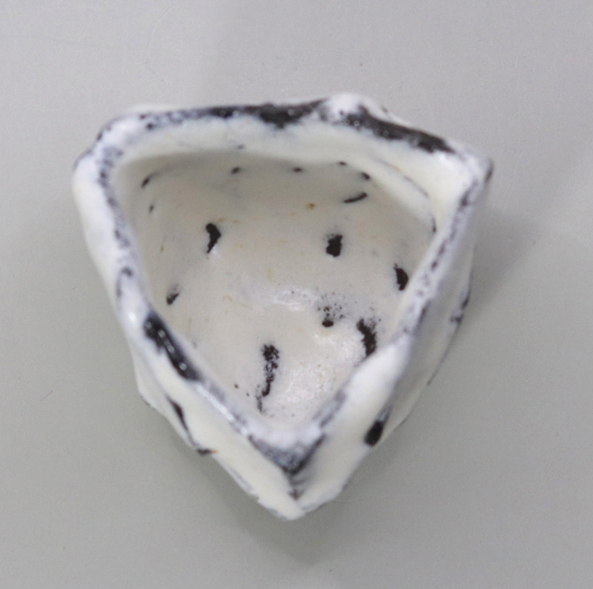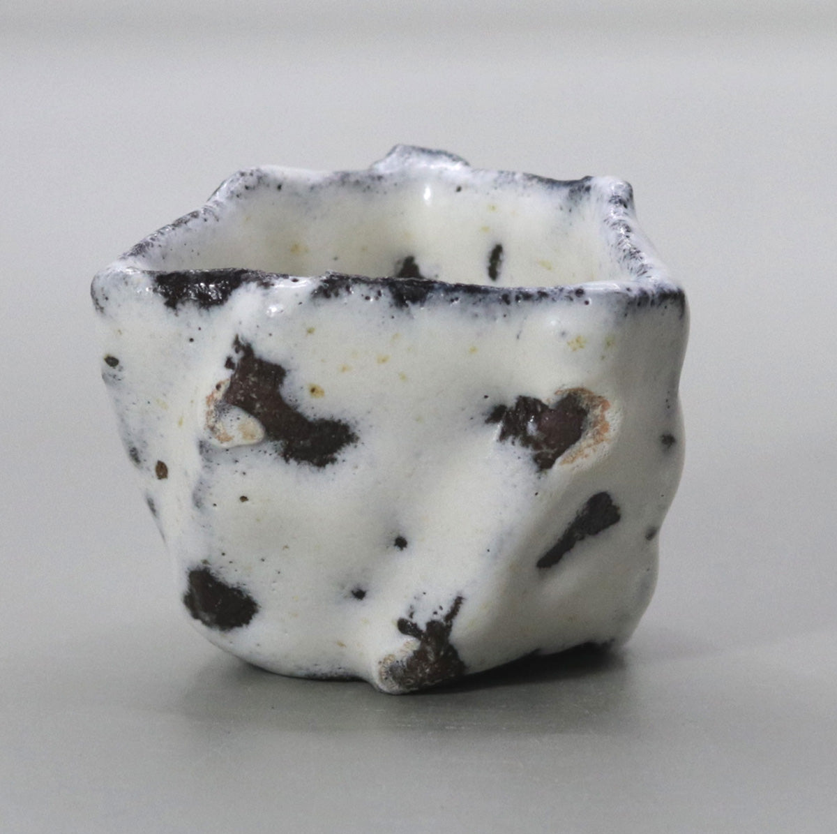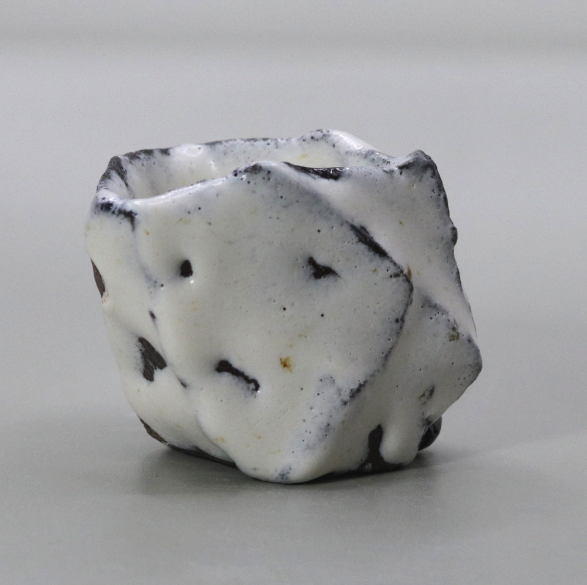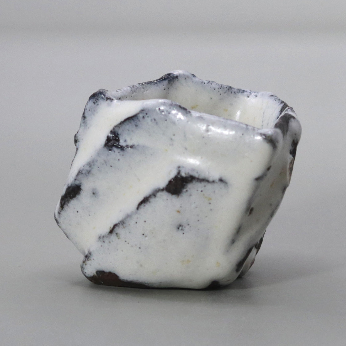 This piece is characterized by sharp ridges, which were created by pressing the clay into a polygonal shape without using a potter's wheel. The series of chamfered edges, which resemble a hexahedron, create dramatically different shadows depending on the angle at which the light hits it, giving the viewer a three-dimensional feel, as if they were viewing a sculpture in the palm of their hand.