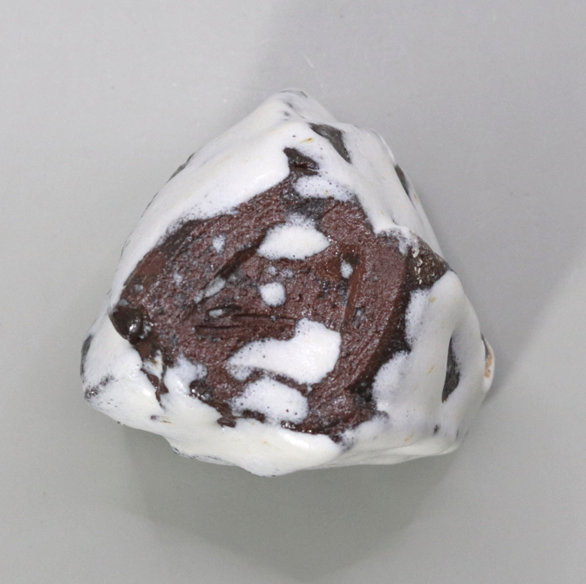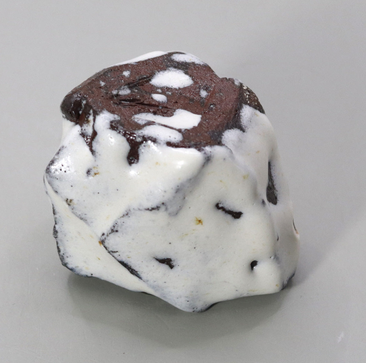 Near the base the glaze is slightly interrupted, exposing the red clay and adding warmth.