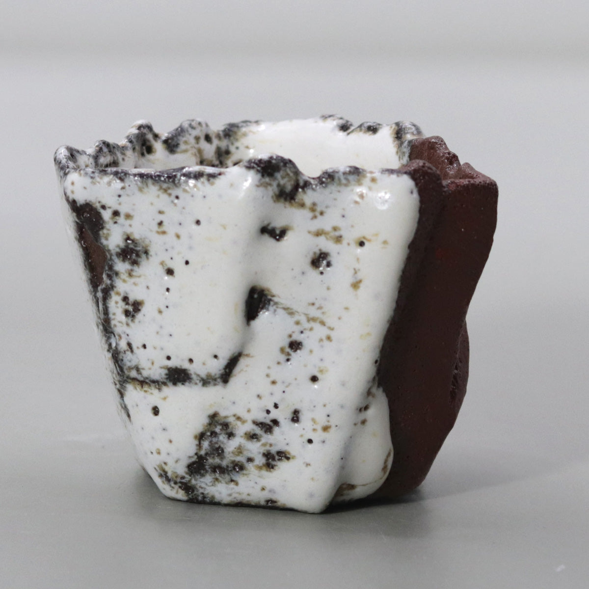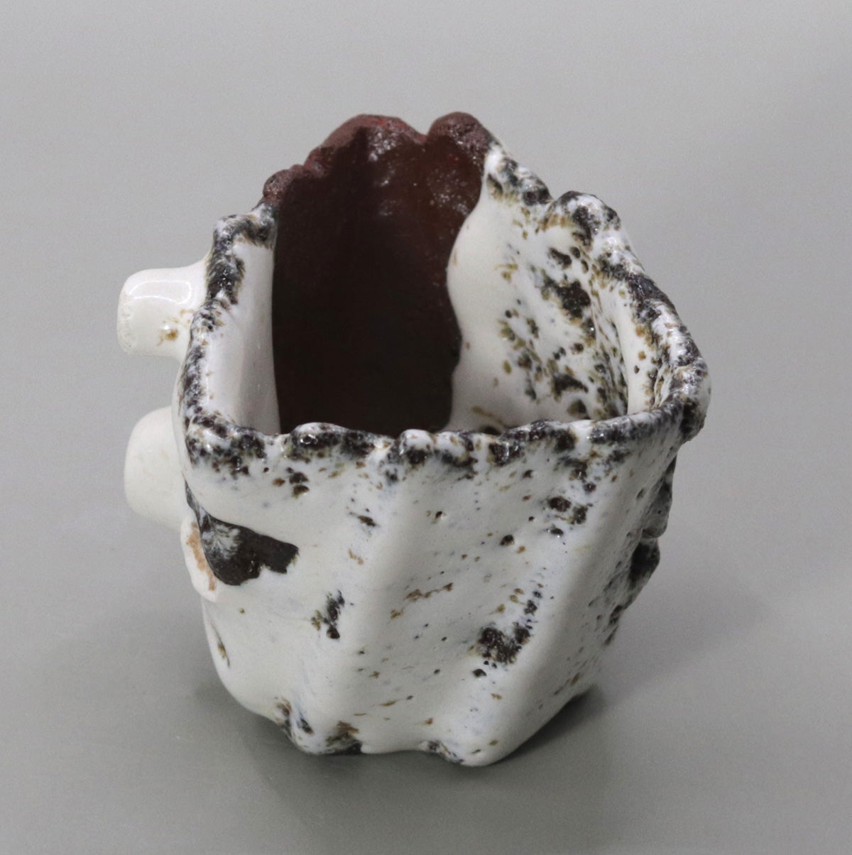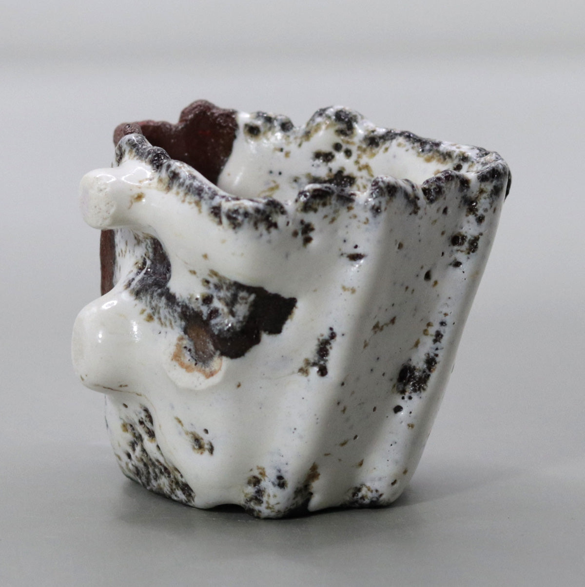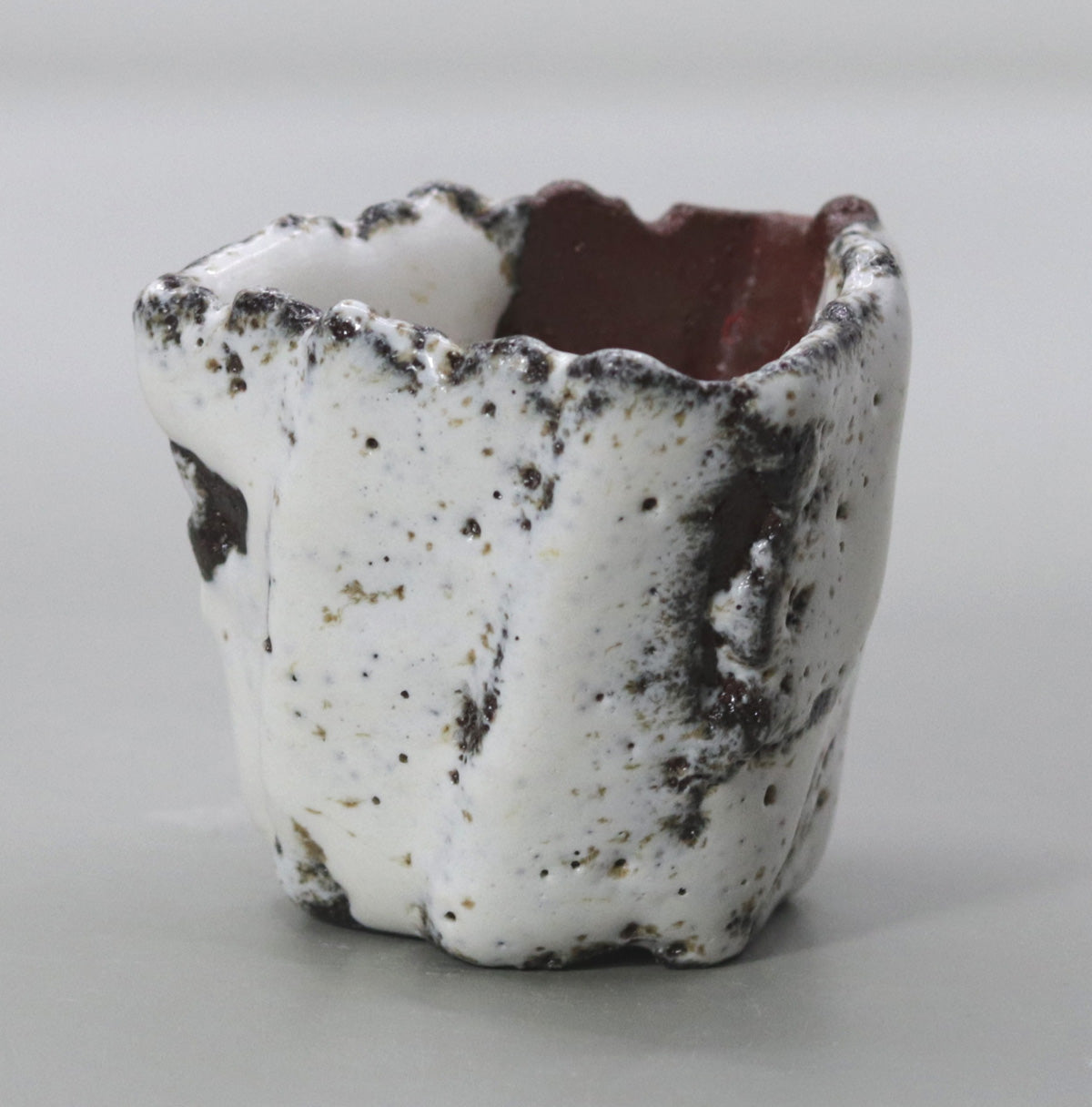 The straw white glaze, which has fine crazing, slowly soaks up sake and moisture, changing from white to a pale gray-brown. The protrusions and chamfers acquire a glossy sheen with continued contact with the hands, and the red clay parts absorb sake and oil and take on a moist deep crimson. Over the years, the white of melting snow will change to the pale pink of a sunset, and the ink spots will fade to the softness of decaying leaves, storing up a story unique to the owner.