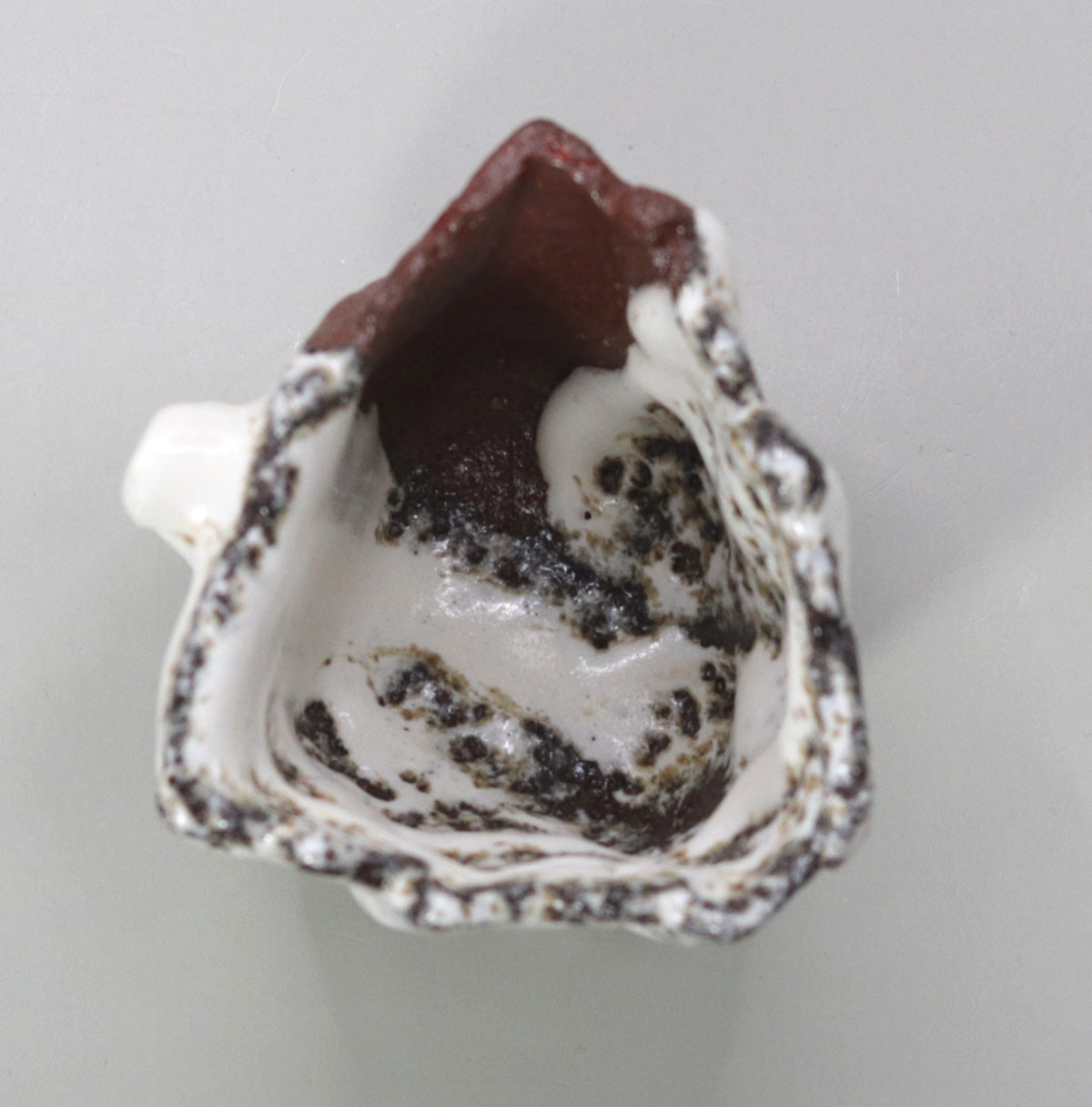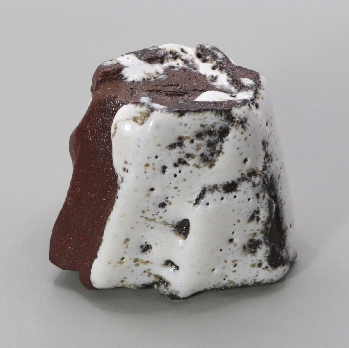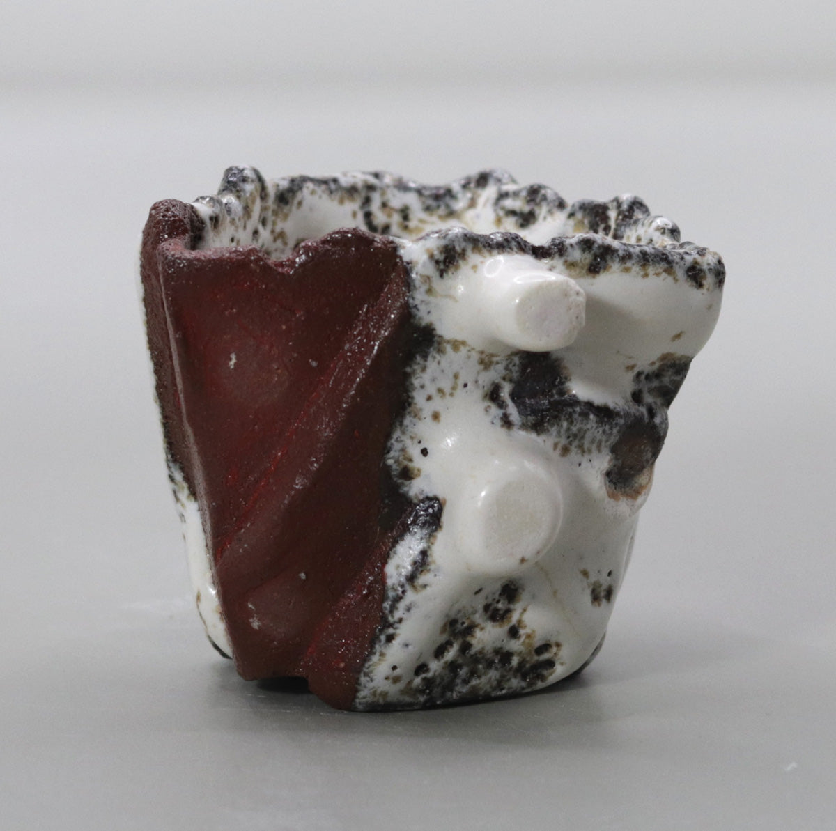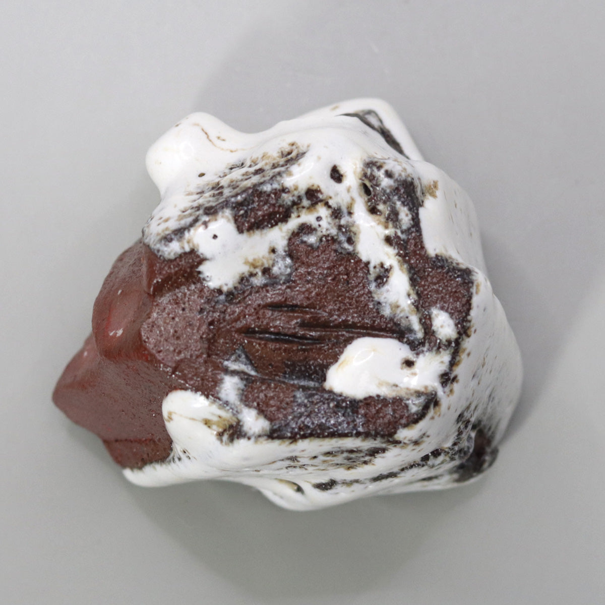 The straw white glaze, which has fine crazing, slowly soaks up sake and moisture, changing from white to a pale gray-brown. The protrusions and chamfers acquire a glossy sheen with continued contact with the hands, and the red clay parts absorb sake and oil and take on a moist deep crimson. Over the years, the white of melting snow will change to the pale pink of a sunset, and the ink spots will fade to the softness of decaying leaves, storing up a story unique to the owner.