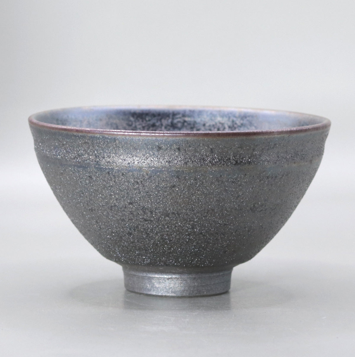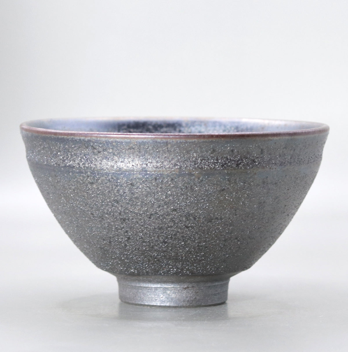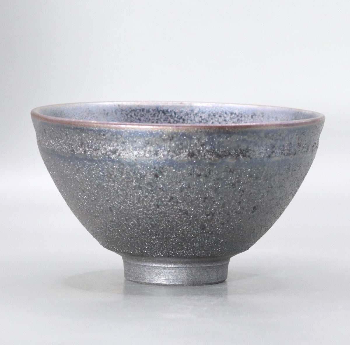 釉面には銀彩めいて輝く鉄結晶が点在し、茶席の仄灯りを受けるたびに瞬きます。濃茶を点てれば泡の間に星々が映り込み、薄茶では緑の茶面が夜空に広がる天の川のように溶け合います。使用を重ねることで貫入に茶が染み入り、結晶の輝きがより奥深くなる経年変化も楽しみの一つです。