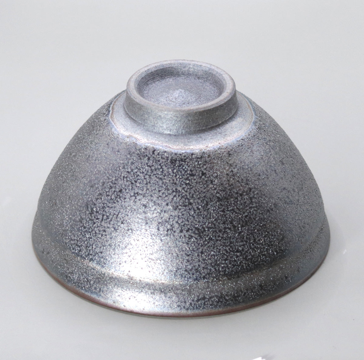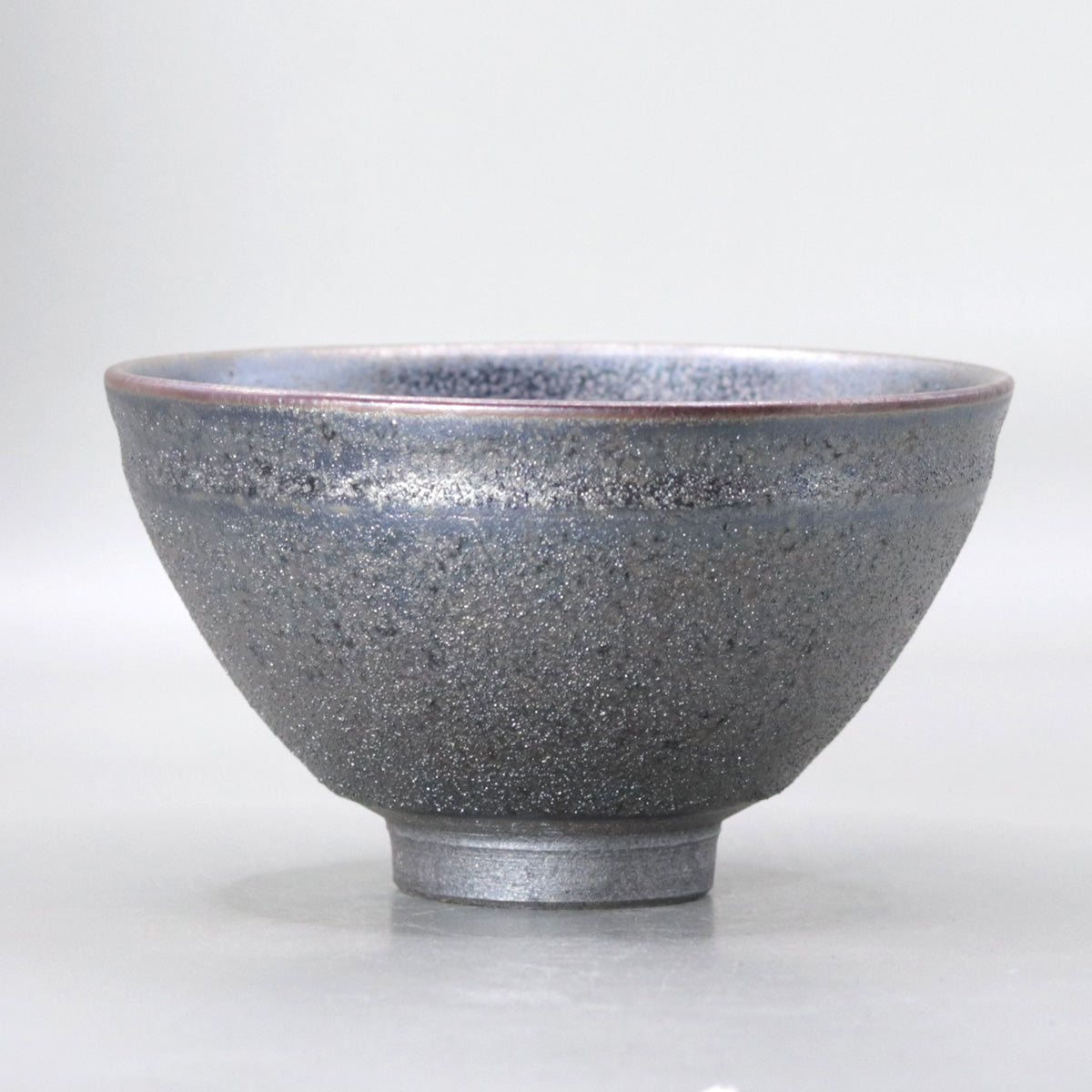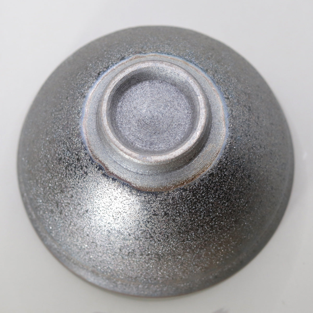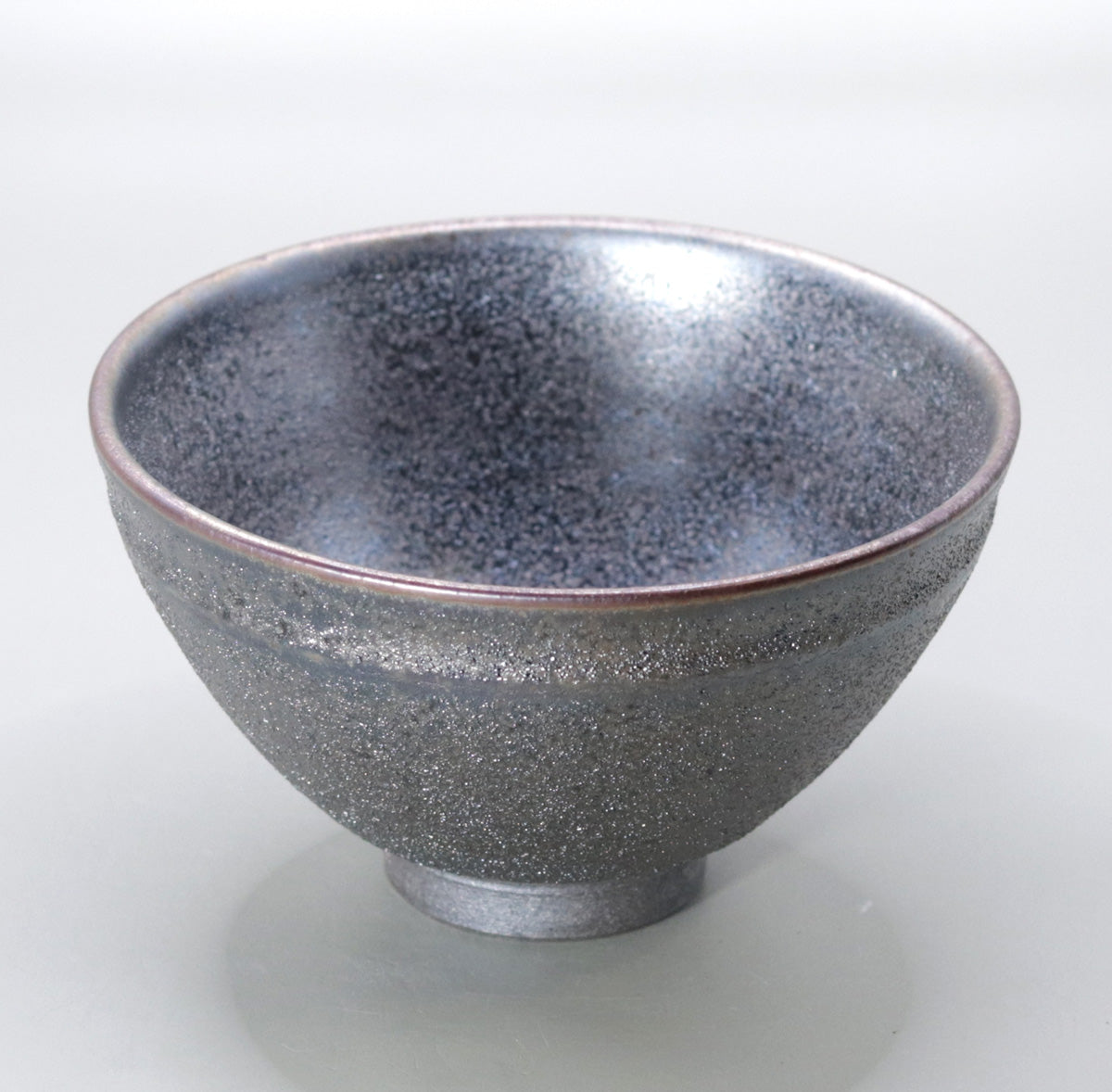 釉面には銀彩めいて輝く鉄結晶が点在し、茶席の仄灯りを受けるたびに瞬きます。濃茶を点てれば泡の間に星々が映り込み、薄茶では緑の茶面が夜空に広がる天の川のように溶け合います。使用を重ねることで貫入に茶が染み入り、結晶の輝きがより奥深くなる経年変化も楽しみの一つです。