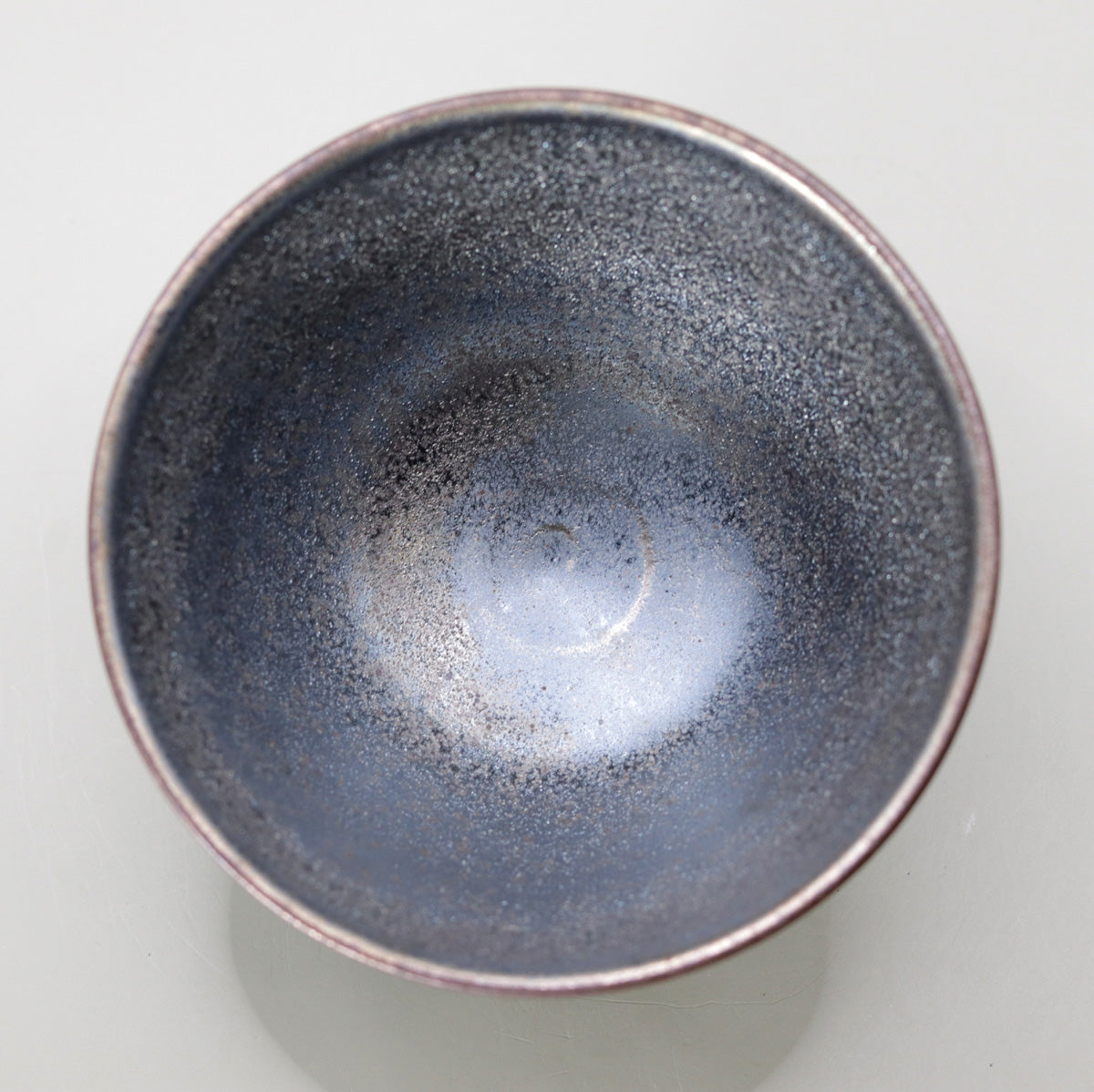 本作を覆う天目釉は、濃瑠璃色の闇に銀砂のような微細結晶を宿し、まるで月明かりを含む夜空をそのまま掬い取ったかのようです。光が当たる角度によって星屑のような煌めきが浮かび上がり、抑えた光沢と相まって幽玄なたたずまいを醸し出しています。還元焼成により口縁部に現れた赤紫の“火間”が、静かな闇にあたたかな余韻を添えています。