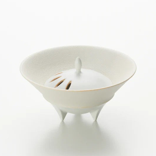 白磁香器 松川和弘作は、香を焚くための機能美と、白磁の静けさを極限まで研ぎ澄ませた逸品です。三脚が生む浮遊感、火舎の透かしが整える香気、そして白が空間を澄ませる力。茶席に据えるだけで、香の気配のみならず、場そのものが静かに整い、客人の感覚をそっと開いてくれることでしょう。