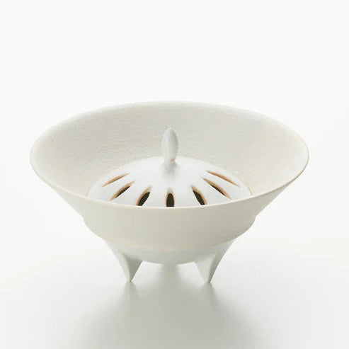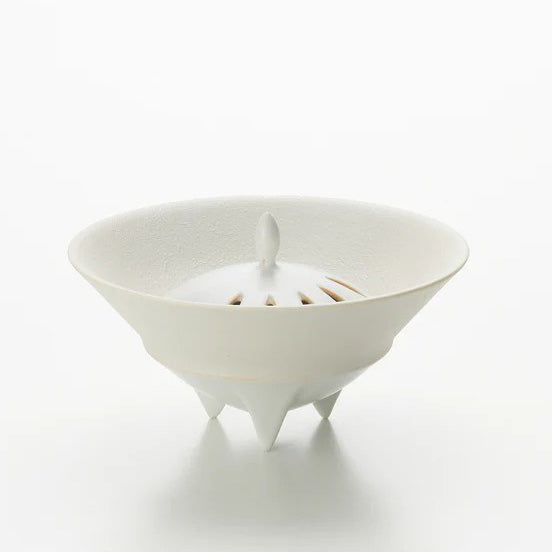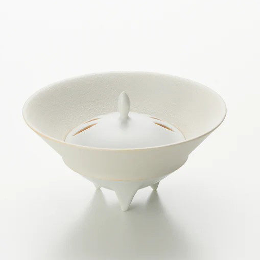 中央の摘みは、芽や雫を思わせる小さな突起として立ち上がり、白い世界の中に“上向きの意志”を与えています。この一点があることで、器体の広がり(水平)と、香の立ち上り(垂直)が結ばれ、香器としての意味が視覚化されます。
