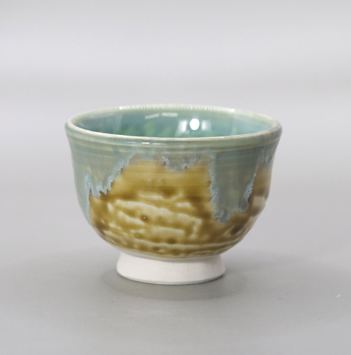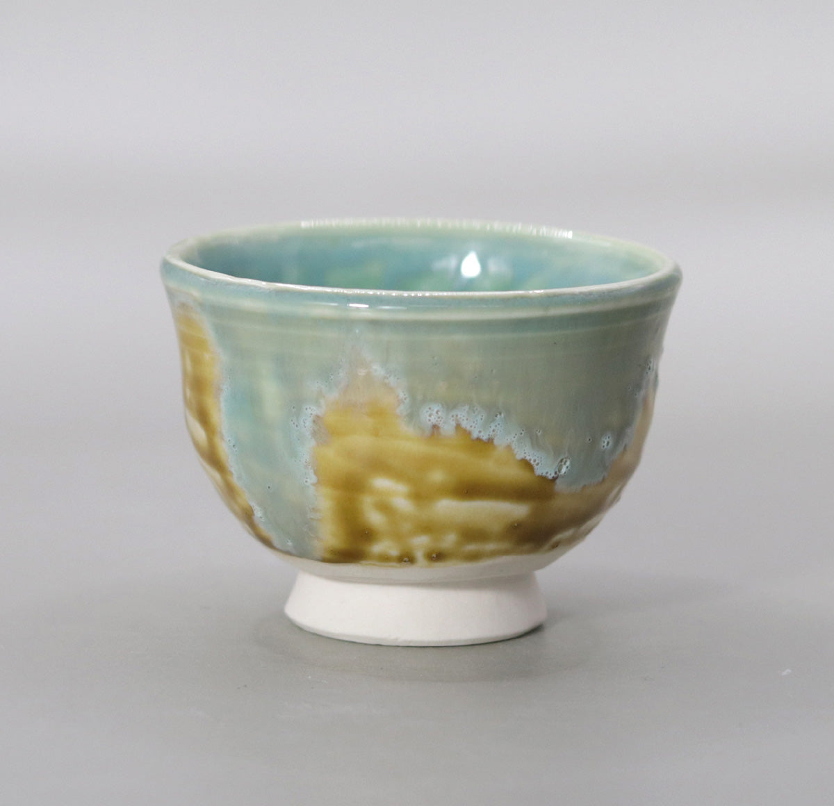 翠緑の中にほんのりと混じる水色や白の気配、そこに自然と溶け込んだ黄土色の窯変が、絵画のような色面を生み出し、ただの色彩にとどまらない詩情を与えています。淡く柔らかい印象の中に、どこか張り詰めた静けさが宿っており、見る者の内面にまで響くような深さを感じさせます。