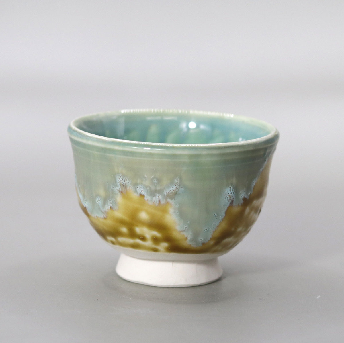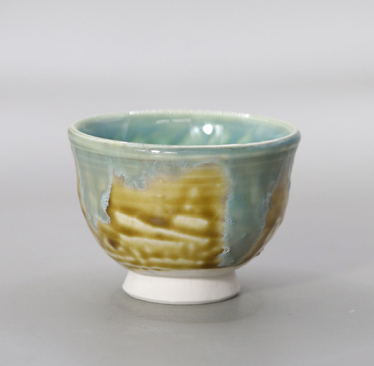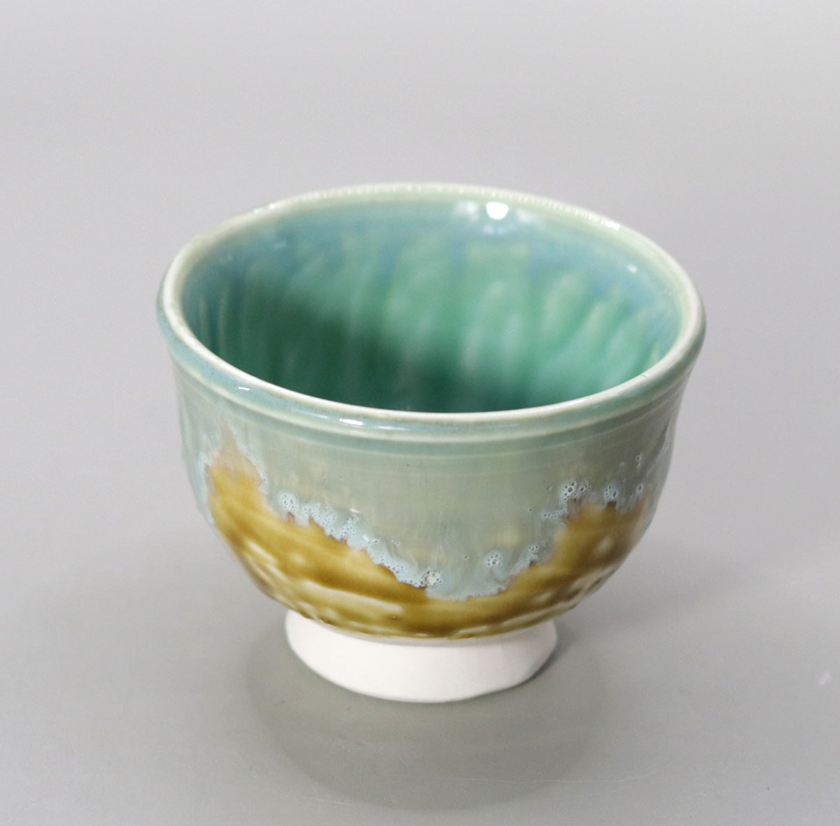 六代 小川文齋(興)様によるこの「翠緑ぐい呑み」は、釉薬の流れと光の透過が織りなす、静かな詩のような器です。淡く澄んだ翡翠色の釉と、焼成の中で偶然に現れた黄褐色の窯変が、まるで雲間から差し込む光と山肌のように器肌に交差し、自然の景をそのまま切り取ったかのような幻想的な表情を見せています。