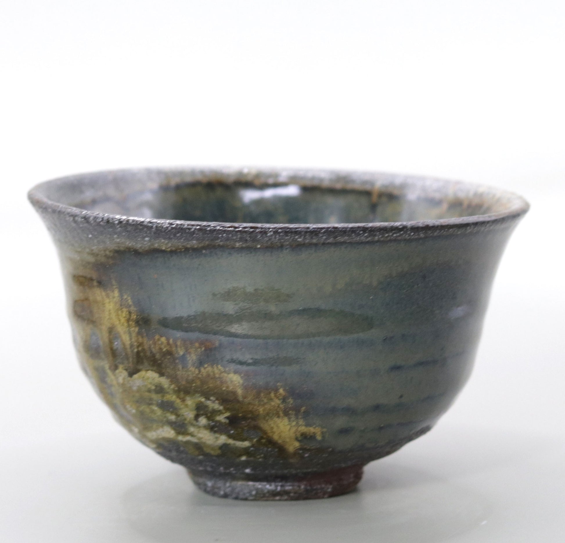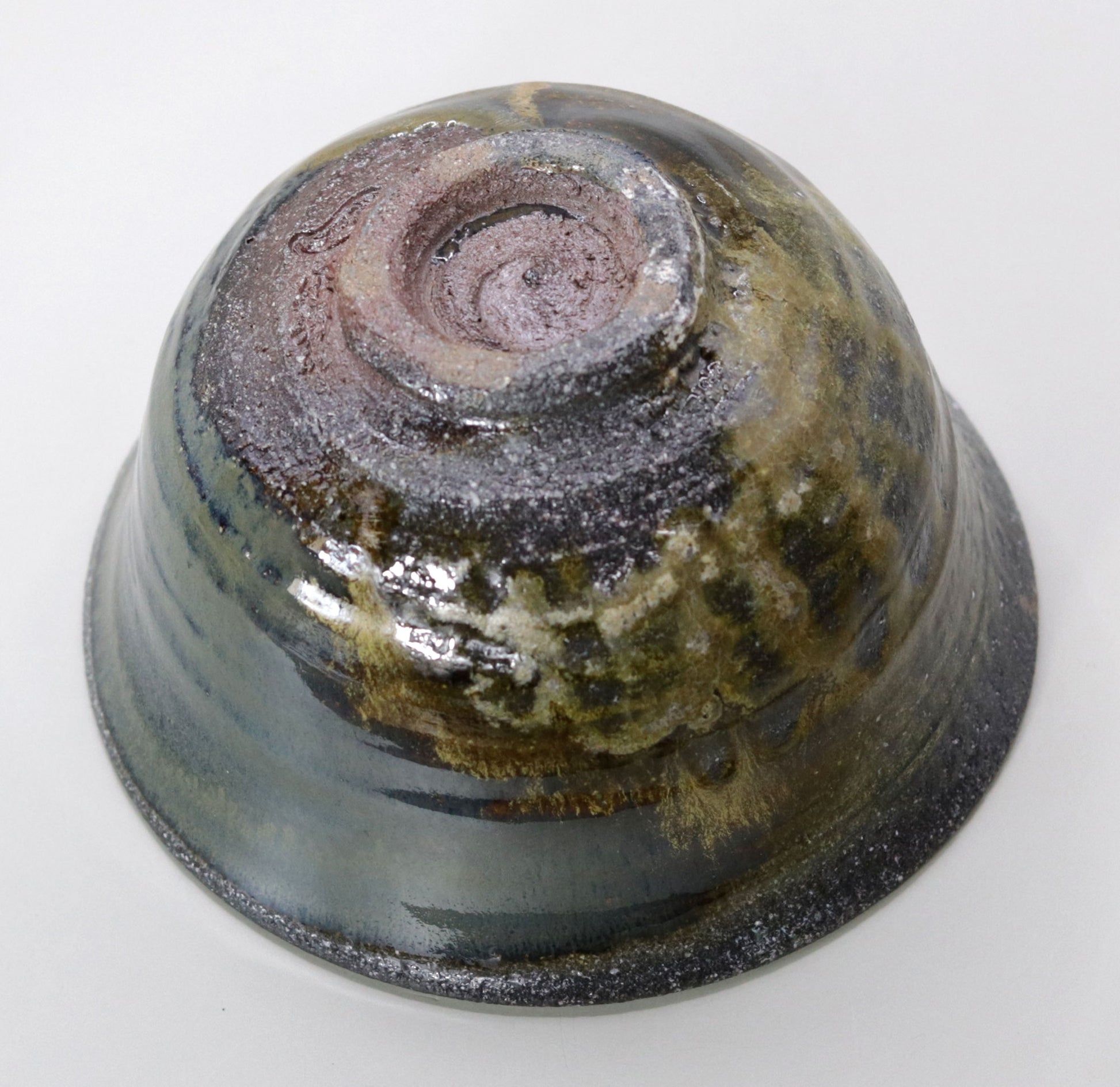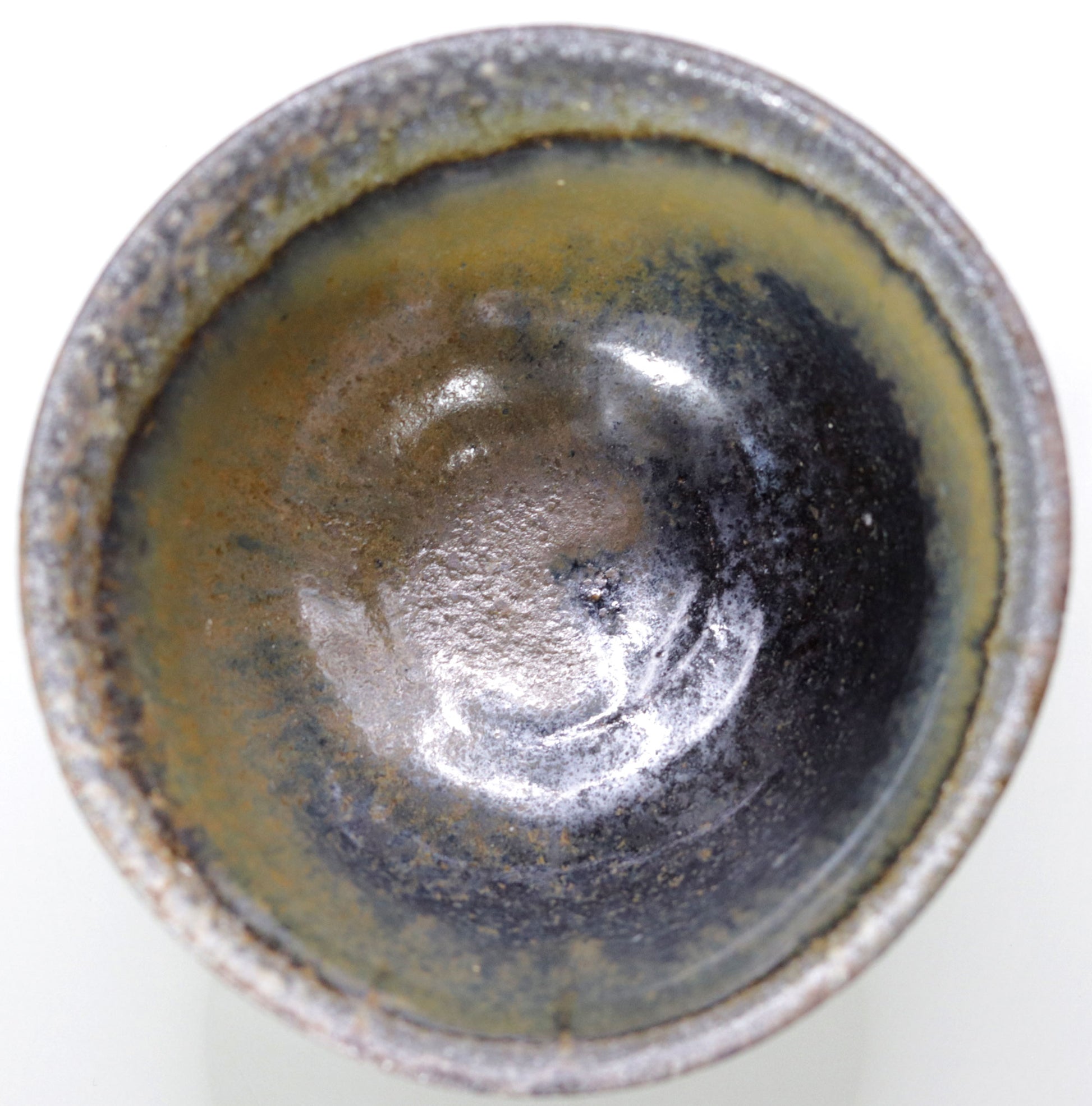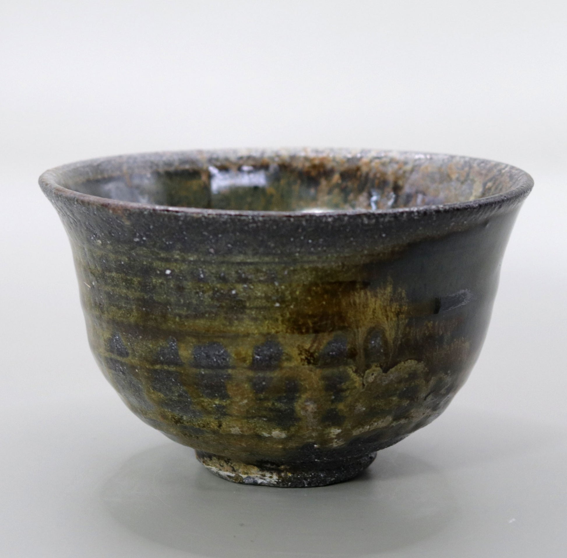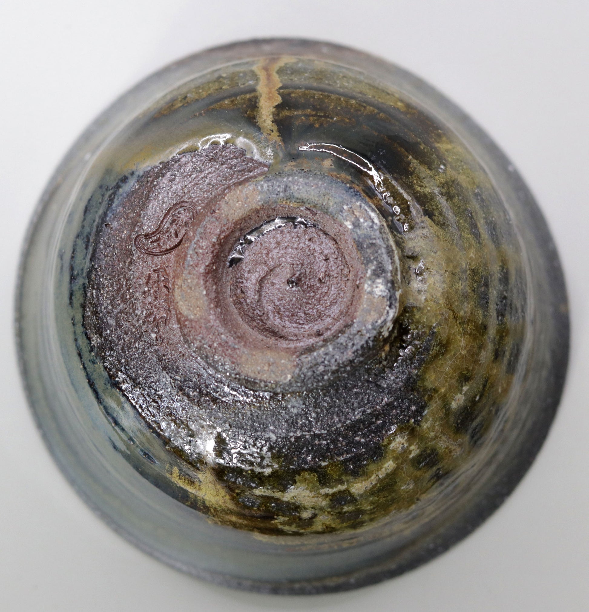 鉄釉は、酸化鉄が含まれるために単なる真黒ではなく、複雑で奥深い色合いを生み出します。還元焼成により、薪の小さな登り窯で焼かれたこの茶碗は、鉄釉の表情が非常に豊かで、灰が降りかかり釉薬が流れ落ちる過程で、土の色が微妙に現れます。この鉄釉の変化が、茶碗全体に生き生きとした美しさを与えています。