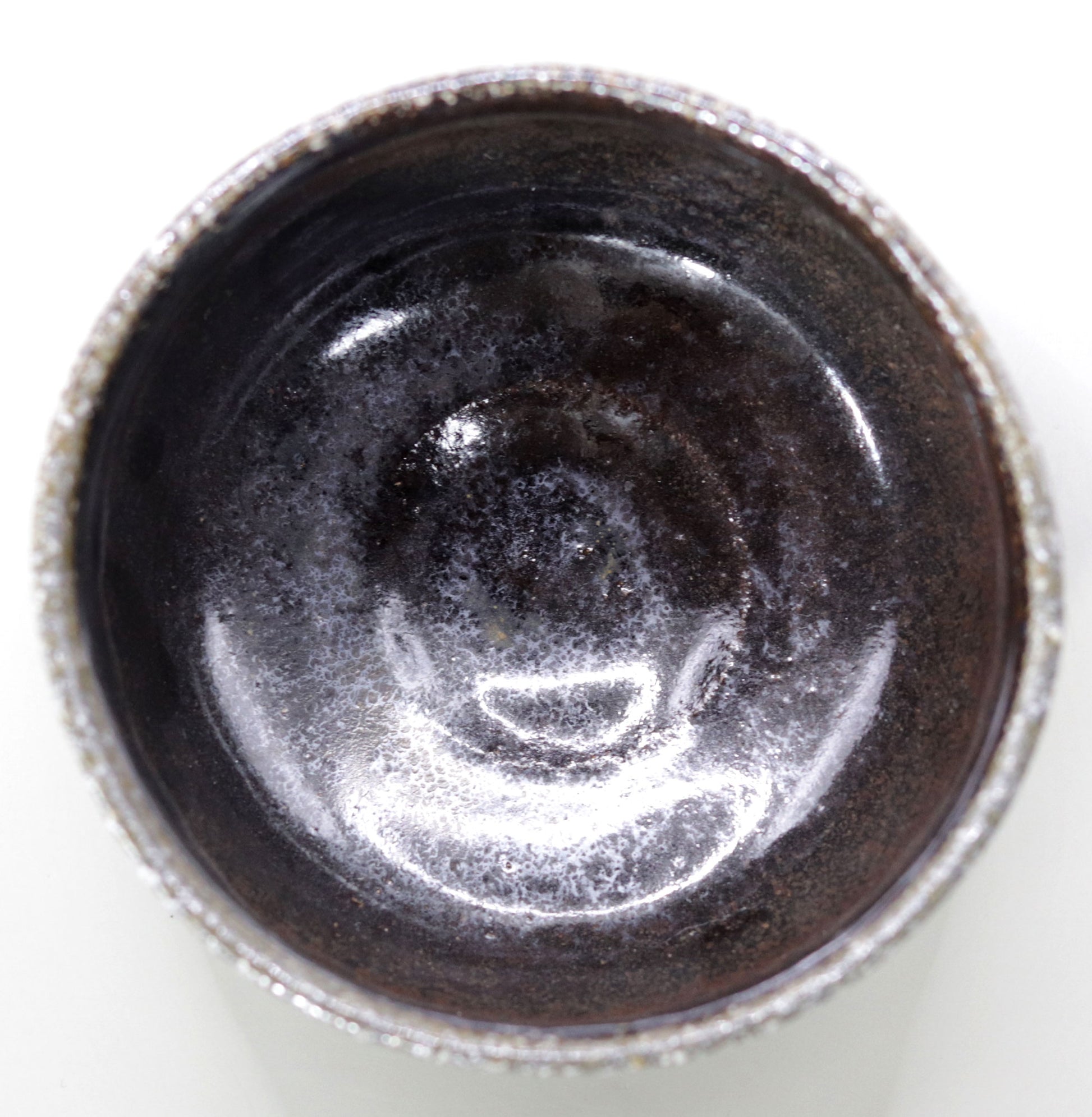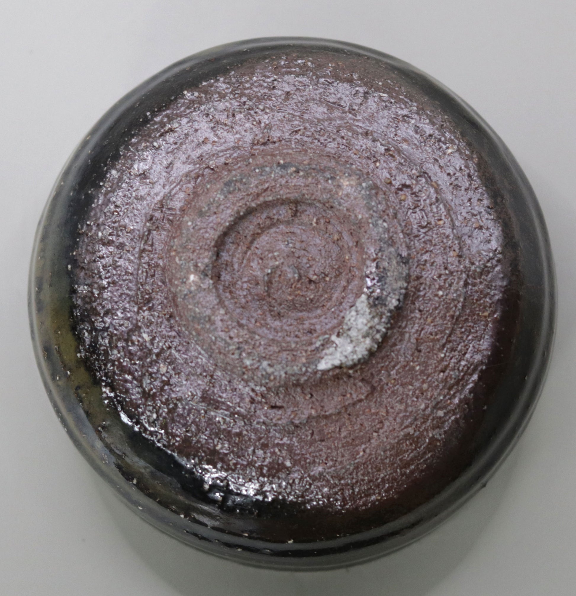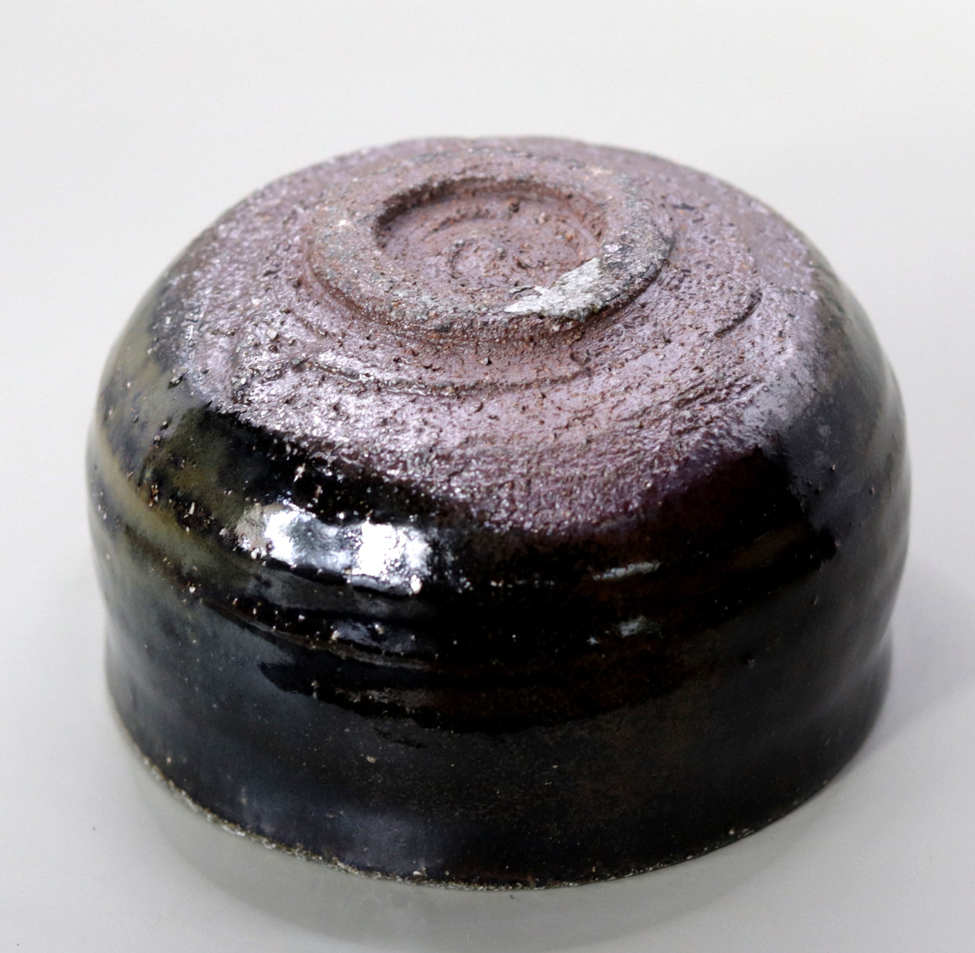 鉄釉は、酸化鉄が含まれるために単なる真黒ではなく、複雑で奥深い色合いを生み出します。還元焼成により、薪の小さな登り窯で焼かれたこの茶碗は、鉄釉の表情が非常に豊かで、灰が降りかかり釉薬が流れ落ちる過程で、土の色が微妙に現れます。この鉄釉の変化が、茶碗全体に生き生きとした美しさを与えています。