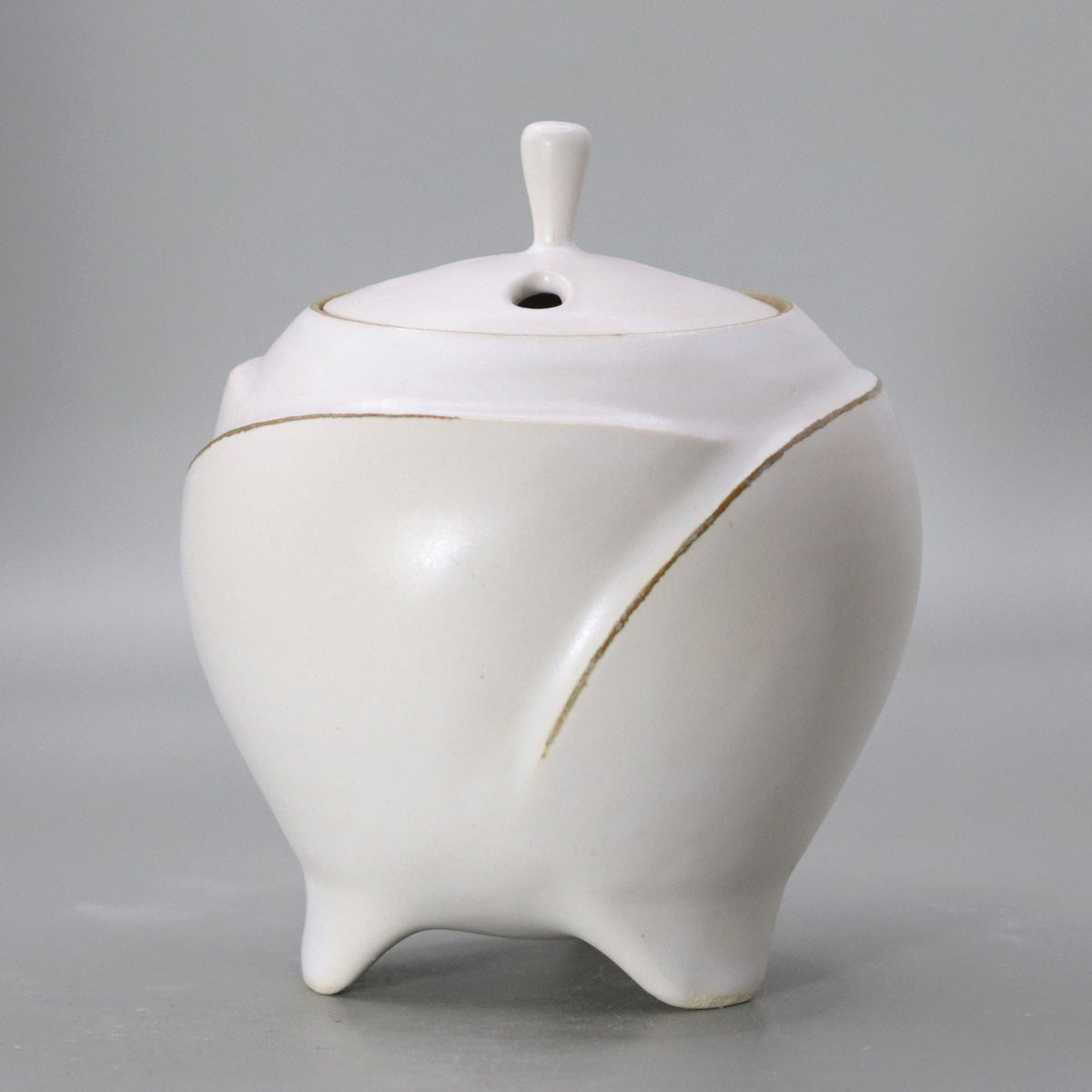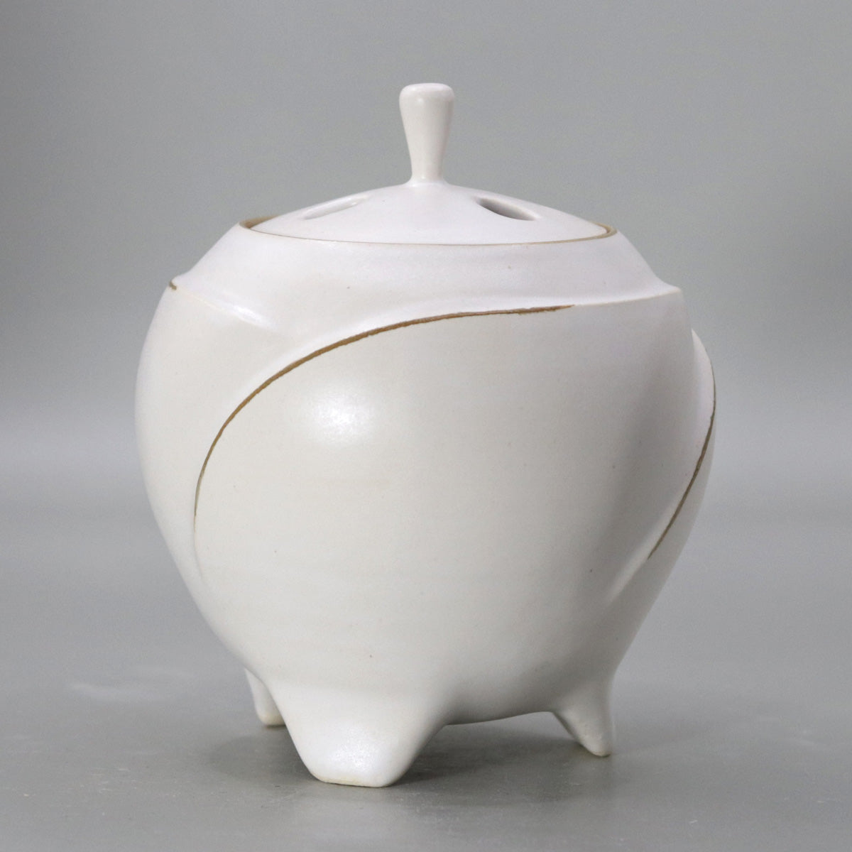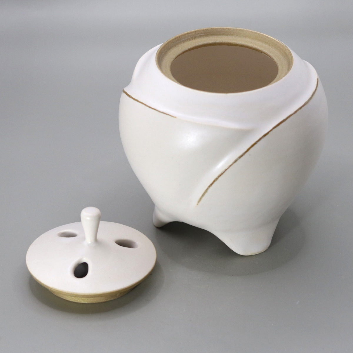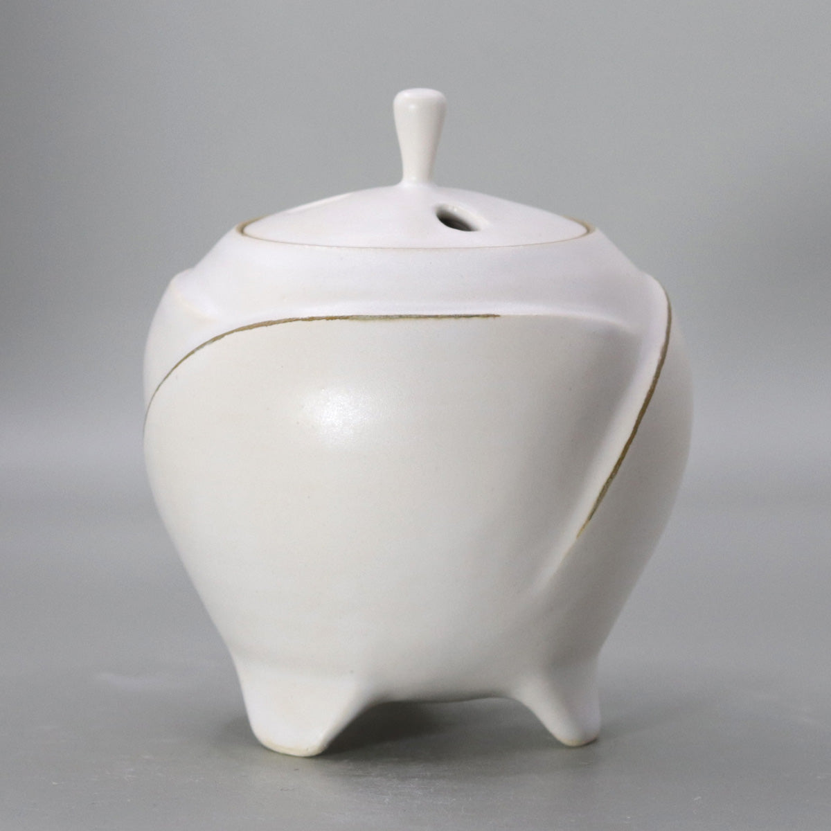 《白釉稜線香炉》は、抽象彫刻と茶道具の機能を高度に統合した逸品です。三脚の軽やかな立ち姿と切り裂く稜線が、白磁の静けさにリズムを与え、香煙とともに空間を浄化いたします。茶席はもちろん、モダンなリビングやアートギャラリーにも自然に溶け込み、火を扱う儀礼性と現代デザインが交差する「静謐なる中心点」となることでしょう。