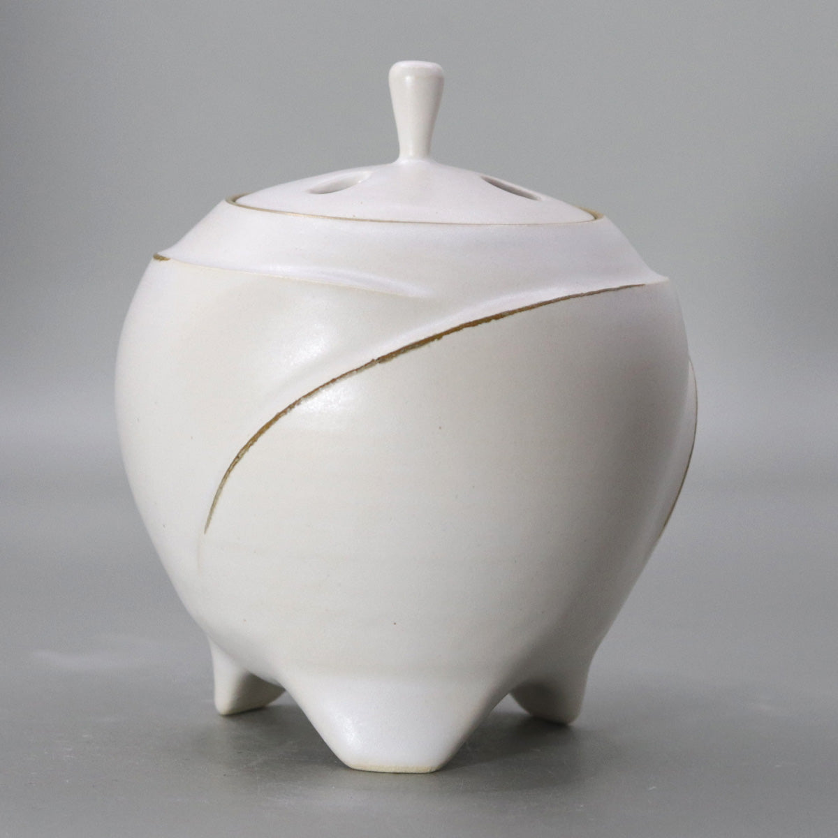 胴を斜めに横切る稜線は、火舎から立ち昇る香煙の螺旋を象徴。白磁の静寂を切り裂く一閃が、空間へ動的な緊張を放ちます。
