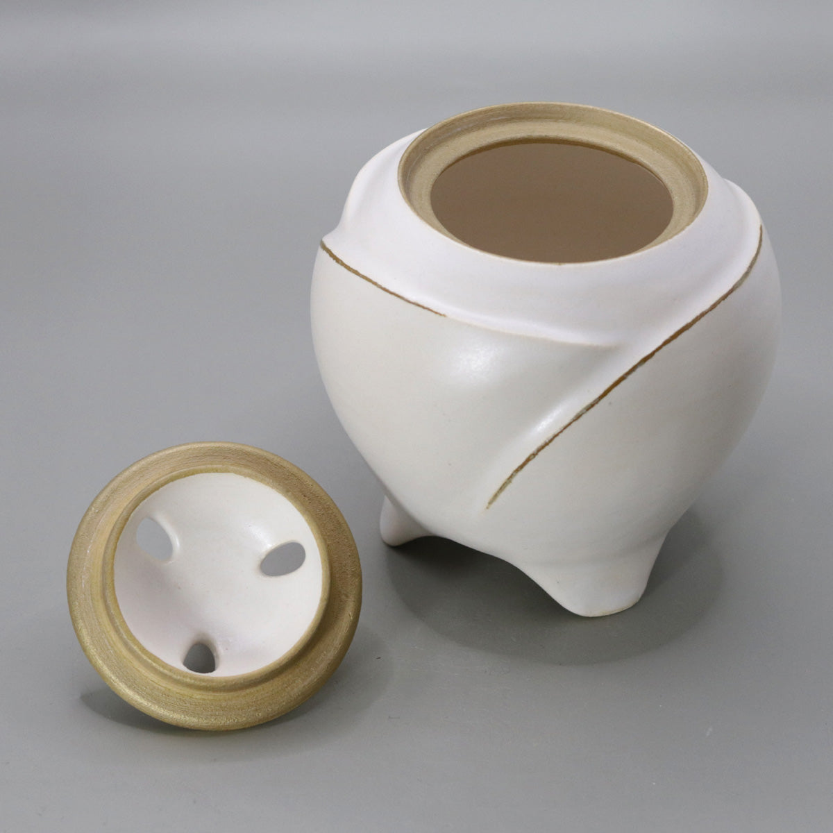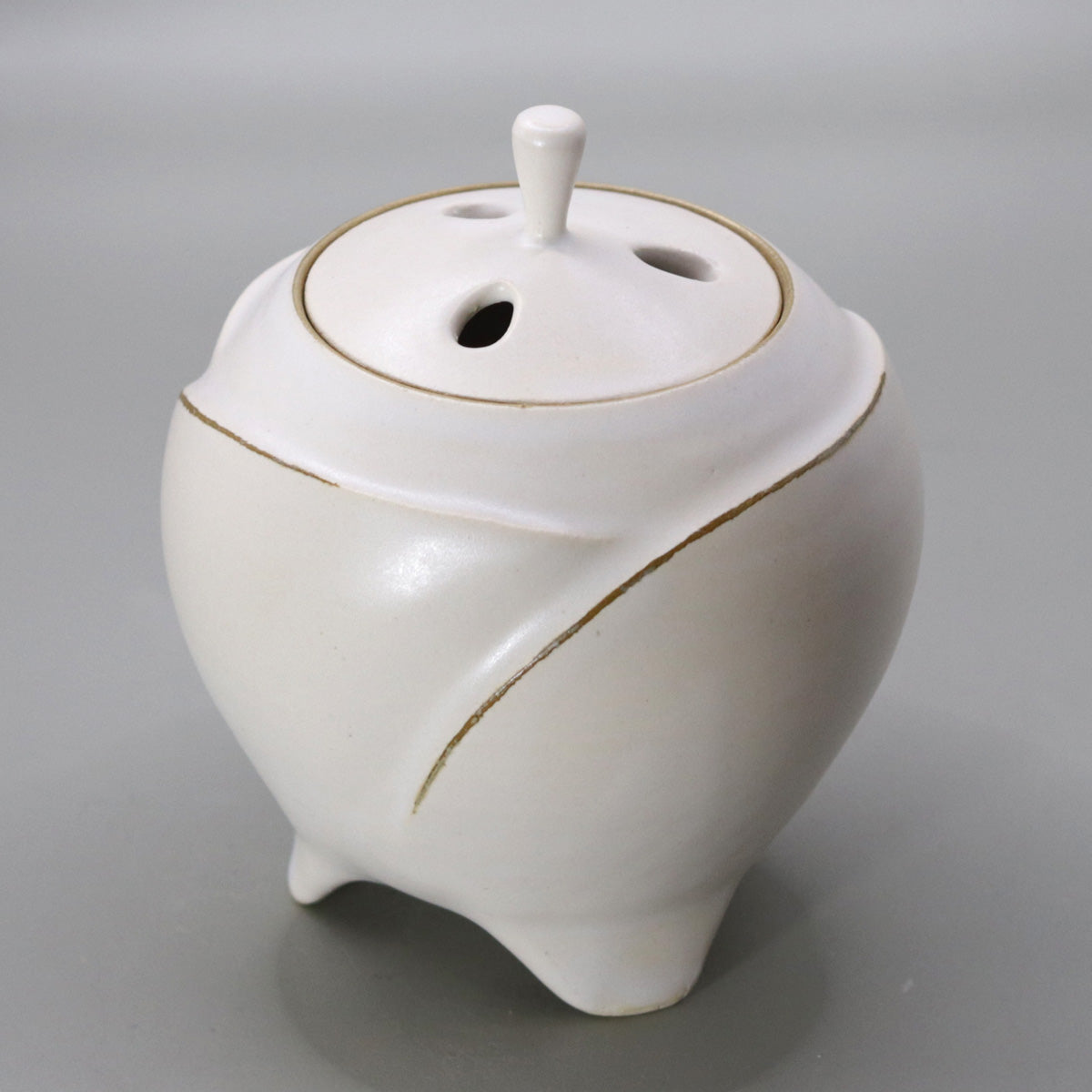 岡田優様が手がける《白釉稜線香炉》は、純白の陶肌にわずかな稜線を走らせ、三本脚で軽やかに立ち上がる現代的香炉です。火舎(ふや)を包む柔らかな曲面と、鋭いカッティングラインの共存が、「静」と「動」、「温」と「冷」の二元を端正に結晶させております。以下、歴史・技法・意匠・精神性・取り合わせの五章立てで、その魅力を詳しくご紹介いたします。