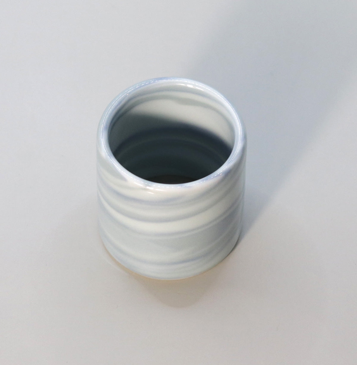 本作「練込青瓷蓋置」は、白磁・青磁・藍磁の三種の磁土を練り合わせて轆轤成形した作品です。この技法は「練込」と呼ばれ、磁器では非常に高い技術と感性が求められる制作法です。
