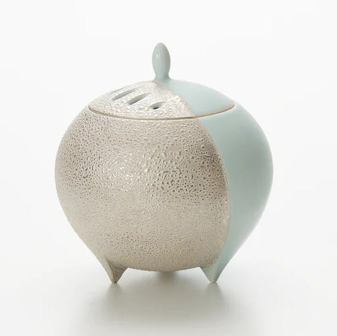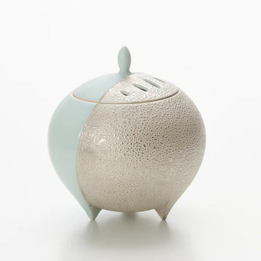 青白磁銀彩香器 松川和弘作は、青白の清澄さと銀彩の微光を、球体に近い造形へと統合した香器です。静けさを深め、光を映し、香の立ち上がりを整える。茶席に置けば、香の気配が過剰に主張することなく、しかし確かに空間の輪郭を澄ませ、客人の五感をそっと開いてくれることでしょう。