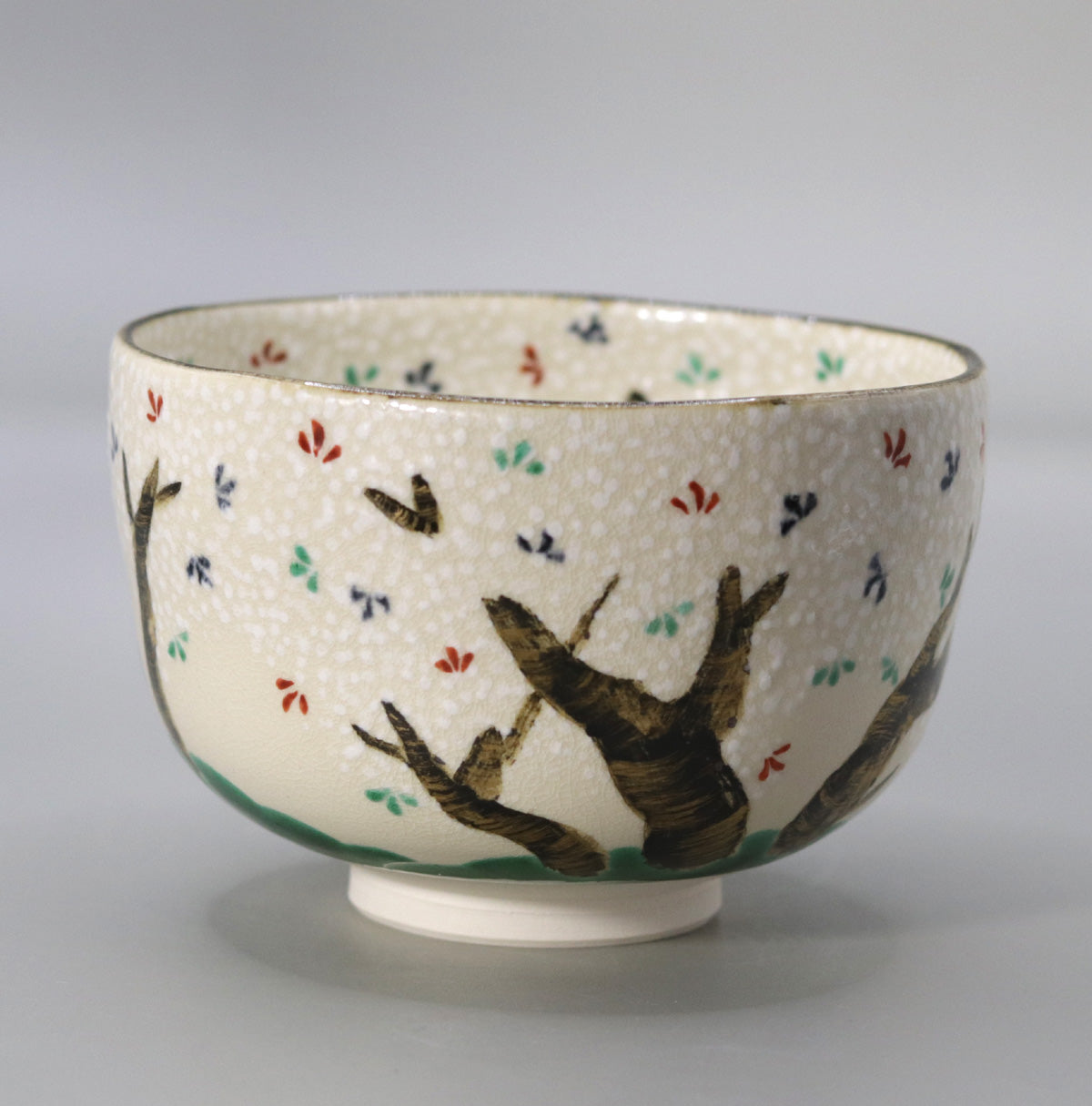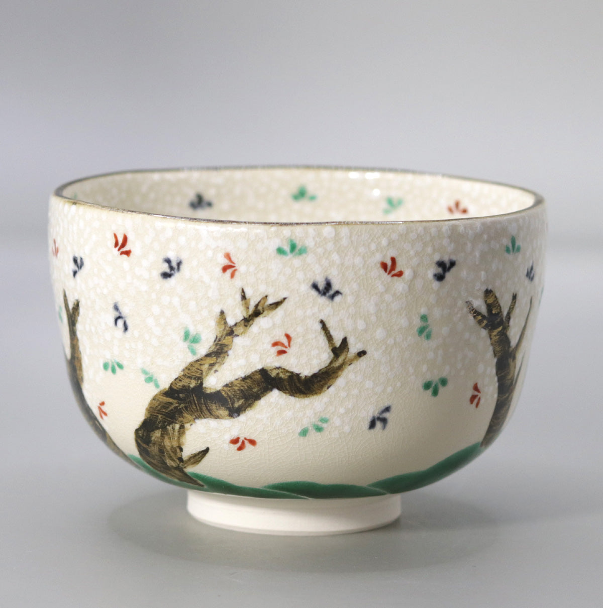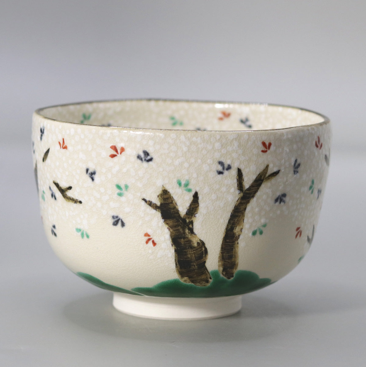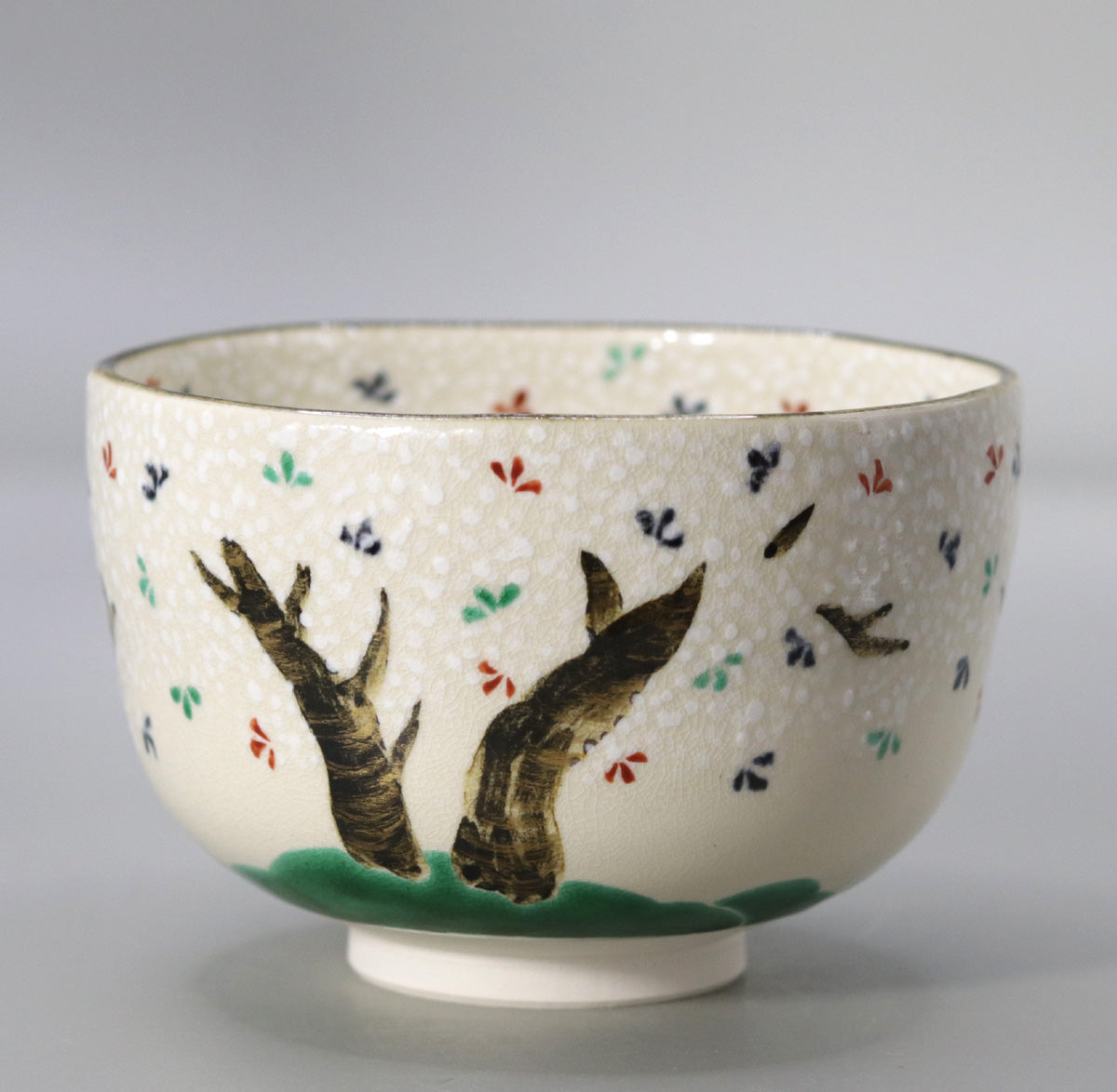 「桜」は平安以来、観桜の宴や和歌に詠まれ、花の吉祥として茶席でも親しまれてきました。特に“花の茶事”と呼ばれる四月初旬の茶会では、桜を主題とする茶道具が重宝されます。高橋道八様は京焼色絵の名門として、古典的意匠を踏まえつつ現代的な感性を融合させることで知られ、本作でもミニマルな筆致と遊び心ある吹付け表現で、現代空間にも合う軽やかな桜景色を創出しています。