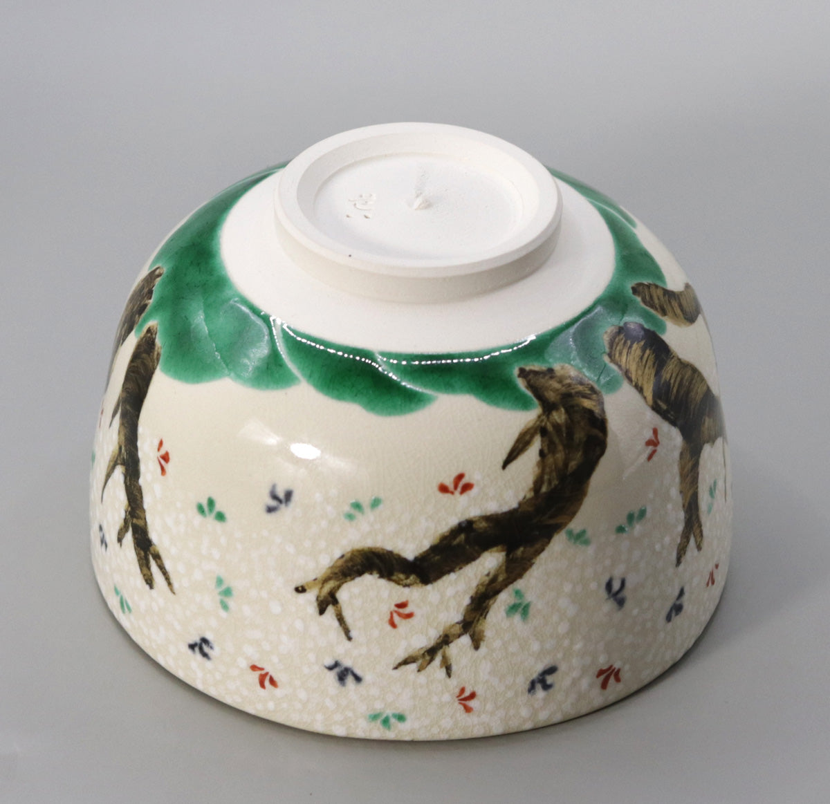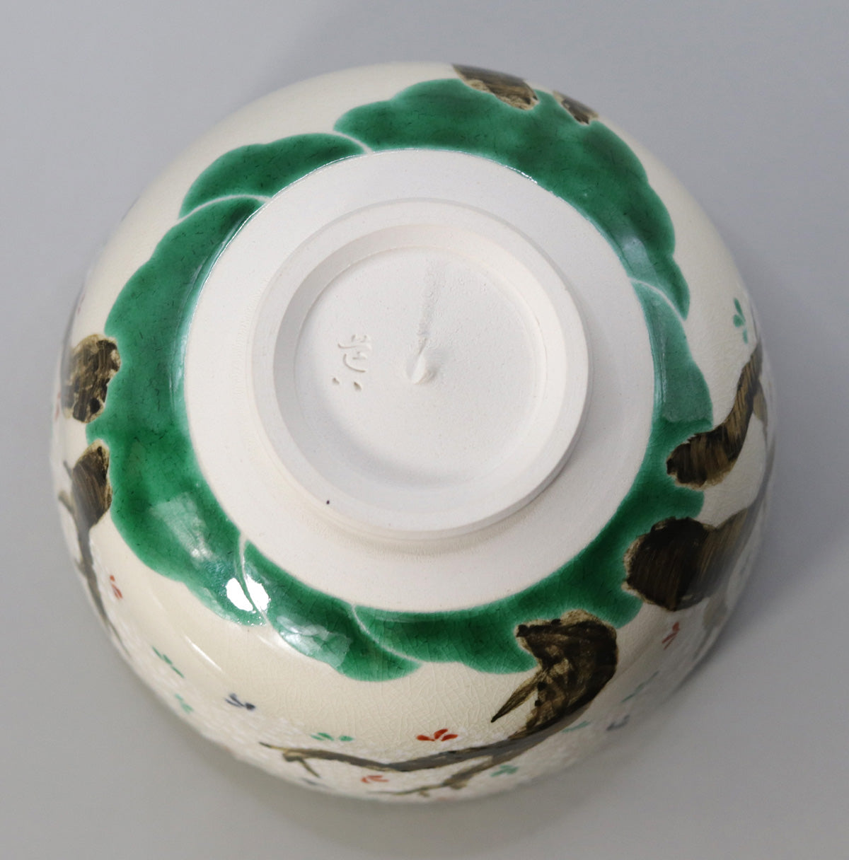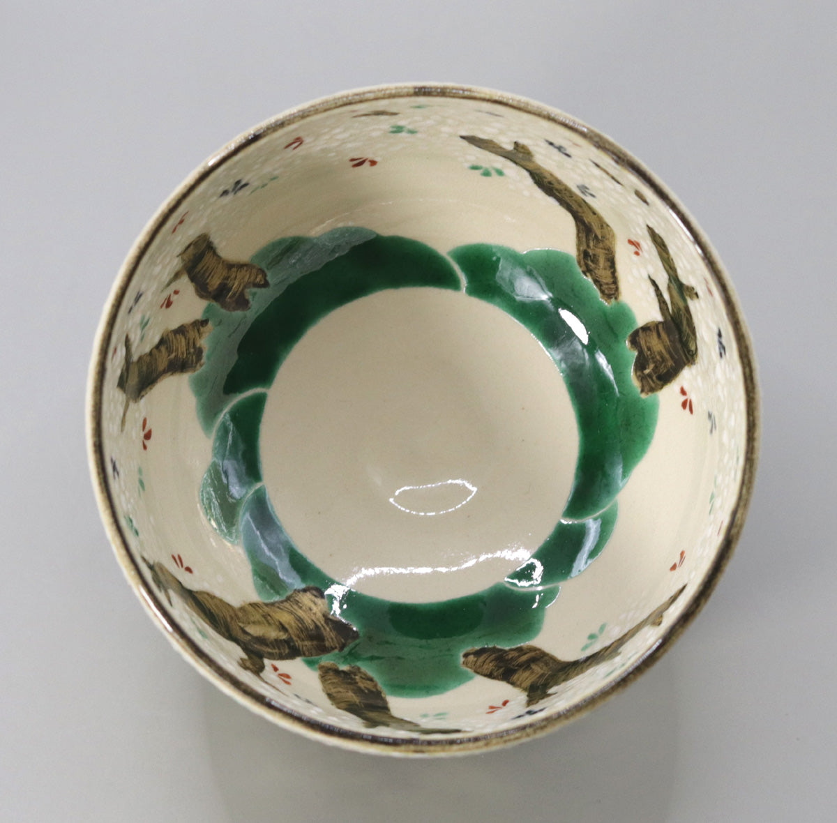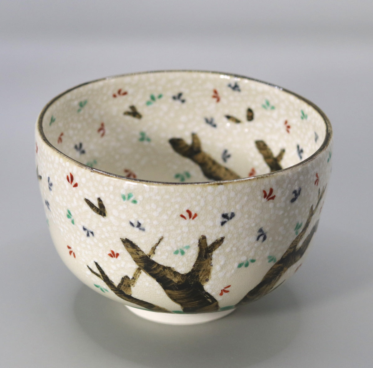 胴部中央に配された木肌は、鉄絵具で一気呵成に描かれた躍動的な筆致が特徴です。若枝が空へ伸びる構図は、芽吹き始める早春の桜を思わせ、白泥の小花文様と相まって“咲き初む”瞬間をとらえています。外側に散る彩色は、緋色・藍・緑の極小花でアクセントを添えつつ、内側にも同じ吹付けが施され、茶を点てる最中にも桜吹雪が舞う情景を楽しむことができます。