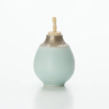 本作の上部には木栓(木の蓋)が設けられており、青白磁と銀彩という“冷たい光”の系譜に、木の温度が一滴差し込まれます。