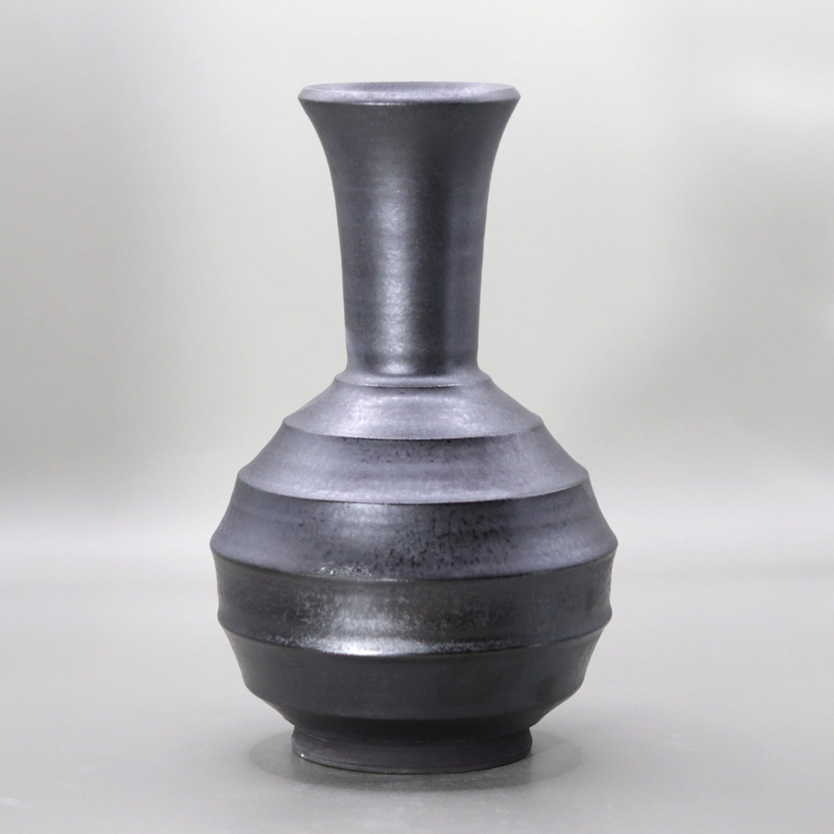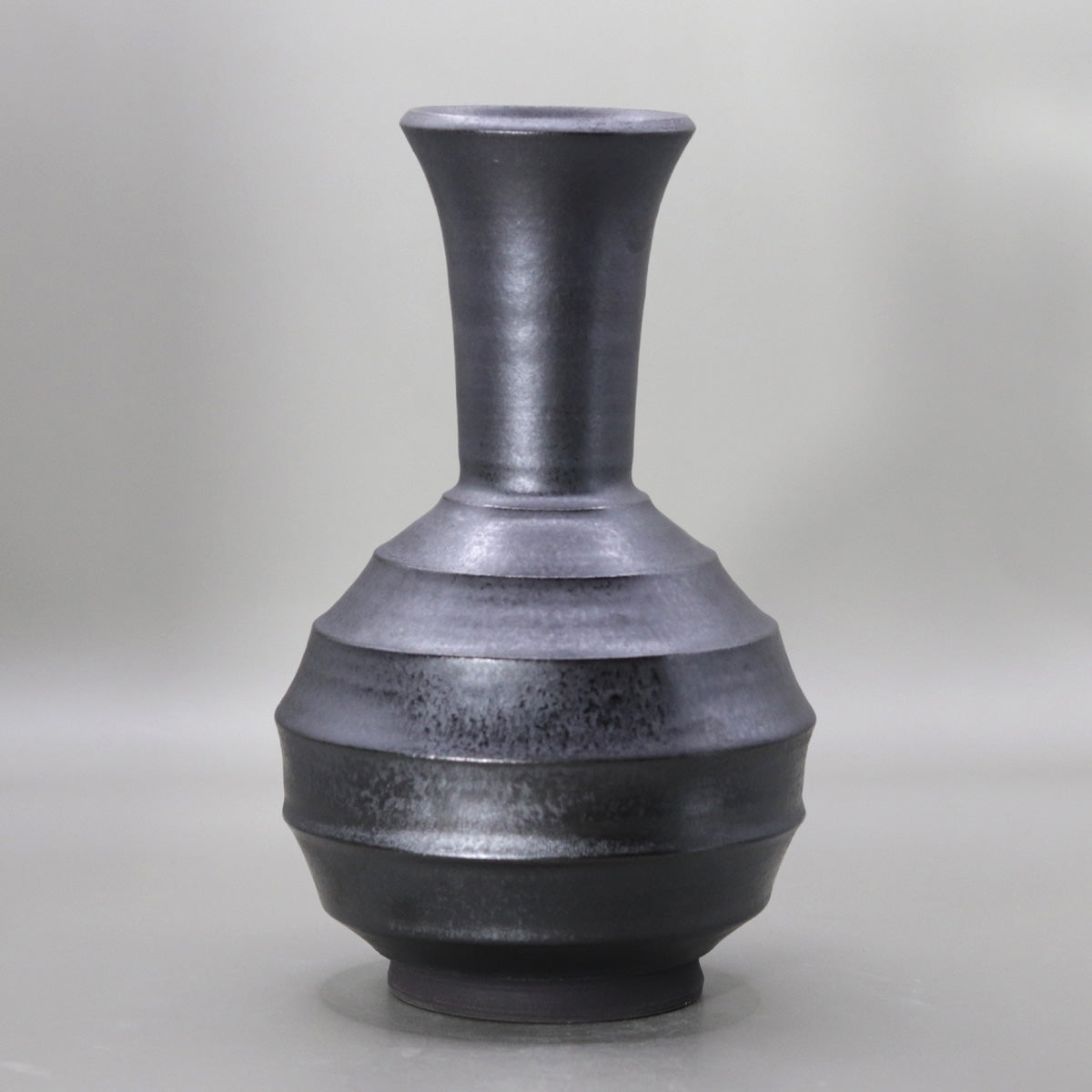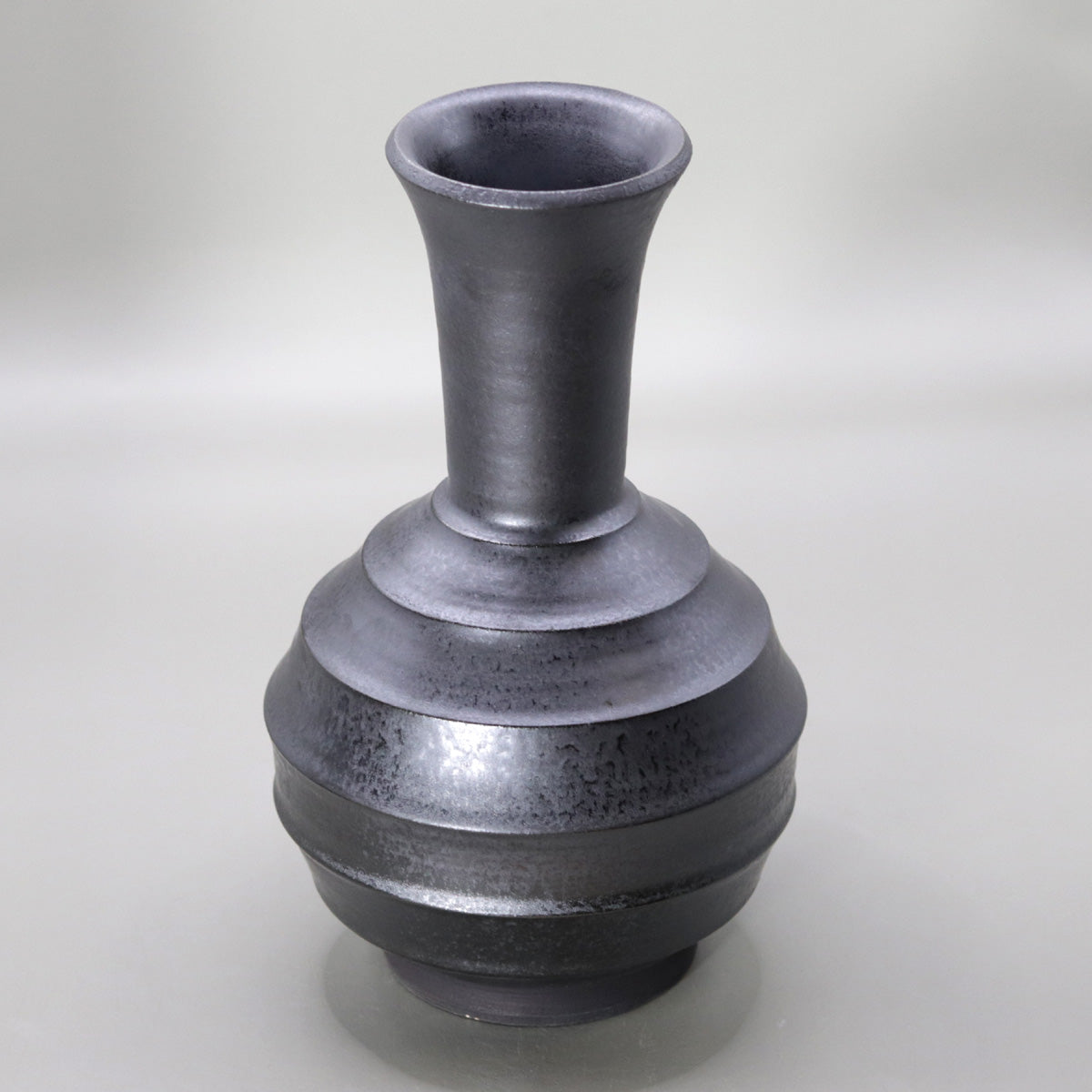 静かな闇を思わせる鉄釉の黒。そこに還元焼成で生まれた銀灰のきらめきと、墨を散らしたような窯変の斑調が交錯し、見る角度ごとに星雲のような光を返します。段ごとに切り替わる胴の輪郭は山の稜線を重ねたかのようで、細身に立ち上がる頸が花姿を凜と引き締めます。