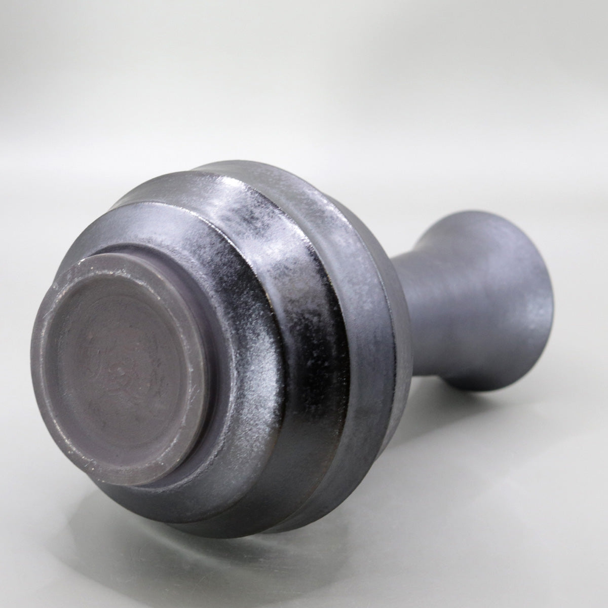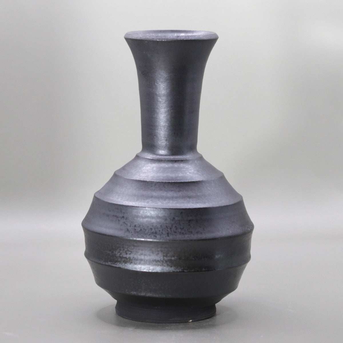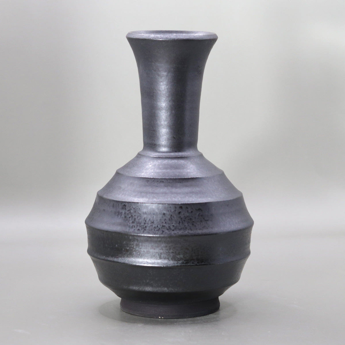 静かな闇を思わせる鉄釉の黒。そこに還元焼成で生まれた銀灰のきらめきと、墨を散らしたような窯変の斑調が交錯し、見る角度ごとに星雲のような光を返します。段ごとに切り替わる胴の輪郭は山の稜線を重ねたかのようで、細身に立ち上がる頸が花姿を凜と引き締めます。