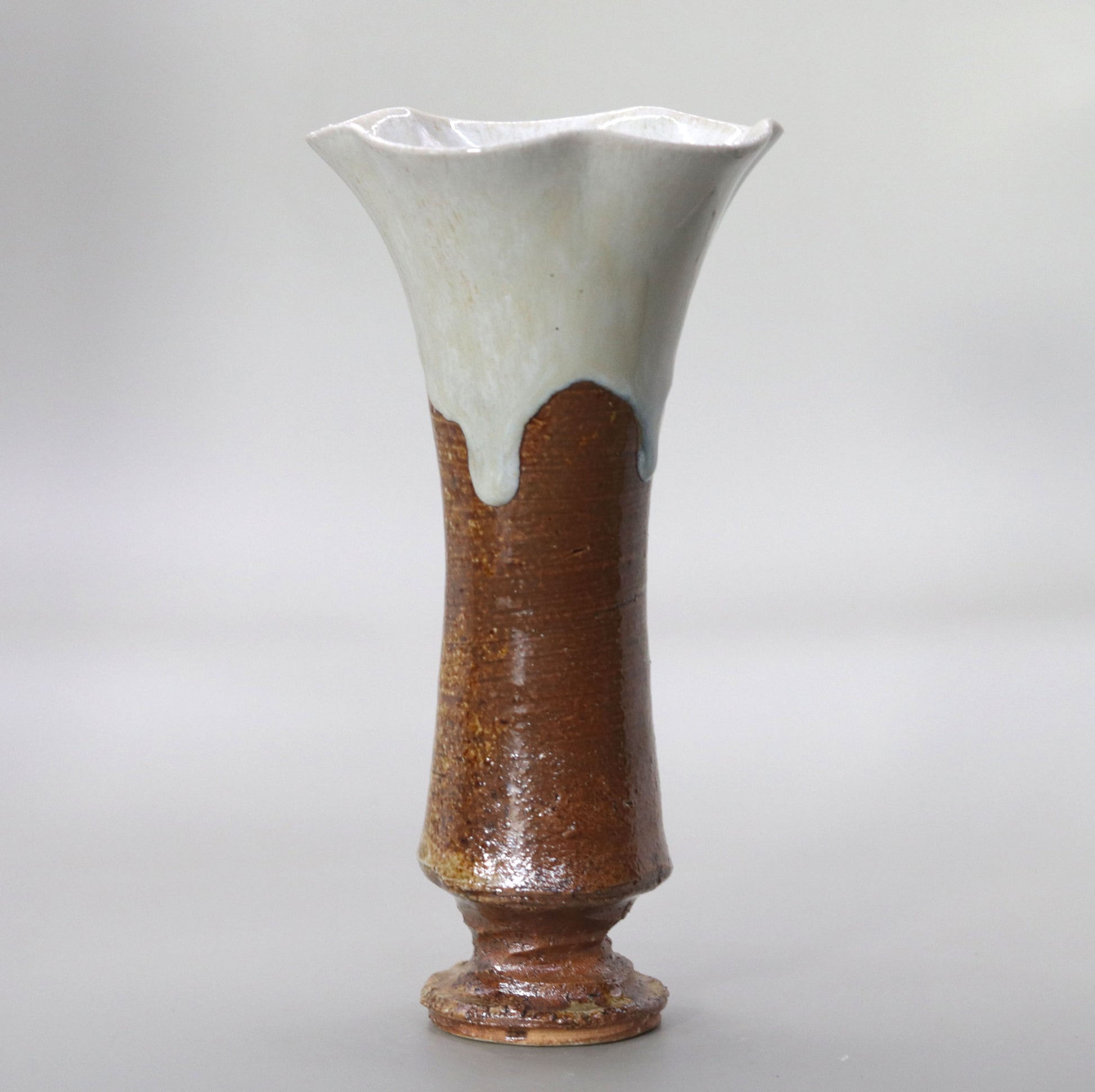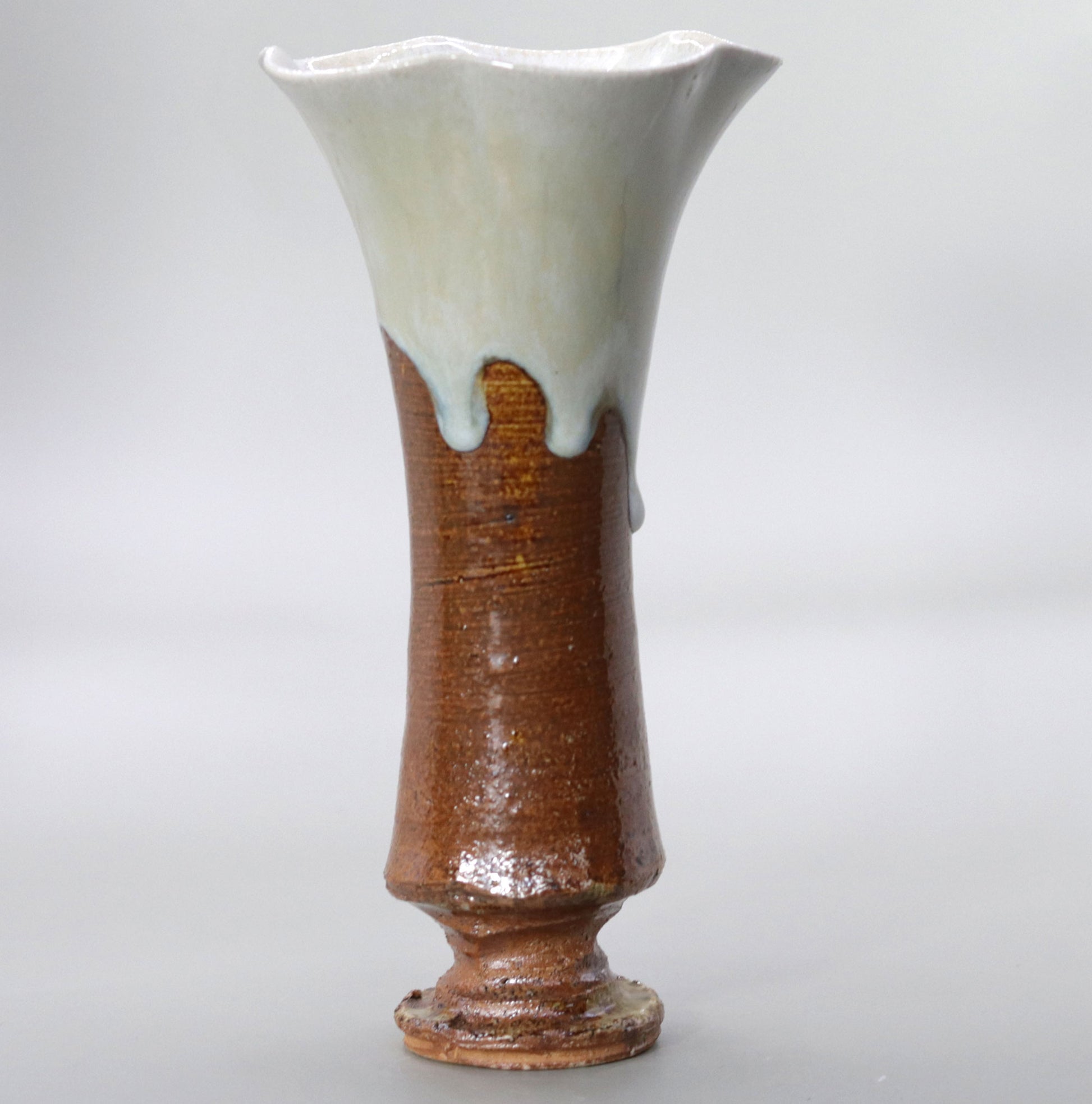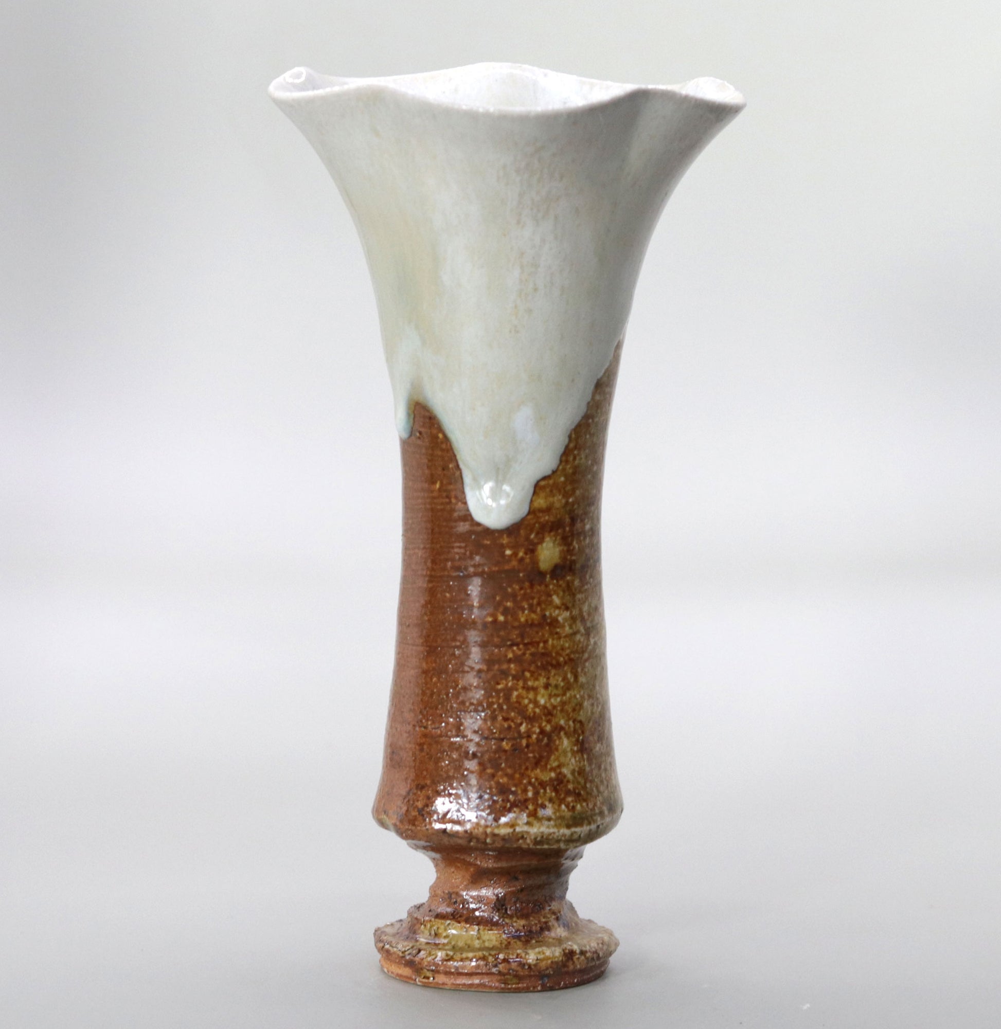尾西楽斎様が手掛けた「輪花花入」は、古典的な技法と現代的な感性が見事に調和した逸品です。この花入は、面取り技法を駆使して多面体を表現しており、見る角度によって異なる表情を楽しめるのが特徴です。置き方を変えるだけで、色の出具合が変化し、まるで異なる作品のように感じられる点が魅力的です。
