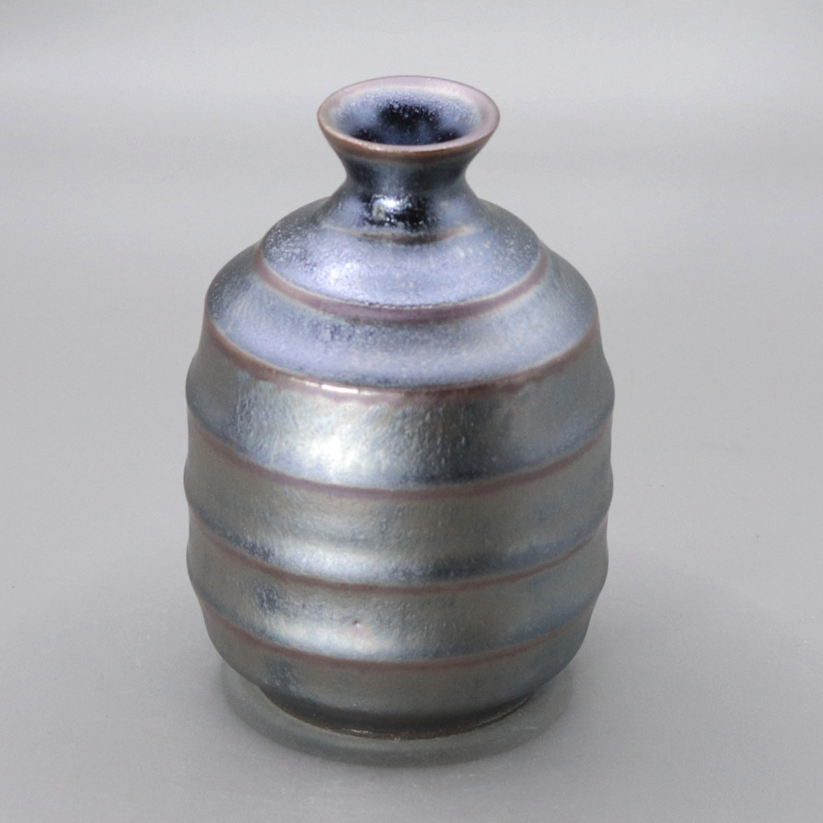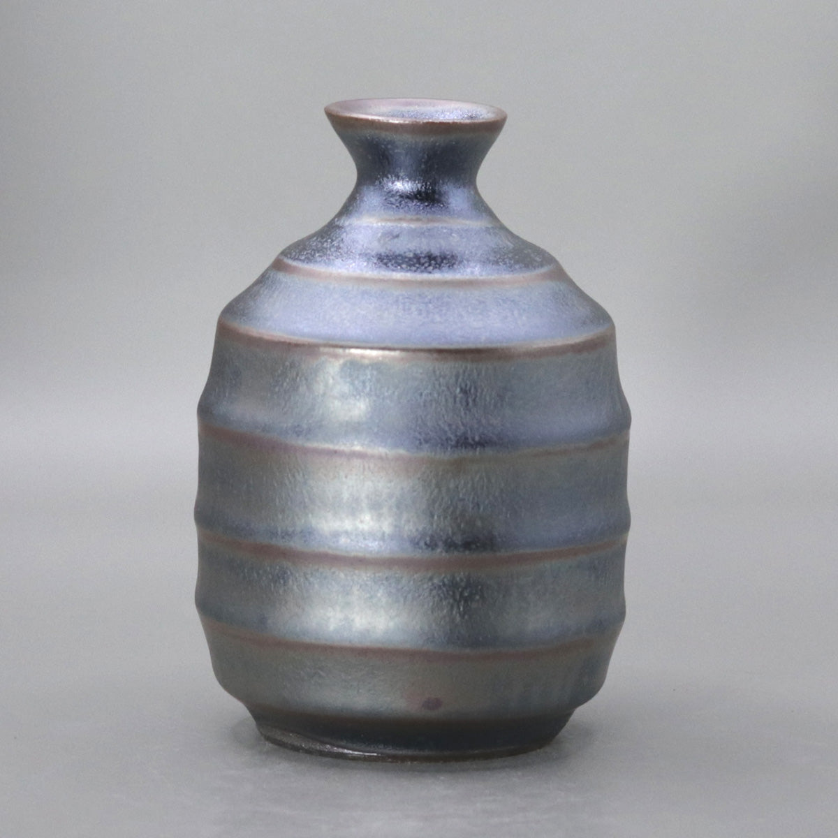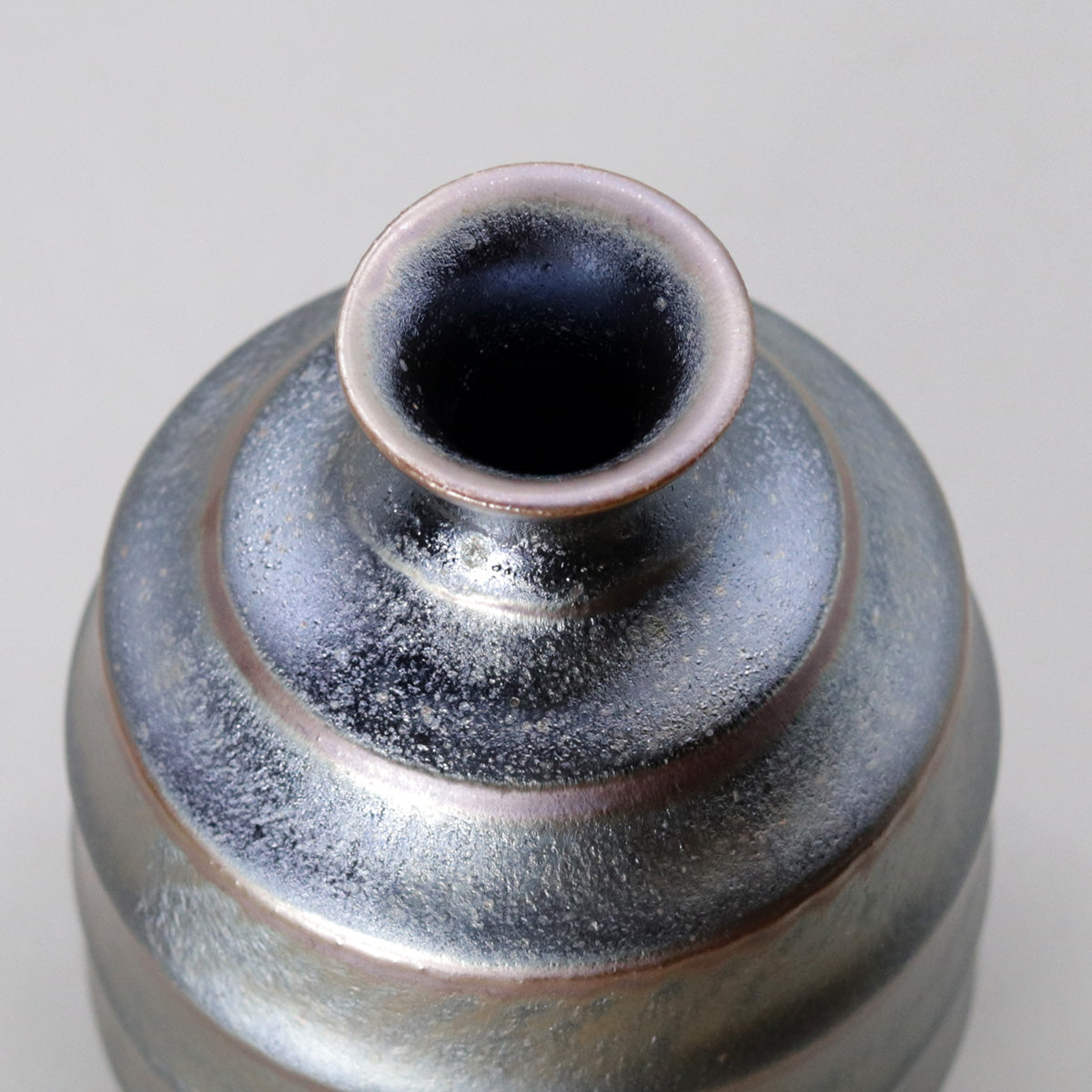 掌にすとんと収まる端正な徳利。宋代建盞ゆずりの天目釉が、黒瑠璃の奥で銀蒼に揺らめきます。胴をぐるりと取り巻く段削りは五層。節ごとに還元炎が残した薄紅の“火間”がほのかに現れ、山影に射す暁光を思わせます。口造りは品良く外反し、注ぎ切れの良さと手馴染みを両立。冷酒にも燗酒にも応える万能の一器です。