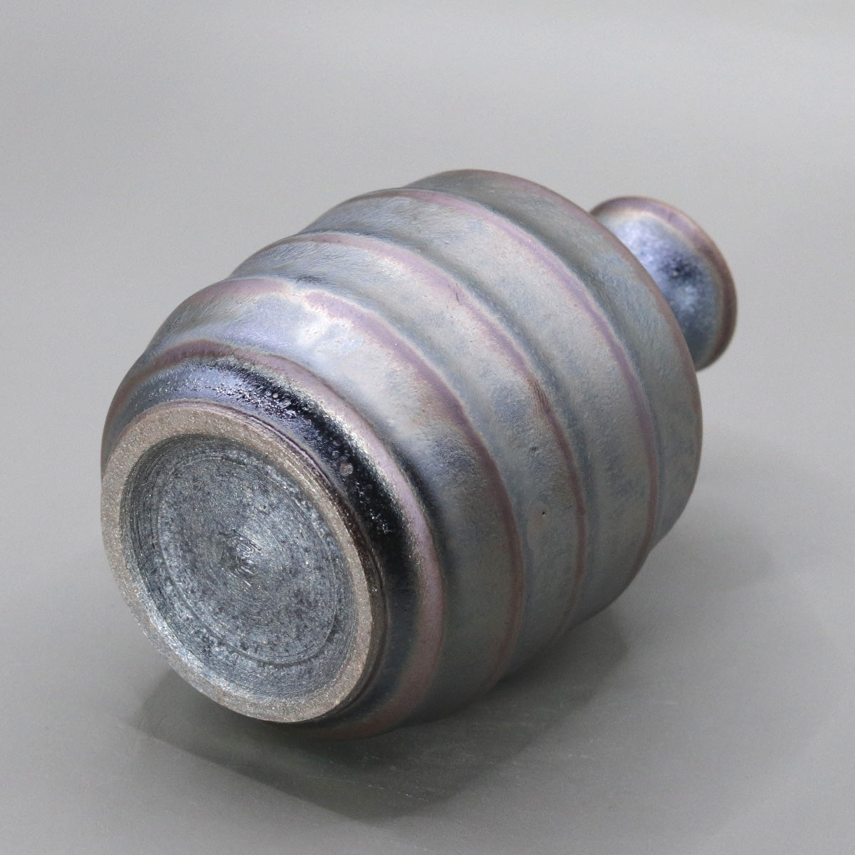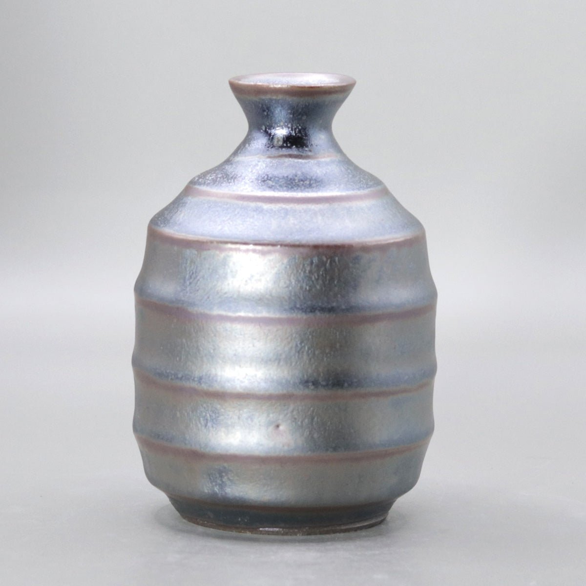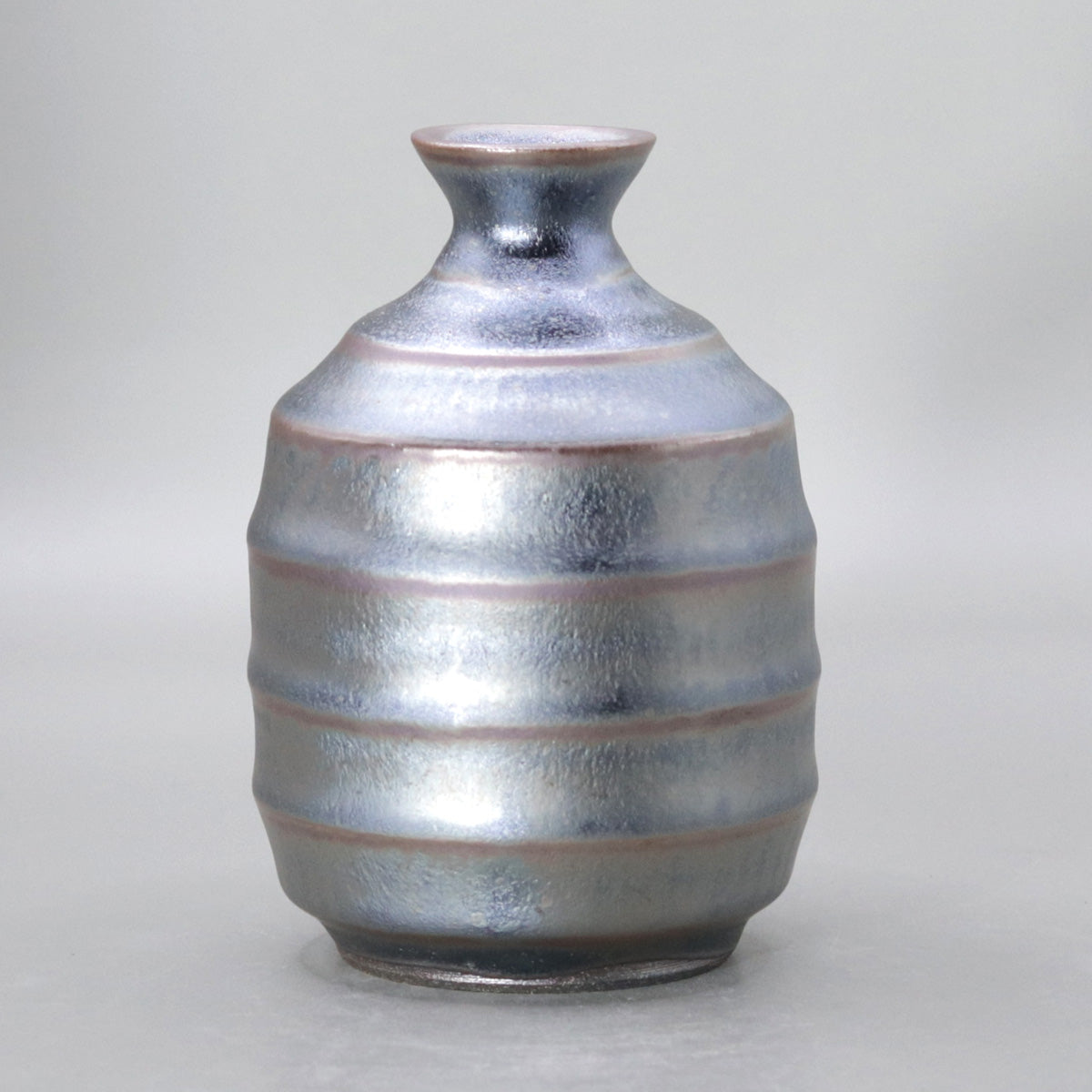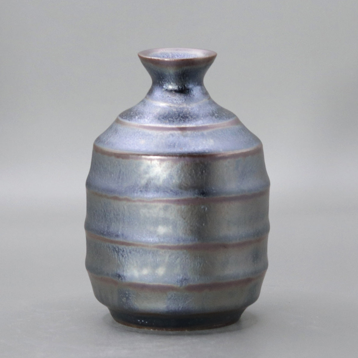 掌にすとんと収まる端正な徳利。宋代建盞ゆずりの天目釉が、黒瑠璃の奥で銀蒼に揺らめきます。胴をぐるりと取り巻く段削りは五層。節ごとに還元炎が残した薄紅の“火間”がほのかに現れ、山影に射す暁光を思わせます。口造りは品良く外反し、注ぎ切れの良さと手馴染みを両立。冷酒にも燗酒にも応える万能の一器です。