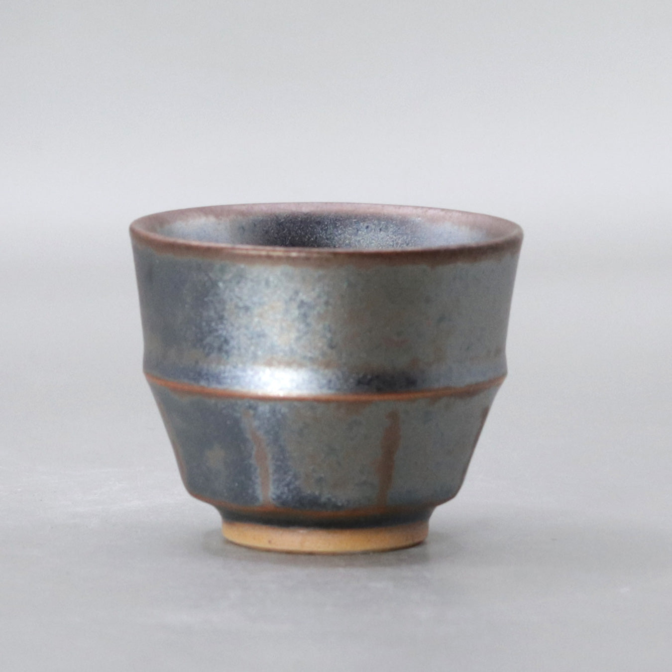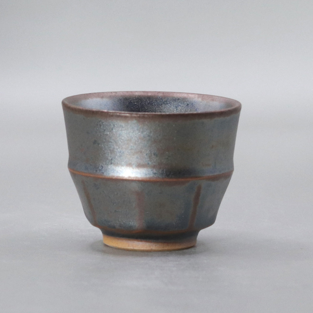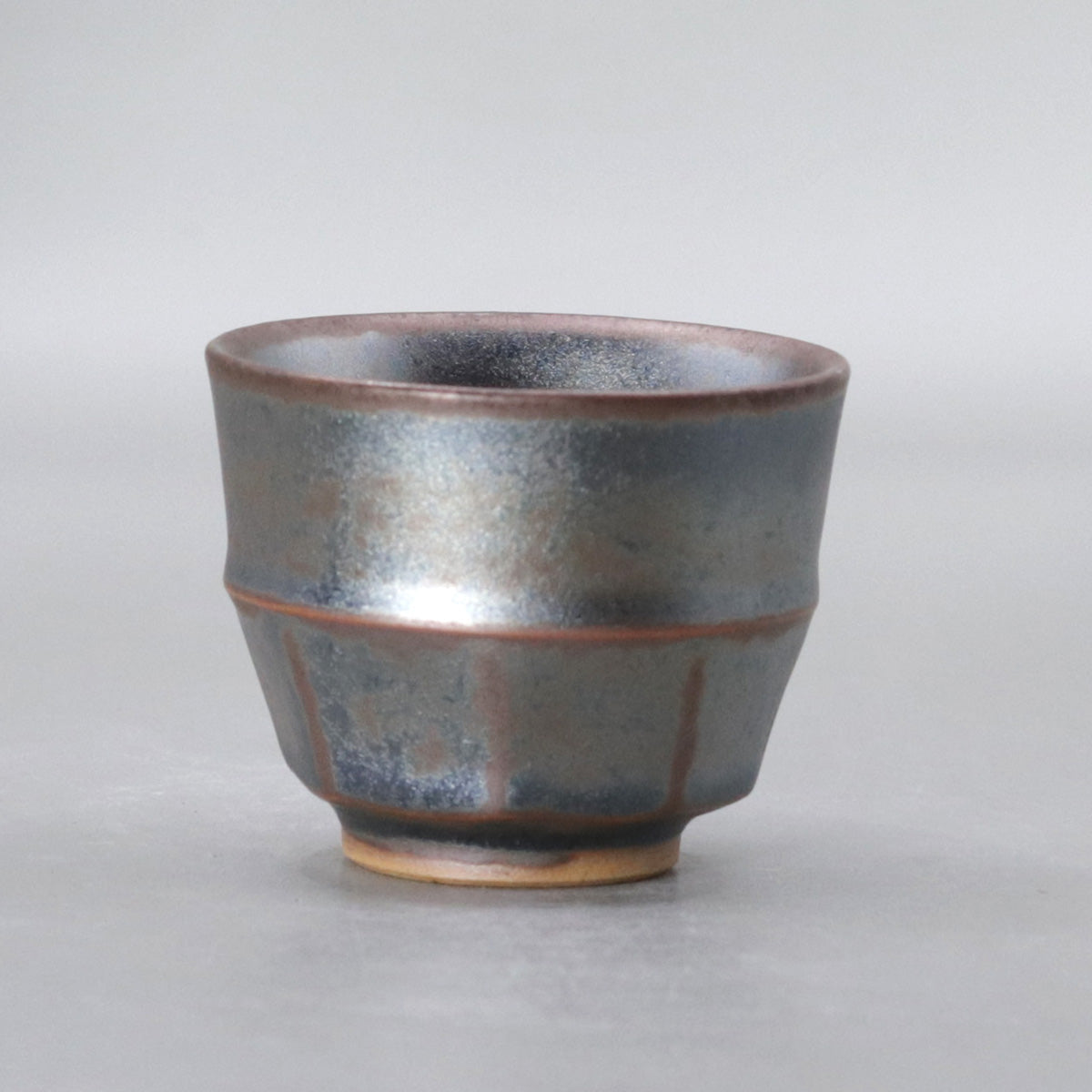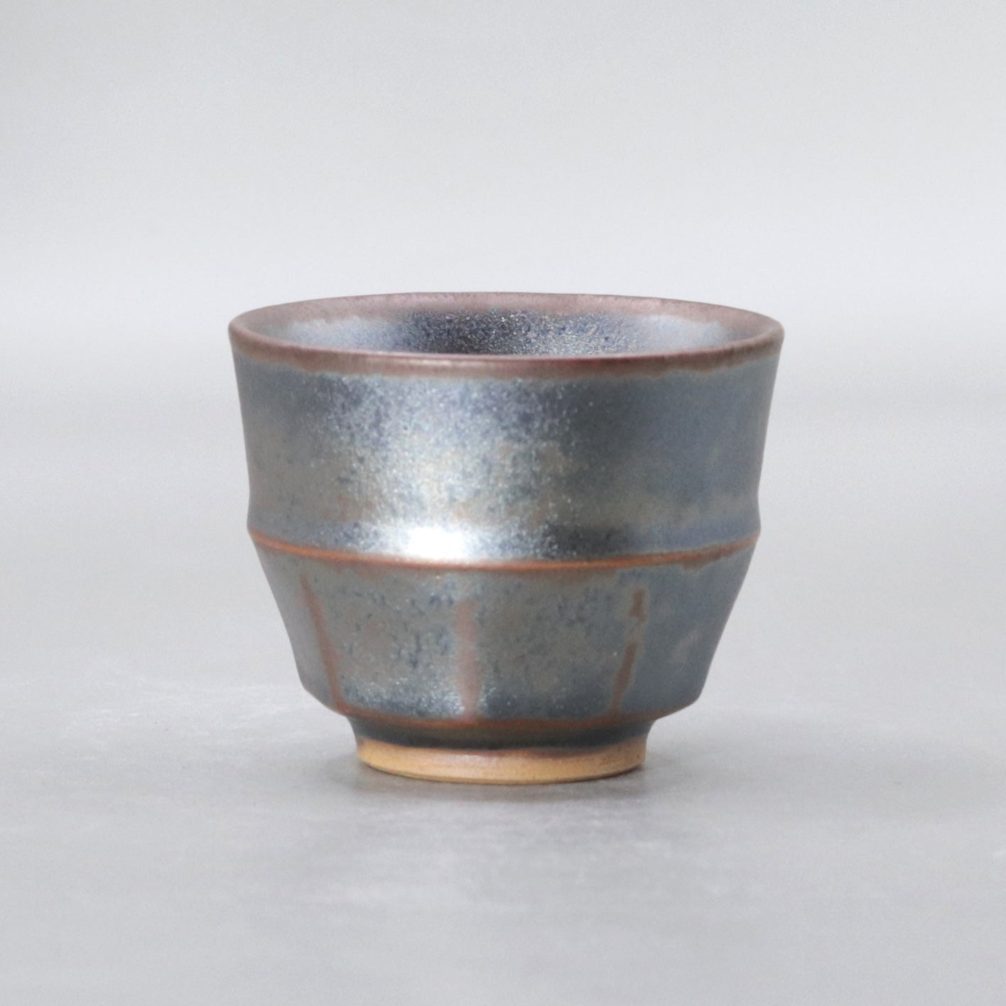 黒みを帯びた鉄釉の深層に、青銀の光と赤紫の火間(ひま)がにじむ小さな盃。直線的に絞った下半と、すっと立ち上がる上半を一段で切り替え、すり鉢のような内壁が香気を抱きとめます。手取りはわずかに荒れた梨地—指腹にさらりと触れる心地。酒を注ぐと闇がいっそう深まり、わずかな灯りを銀砂が受けて淡い星雲を描きます。