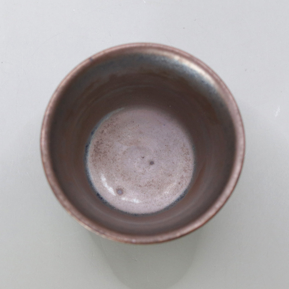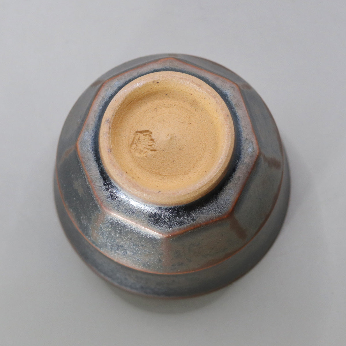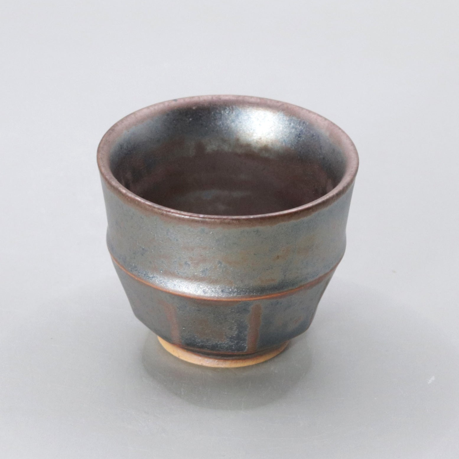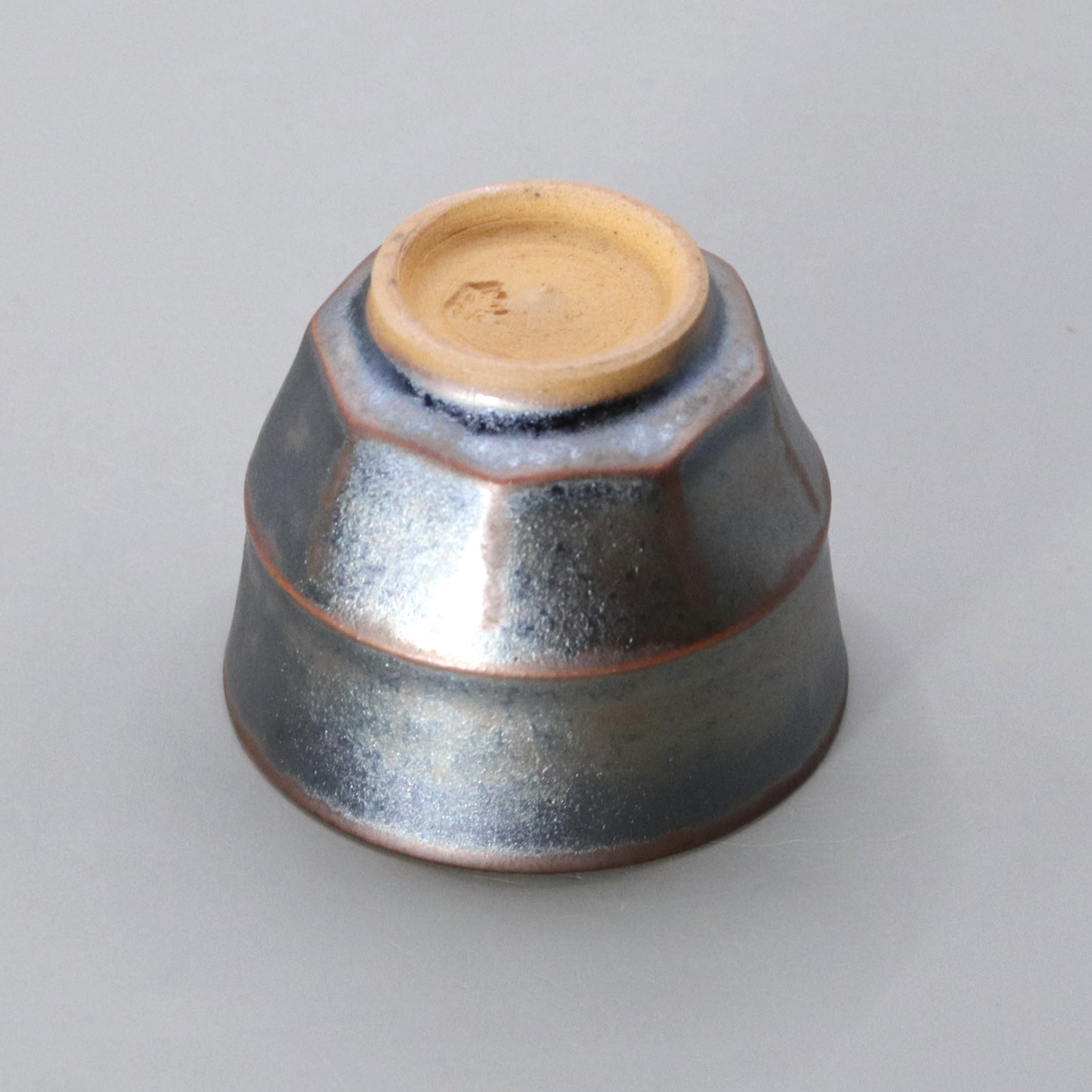 黒みを帯びた鉄釉の深層に、青銀の光と赤紫の火間(ひま)がにじむ小さな盃。直線的に絞った下半と、すっと立ち上がる上半を一段で切り替え、すり鉢のような内壁が香気を抱きとめます。手取りはわずかに荒れた梨地—指腹にさらりと触れる心地。酒を注ぐと闇がいっそう深まり、わずかな灯りを銀砂が受けて淡い星雲を描きます。