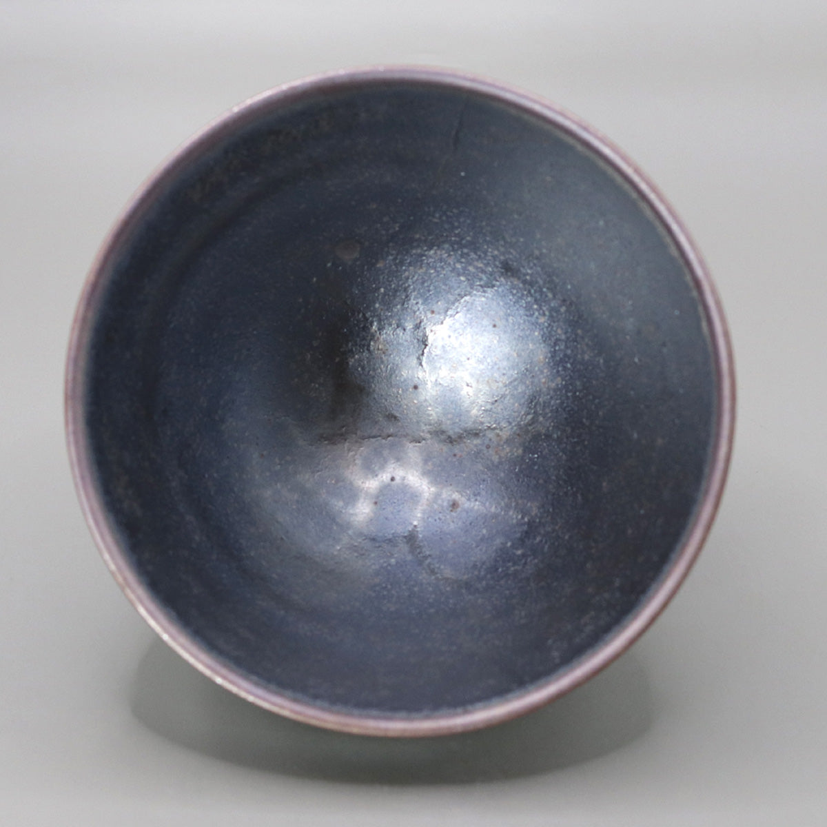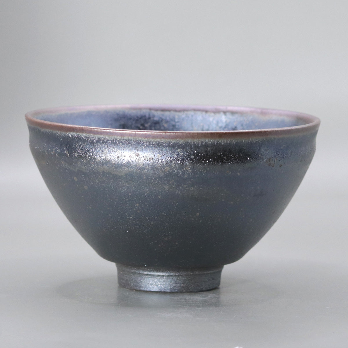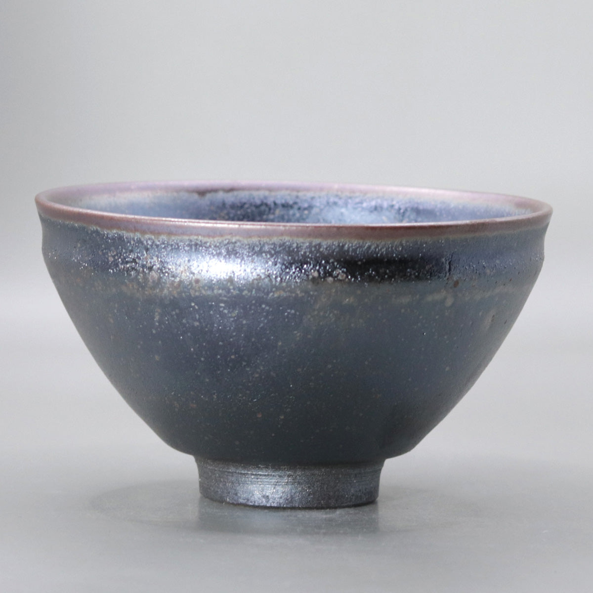 還元焼成がもたらす口縁の赤紫は、闇に差し込む薄明のような温度感を帯びています。抑えられた彩度の紫紅が黒釉に柔らかなアクセントを与え、茶席の灯りの下でほのかな余韻を演出します。