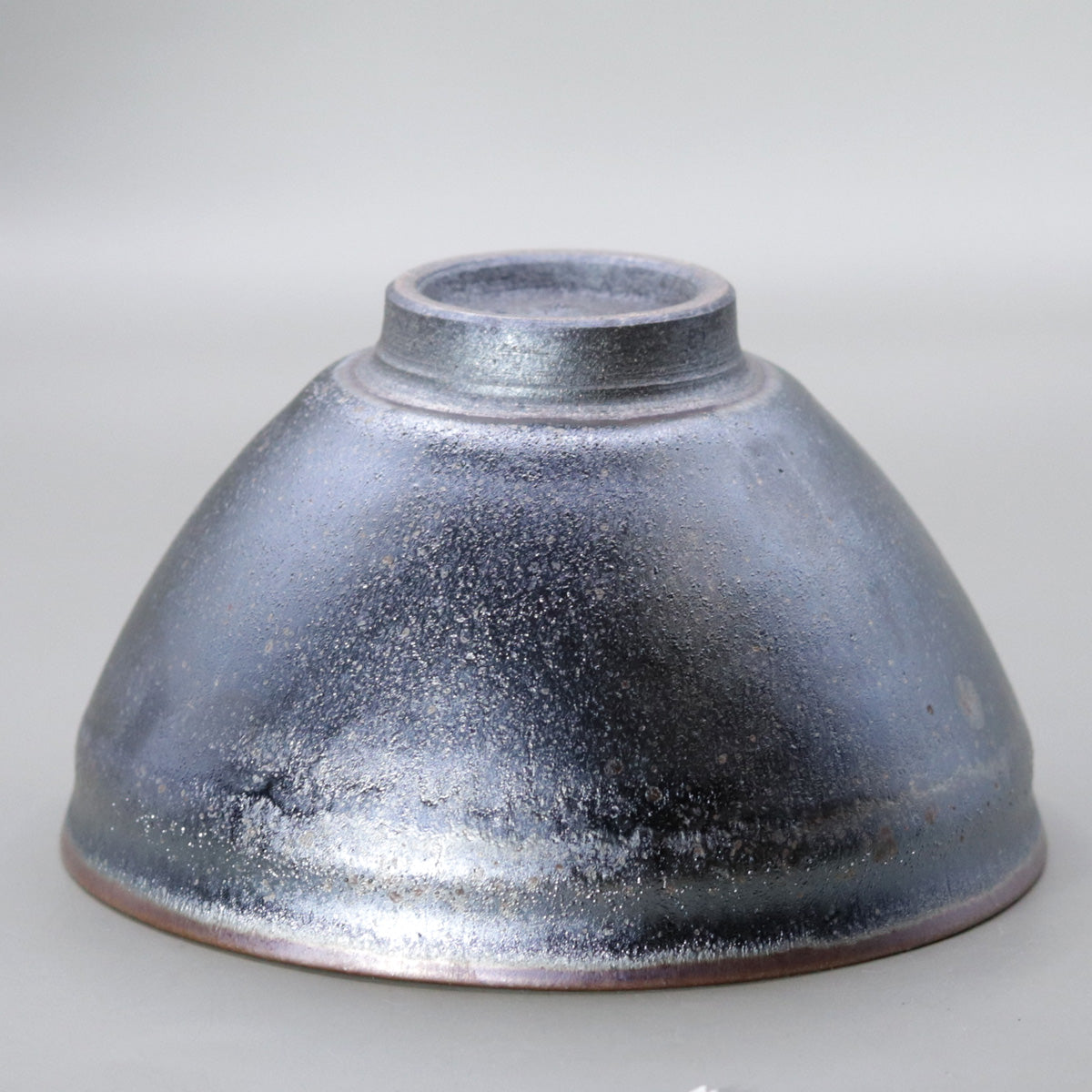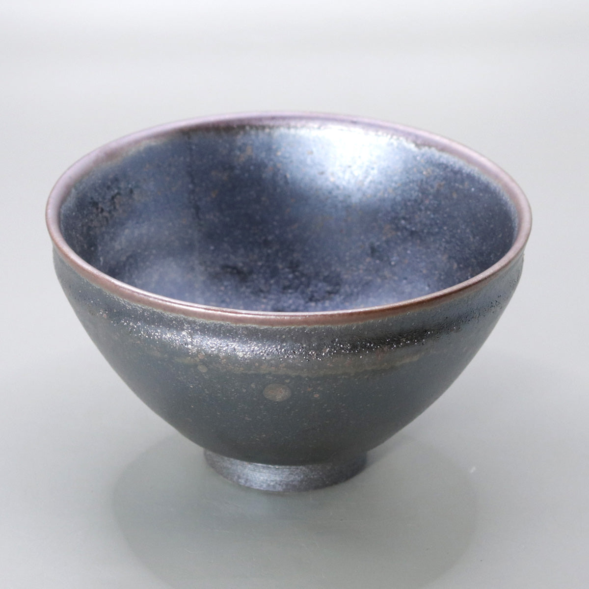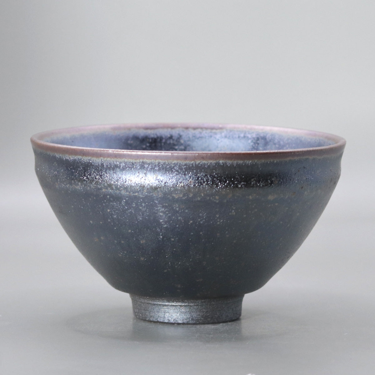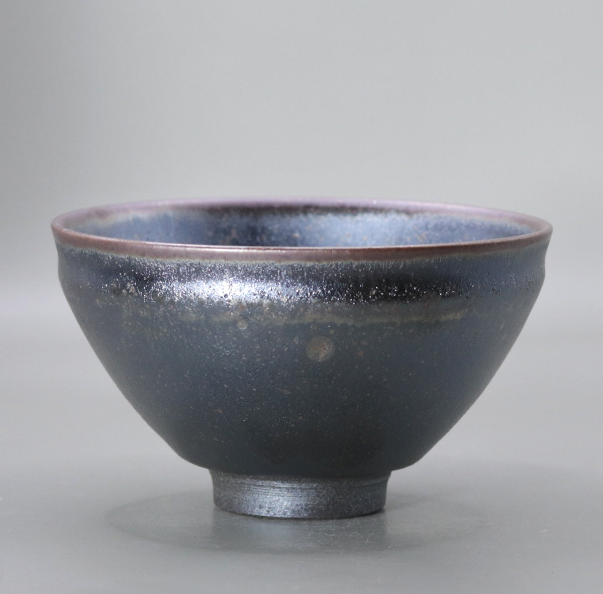 還元焼成がもたらす口縁の赤紫は、闇に差し込む薄明のような温度感を帯びています。抑えられた彩度の紫紅が黒釉に柔らかなアクセントを与え、茶席の灯りの下でほのかな余韻を演出します。