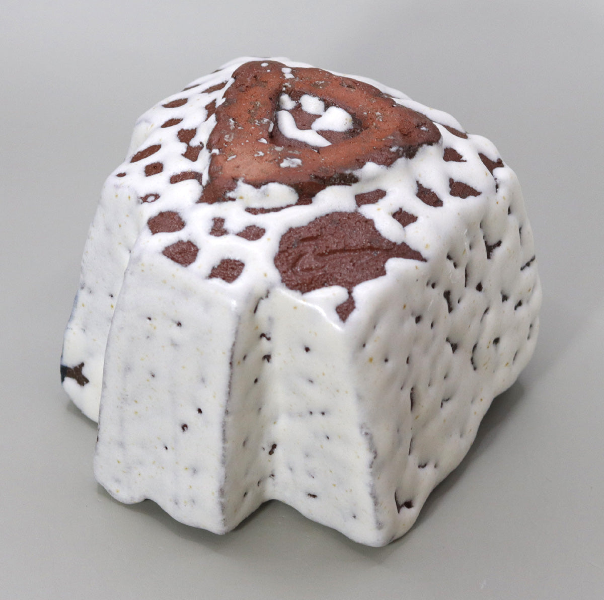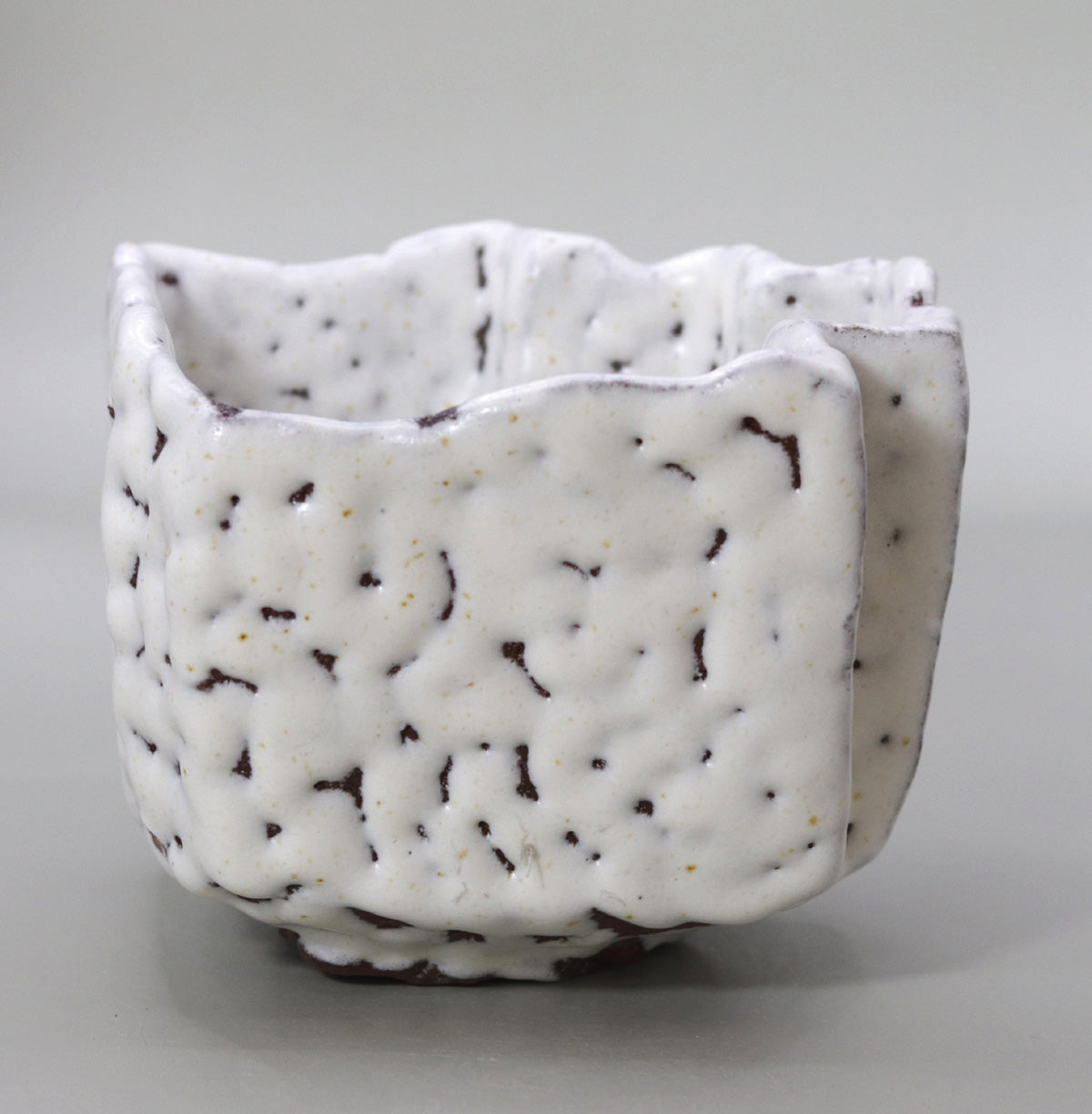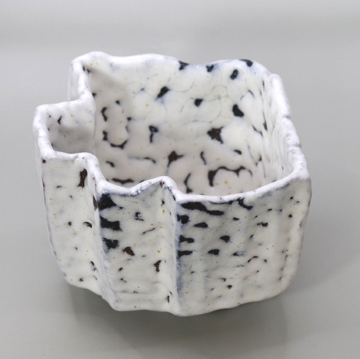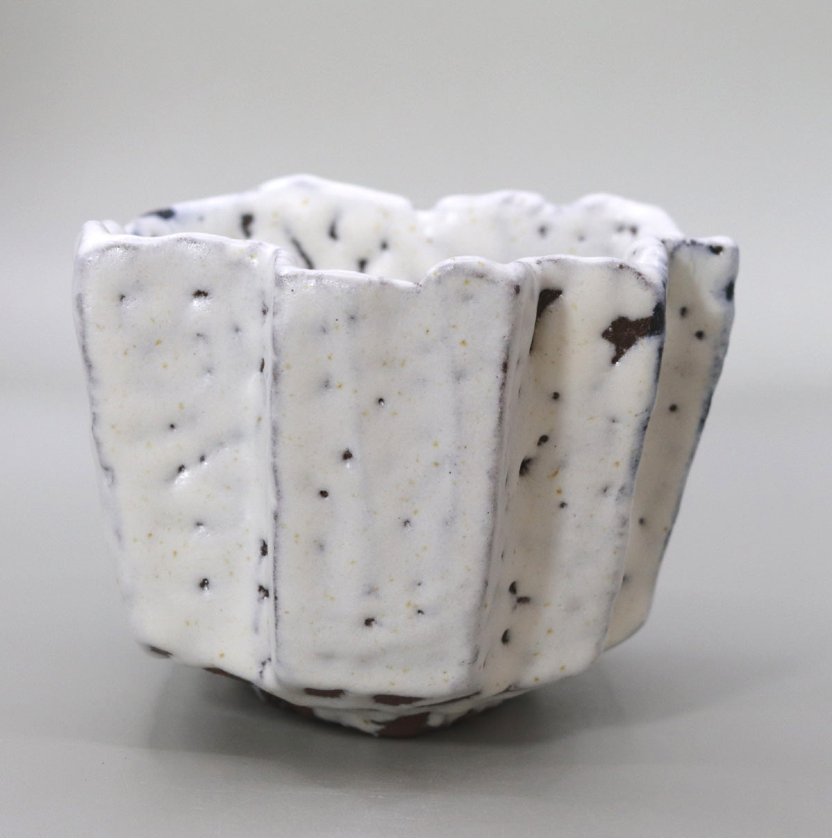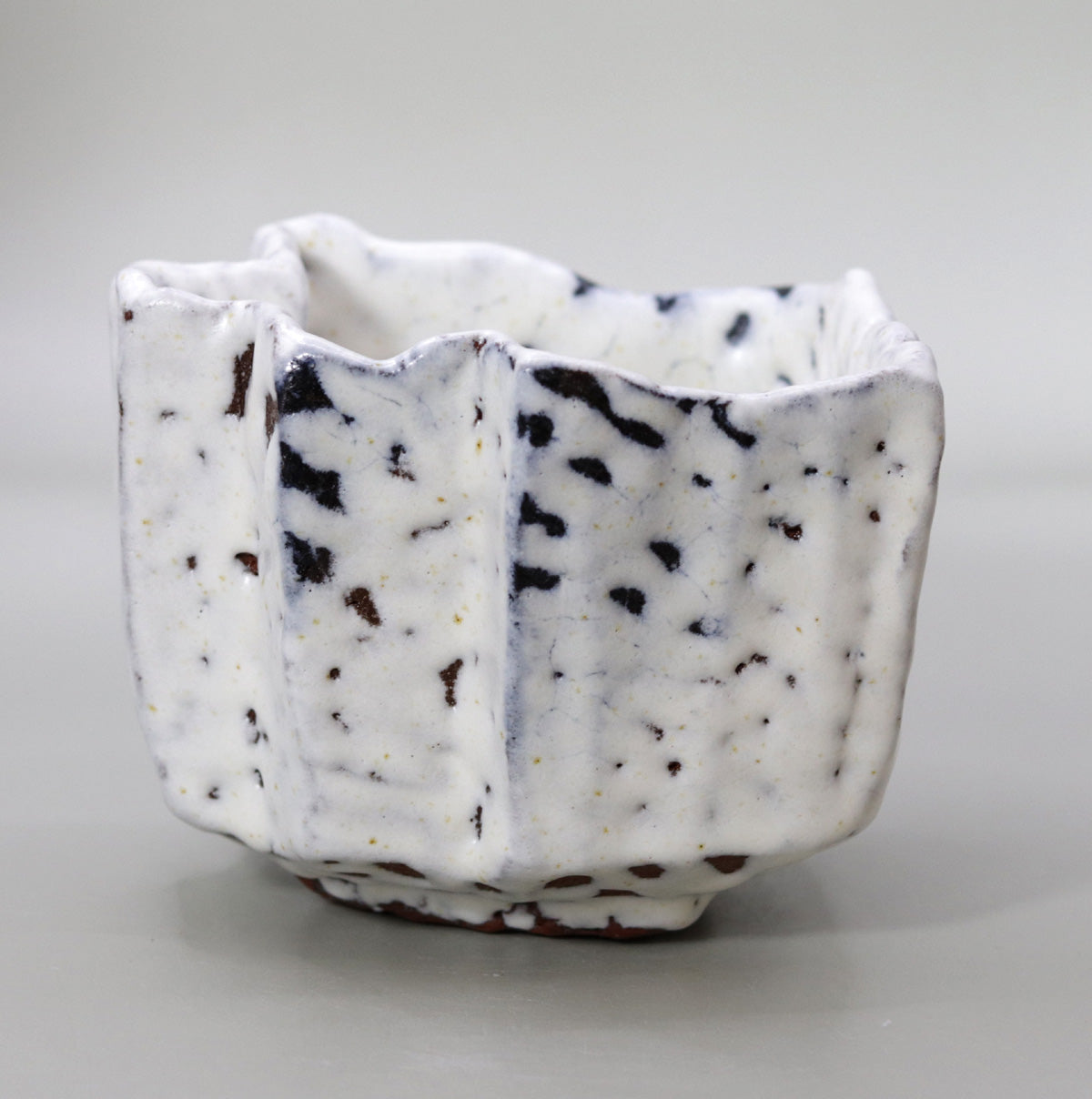 本作は、正方形を基調としながらも、外壁に六つの縦稜を設けた立体的な造形が大きな特徴です。稜線は鋭さを抑え、緩やかな曲面でつながっているため、視覚的な端正さと手取りの柔らかさが両立しています。器を回すごとに光と影が交互に現れ、茶席の静かな照明下では、雪原に立ち並ぶ小峯の連なりを思わせる陰影が浮かび上がります。