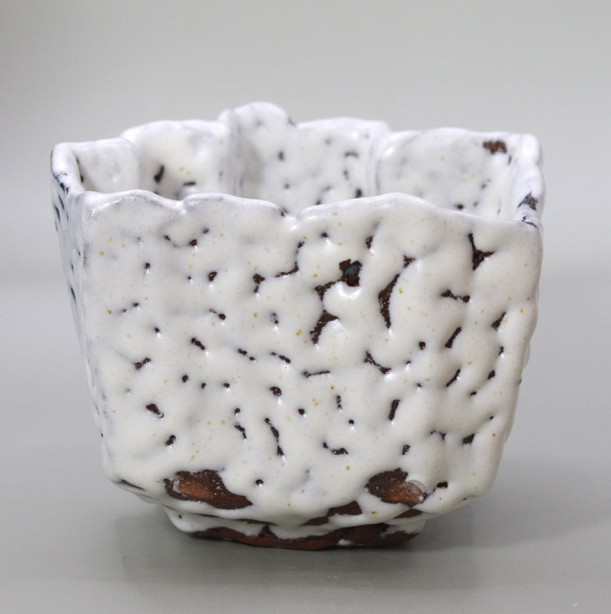 素地には鉄分を多く含む丹波産の荒土が用いられ、釉の薄い部分から赤褐色の粒子がのぞくことで、白釉の静けさに温かな呼吸を与えています。底部には軽い釉溜まりが見られ、釉薬と土が高温で融け合う瞬間を凝縮したような豊かな表情を添えています。