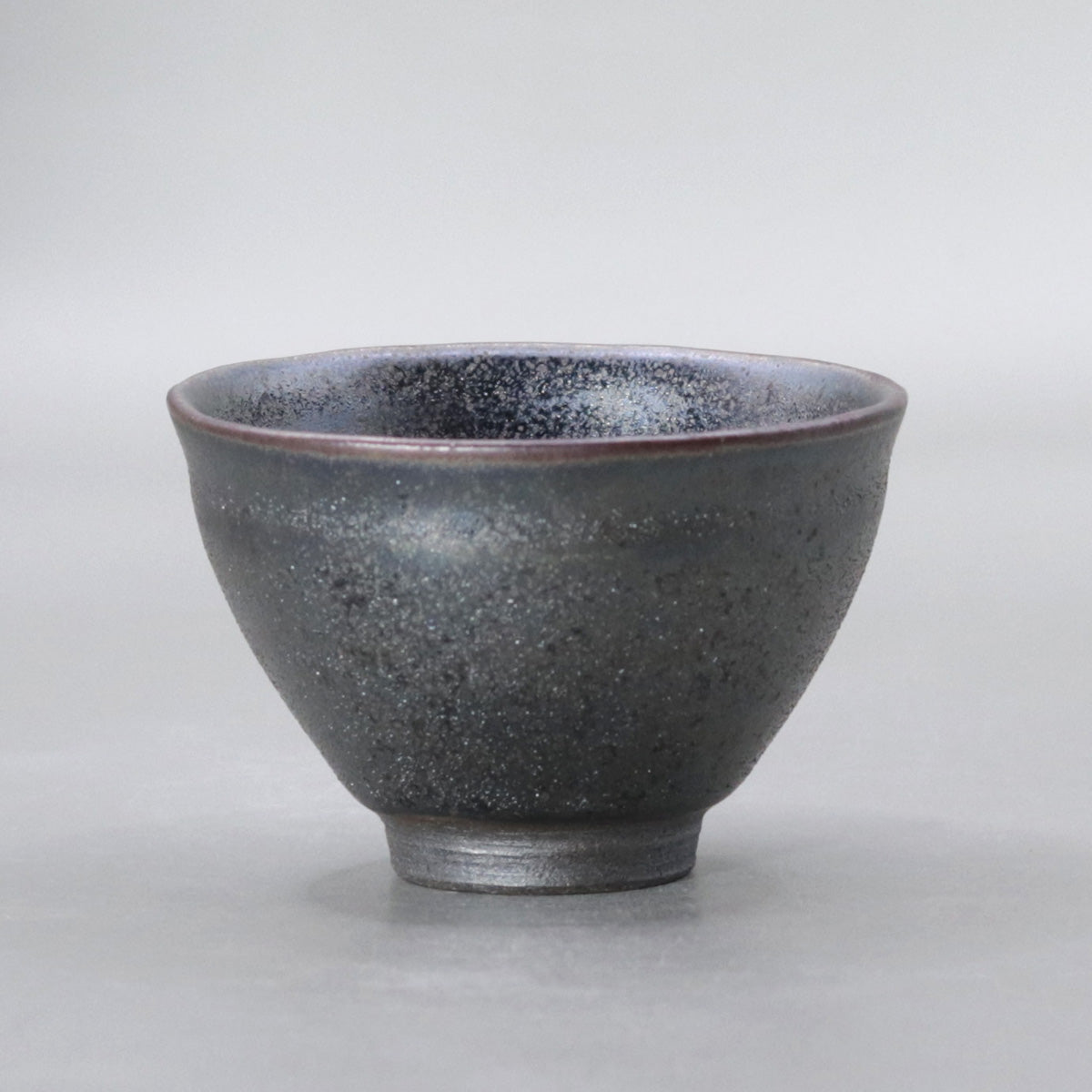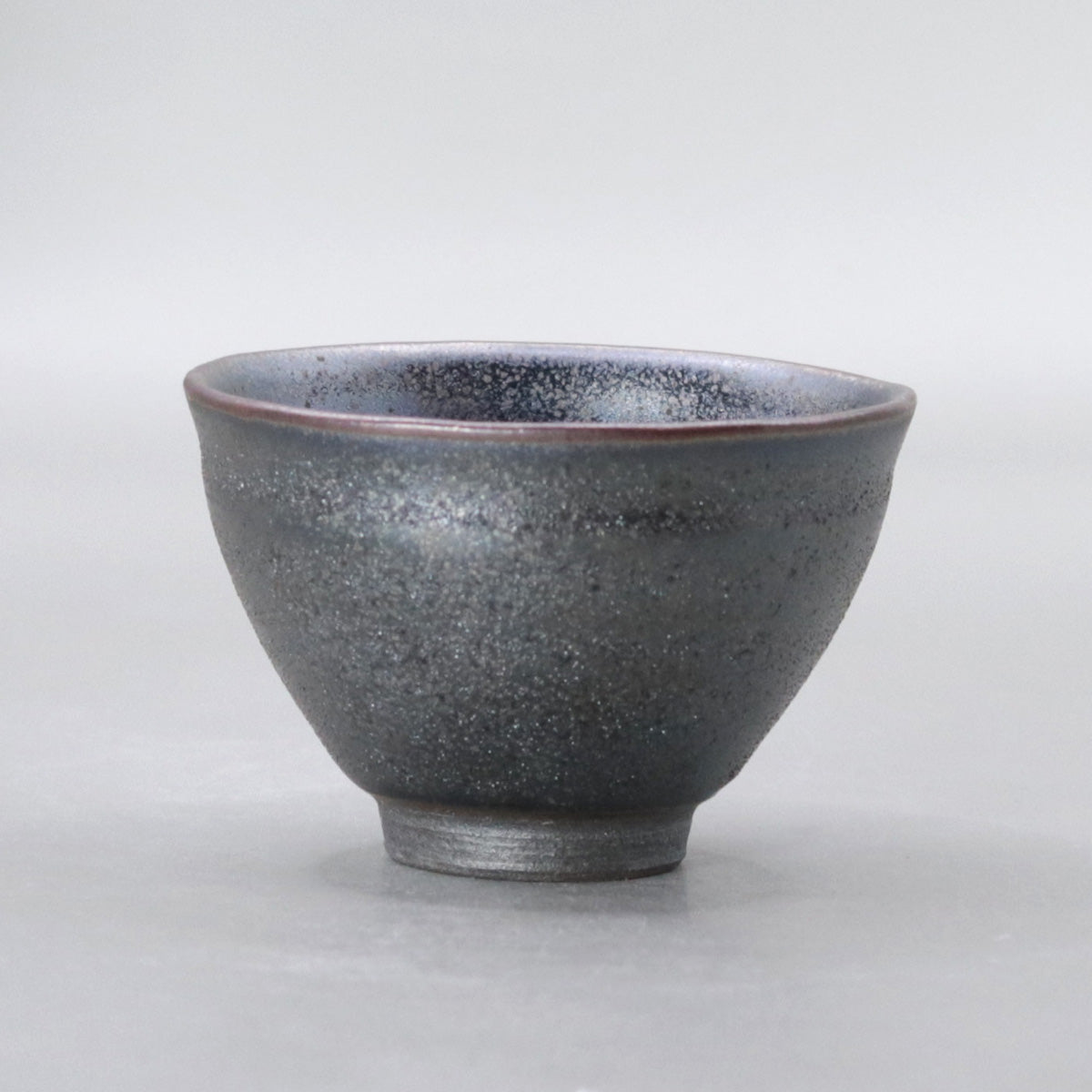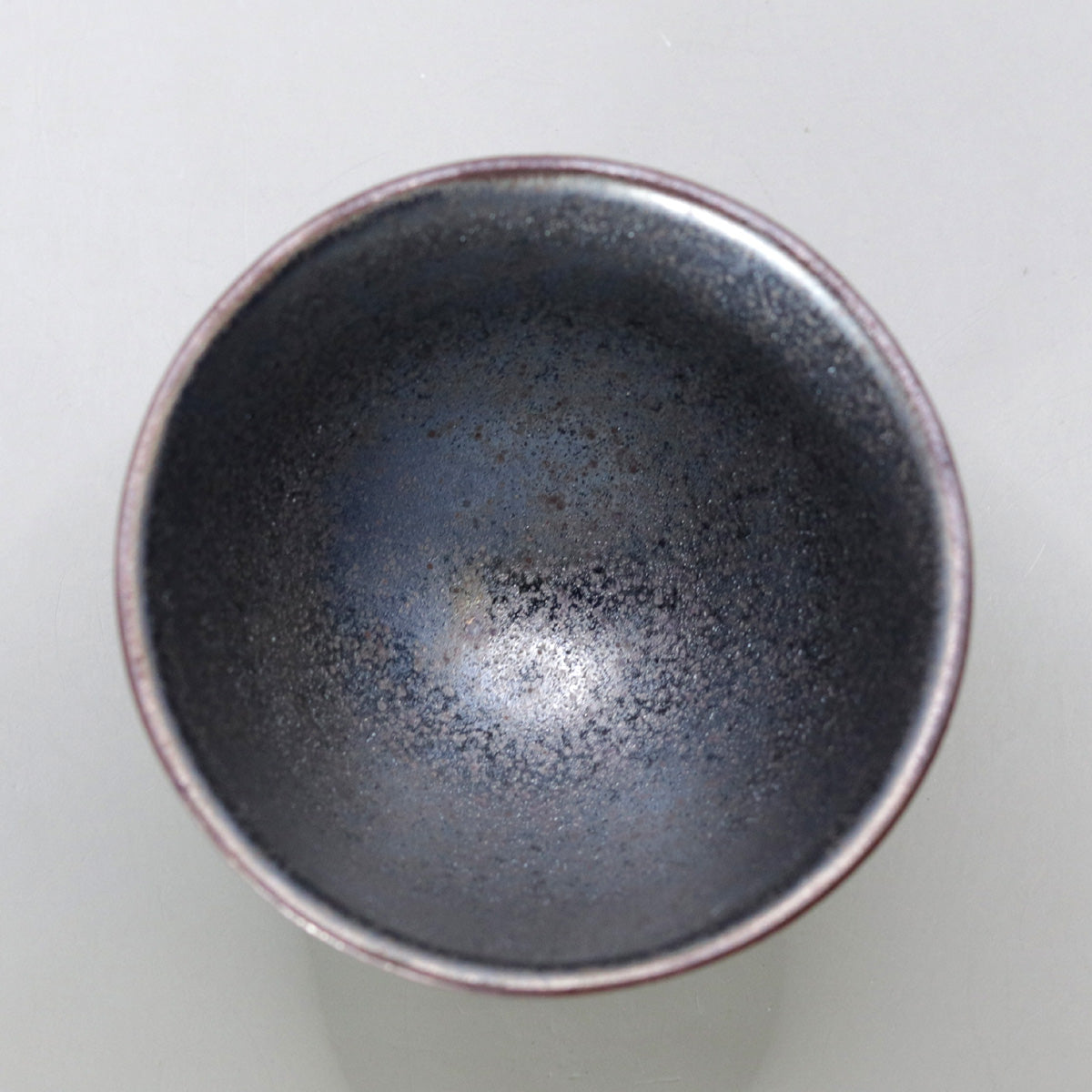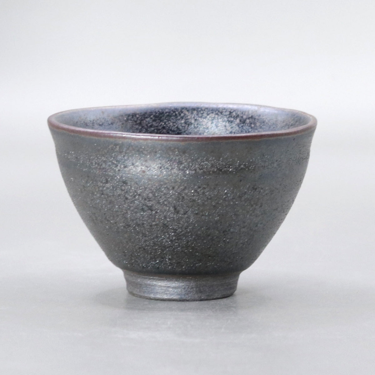 本作は、京都・宇治炭山に窯を構える岡田優様が手掛けた天目釉酒盃です。やや腰の張った端正な器形に、鋼色の黒地と銀灰色の油滴結晶が重なり合い、夜空に舞う微星のような景観を生み出しています。口縁にはほのかな緋色(ひいろ)がにじみ、闇の中に潜む温かみを静かに示唆いたします。