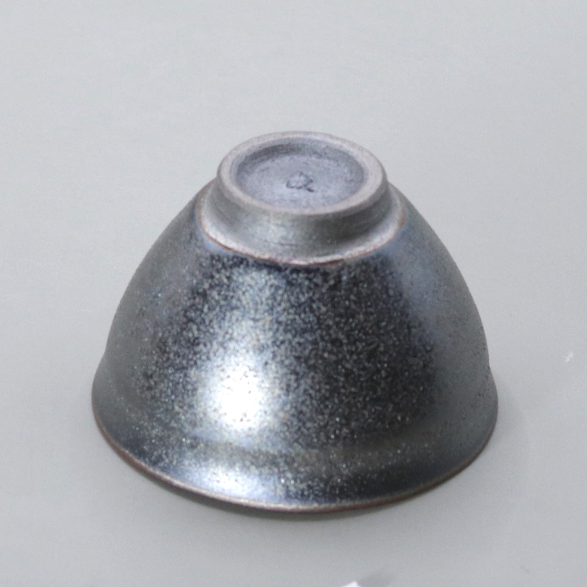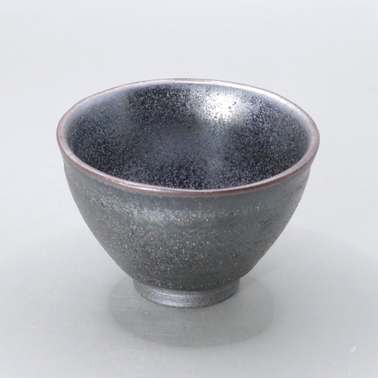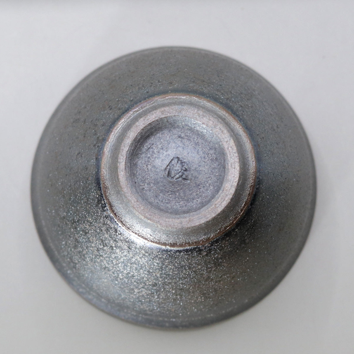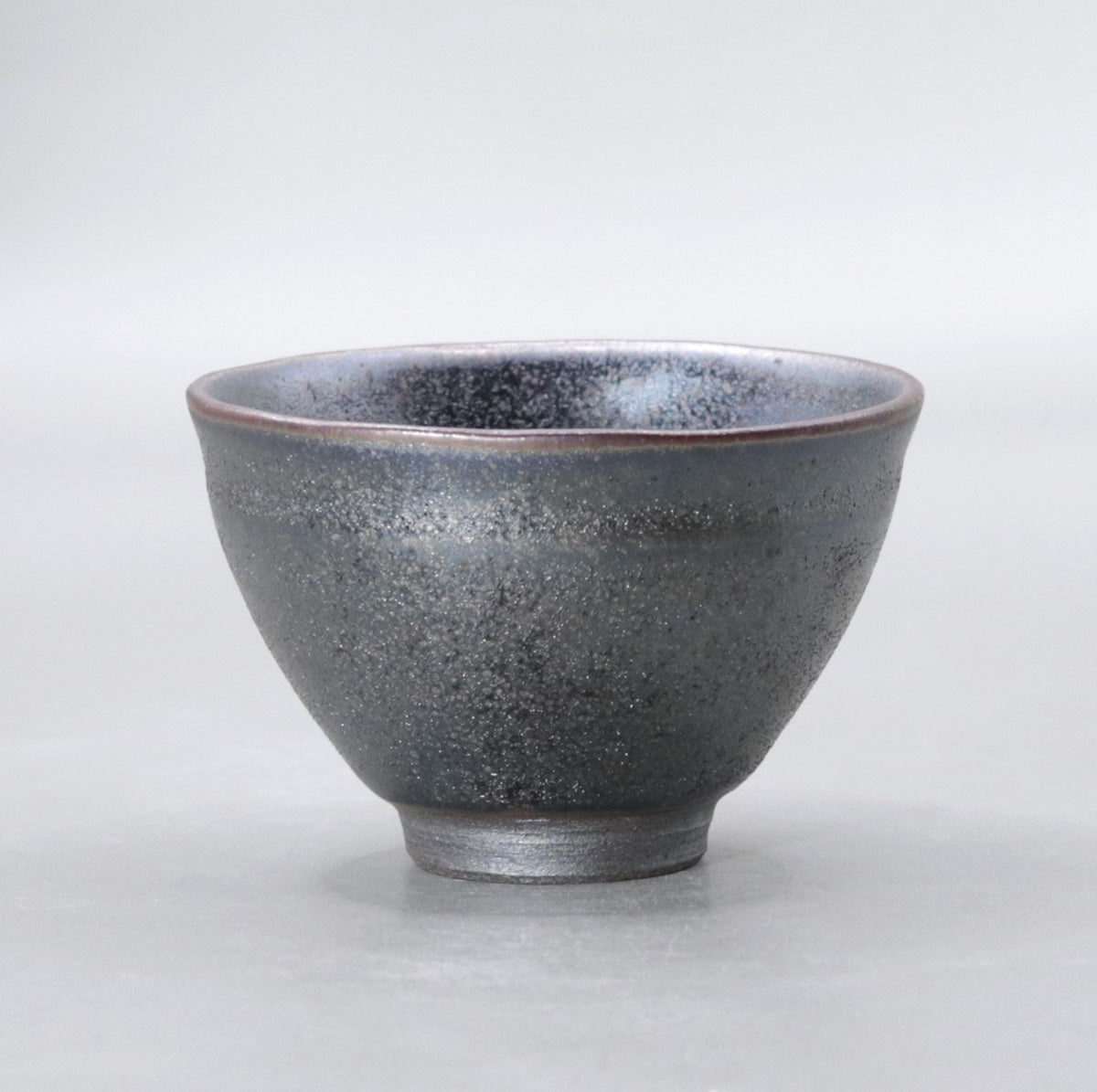 本作は、京都・宇治炭山に窯を構える岡田優様が手掛けた天目釉酒盃です。やや腰の張った端正な器形に、鋼色の黒地と銀灰色の油滴結晶が重なり合い、夜空に舞う微星のような景観を生み出しています。口縁にはほのかな緋色(ひいろ)がにじみ、闇の中に潜む温かみを静かに示唆いたします。